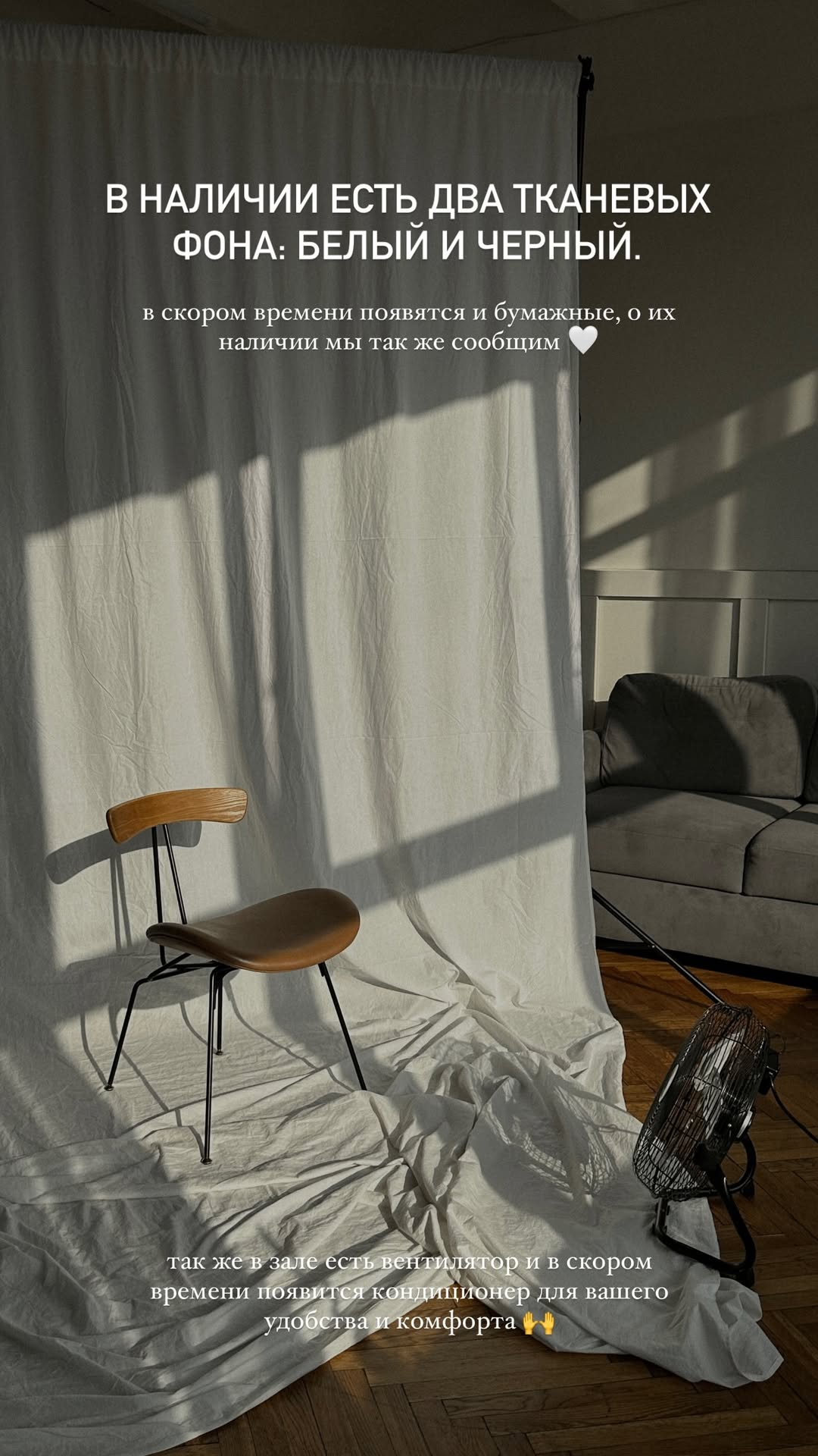 • тканевые фоны (белый, чёрный, лимонный, голубой, розовый) и 3 бумажных фона (чёрный, коричневый, красный) доступны при предварительном бронировании.