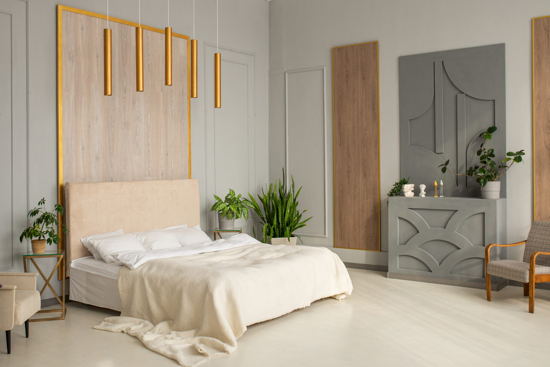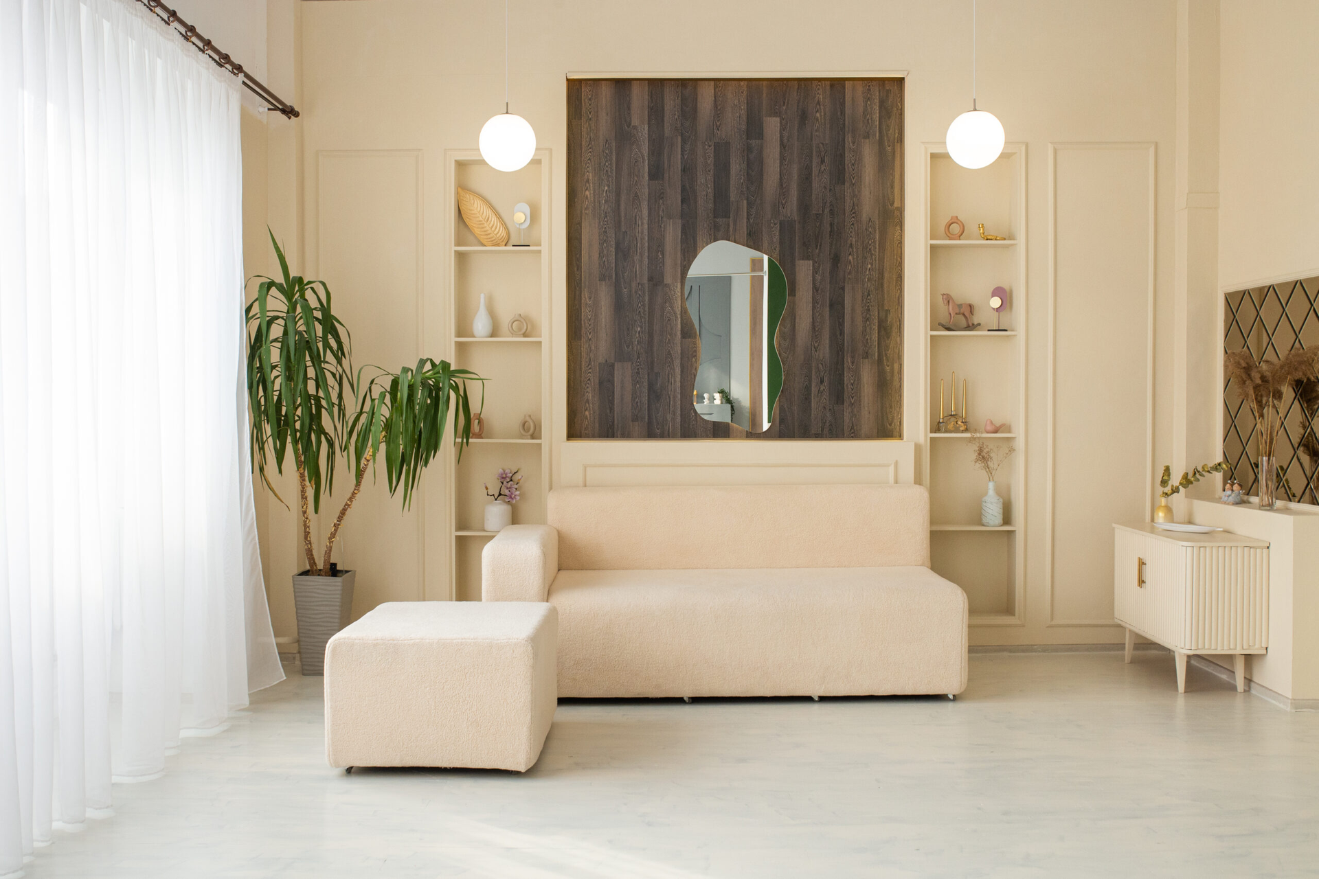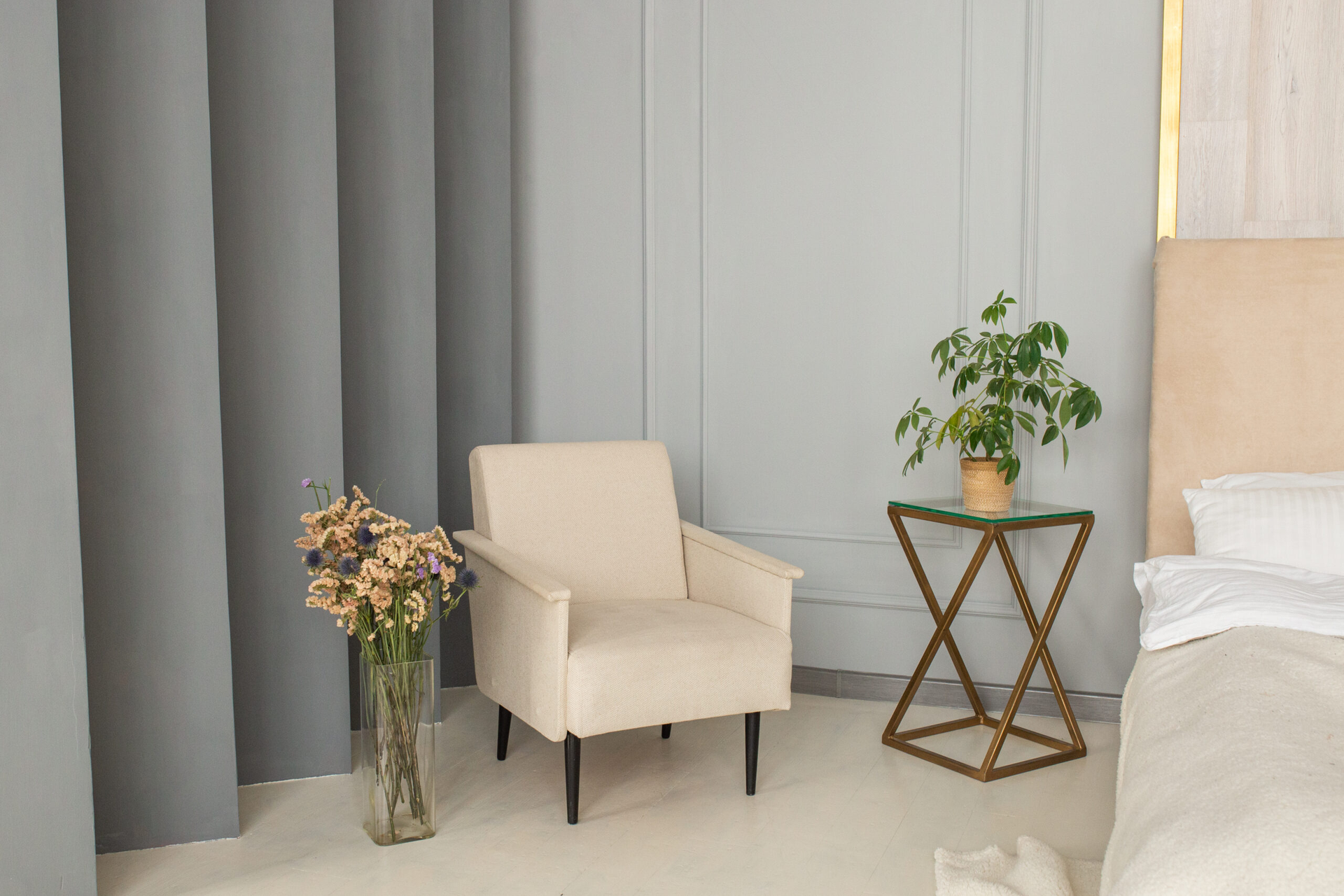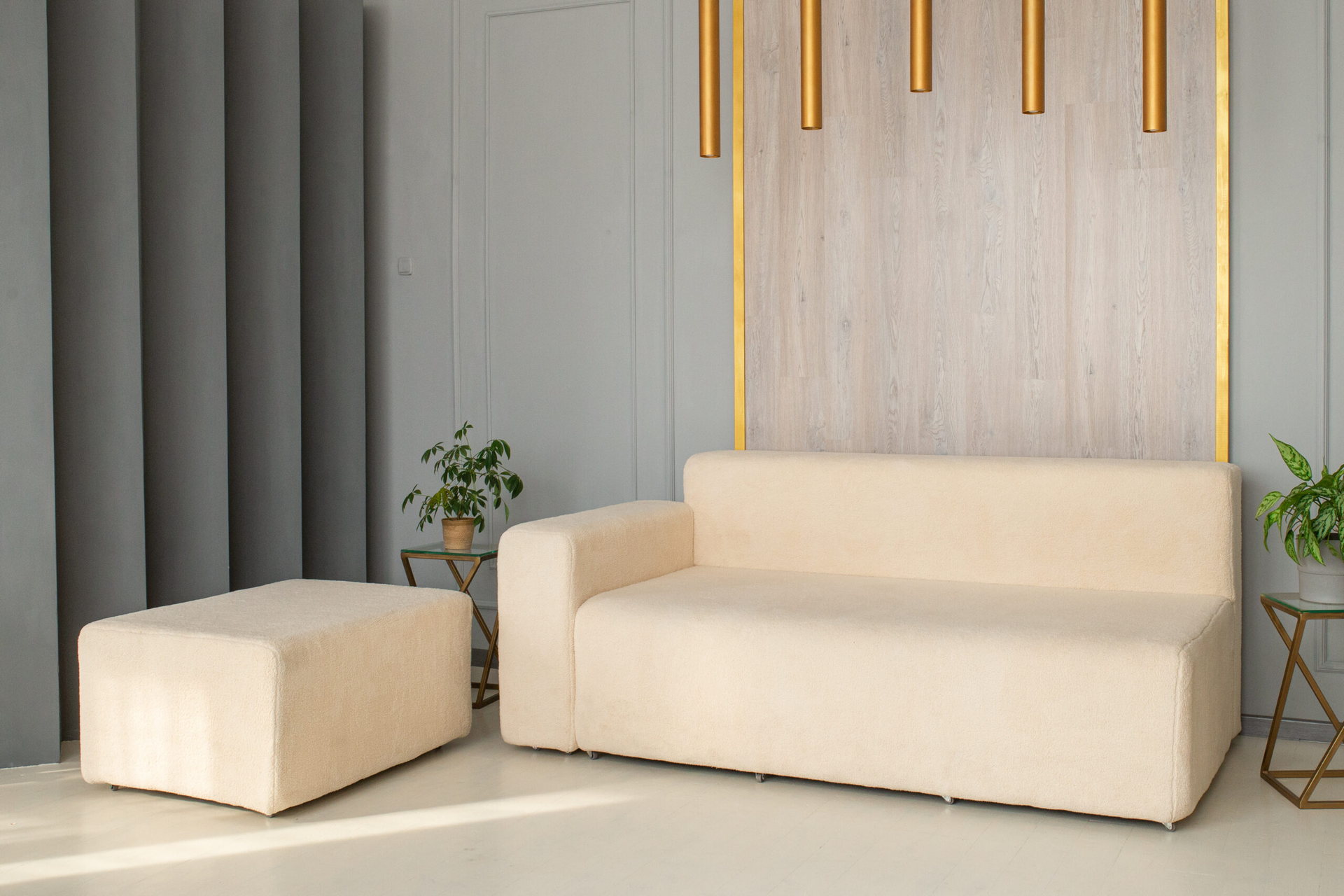 - из мебели в зале представлены: золотой диван и оттоманка, графитовое и синее кресло, серый диван, стильные столики, комнатные растения, мобильная стена «Love» оформленная цветочной композицией