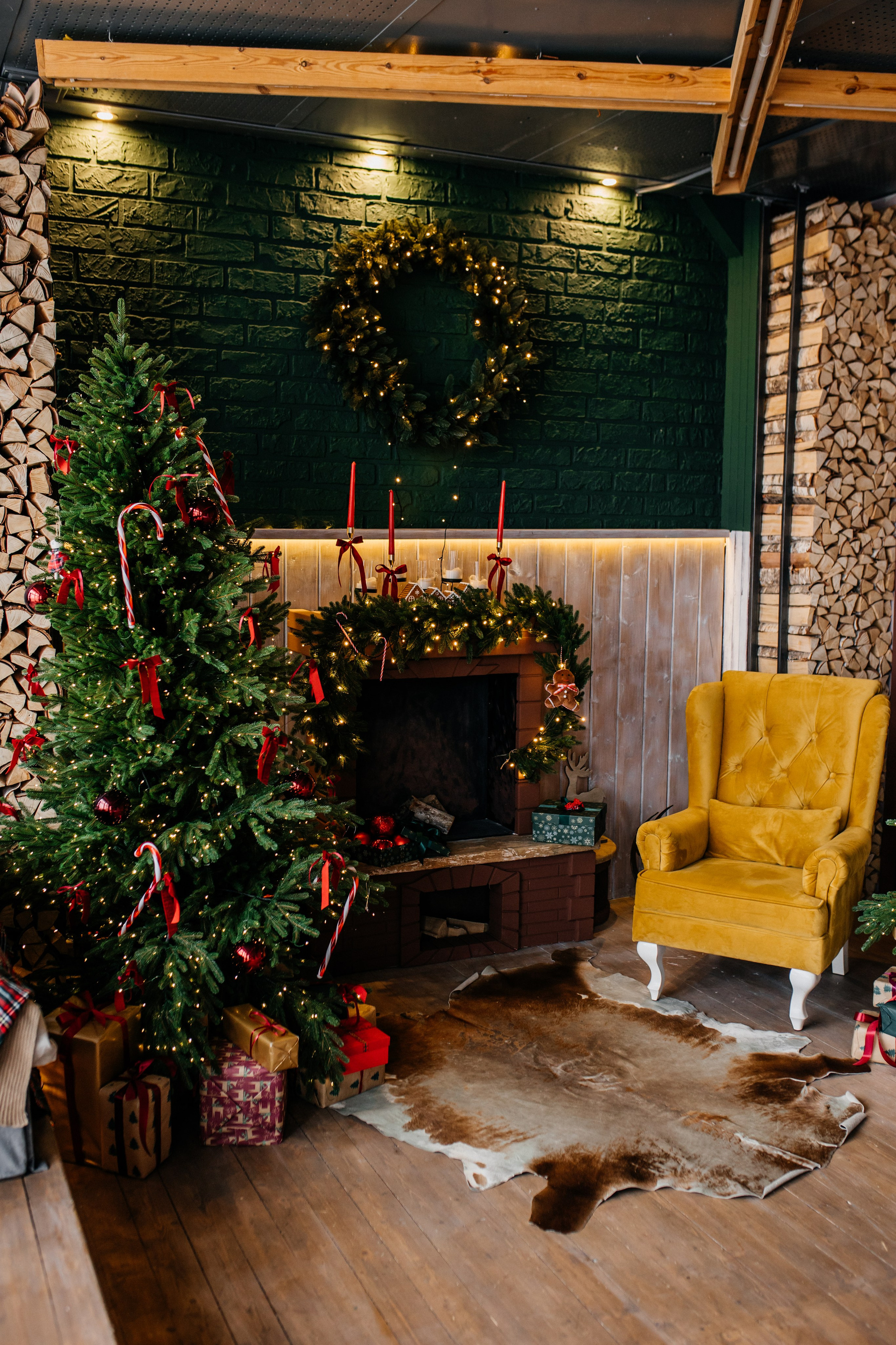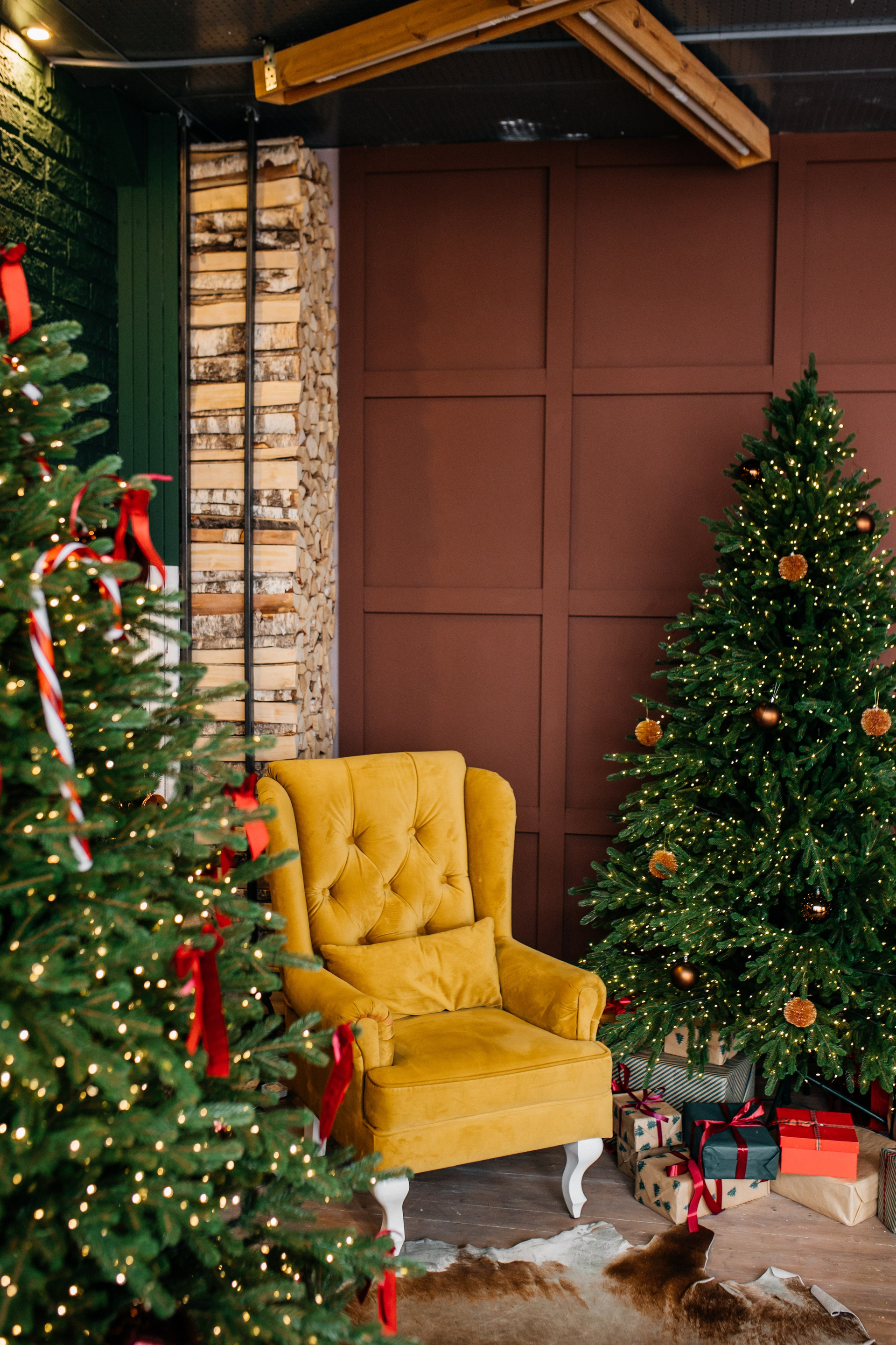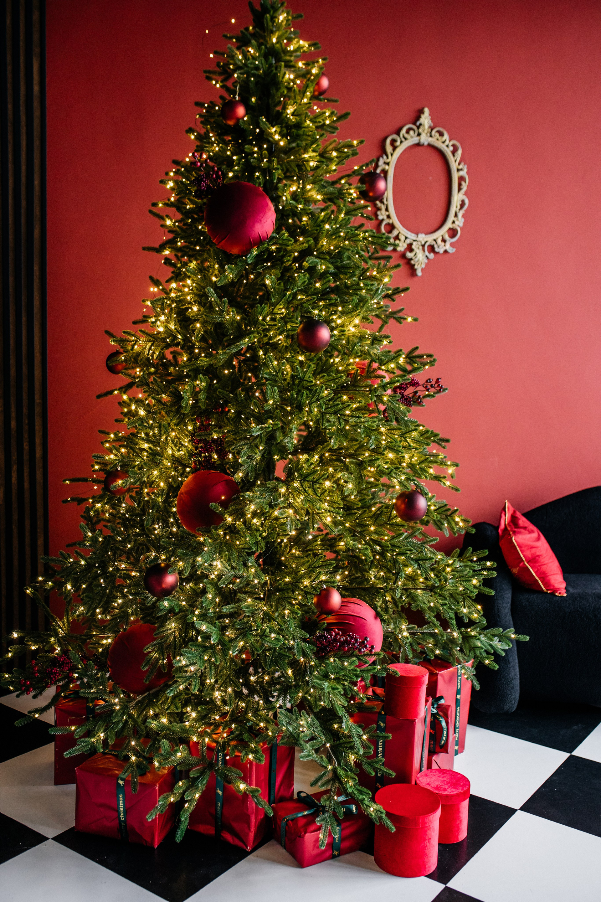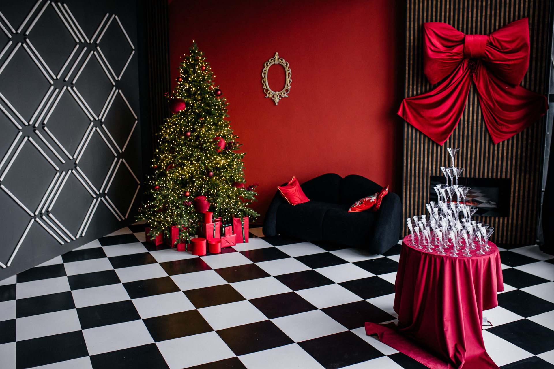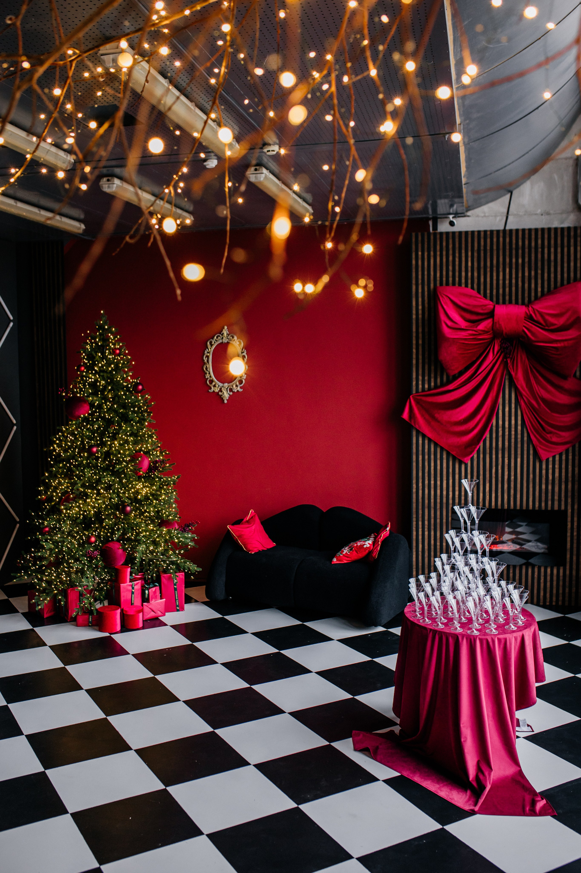 Световая стена, подиум 40 м², панорамные окна в пол, эксклюзивная мебель, камин, электрокамин, уникальные элементы декора, четыре литые ёлки очень схожи с натуральными, кровать в зимнем лесу, черно-белый ромбовидны пол, красная стена.