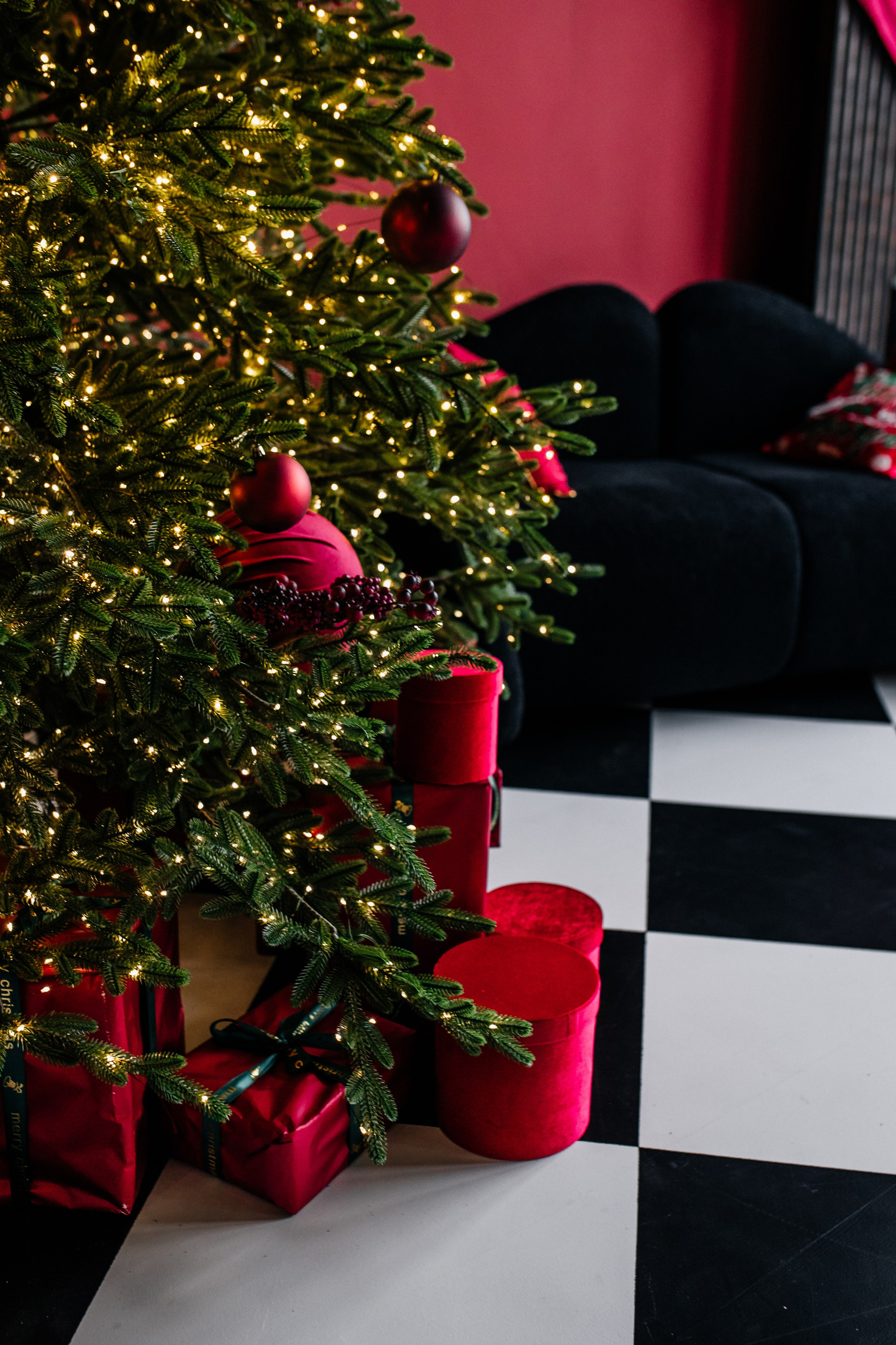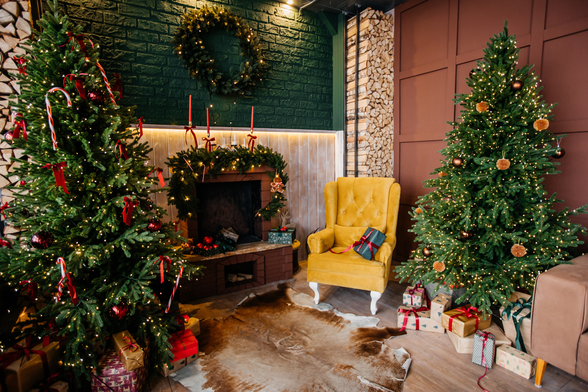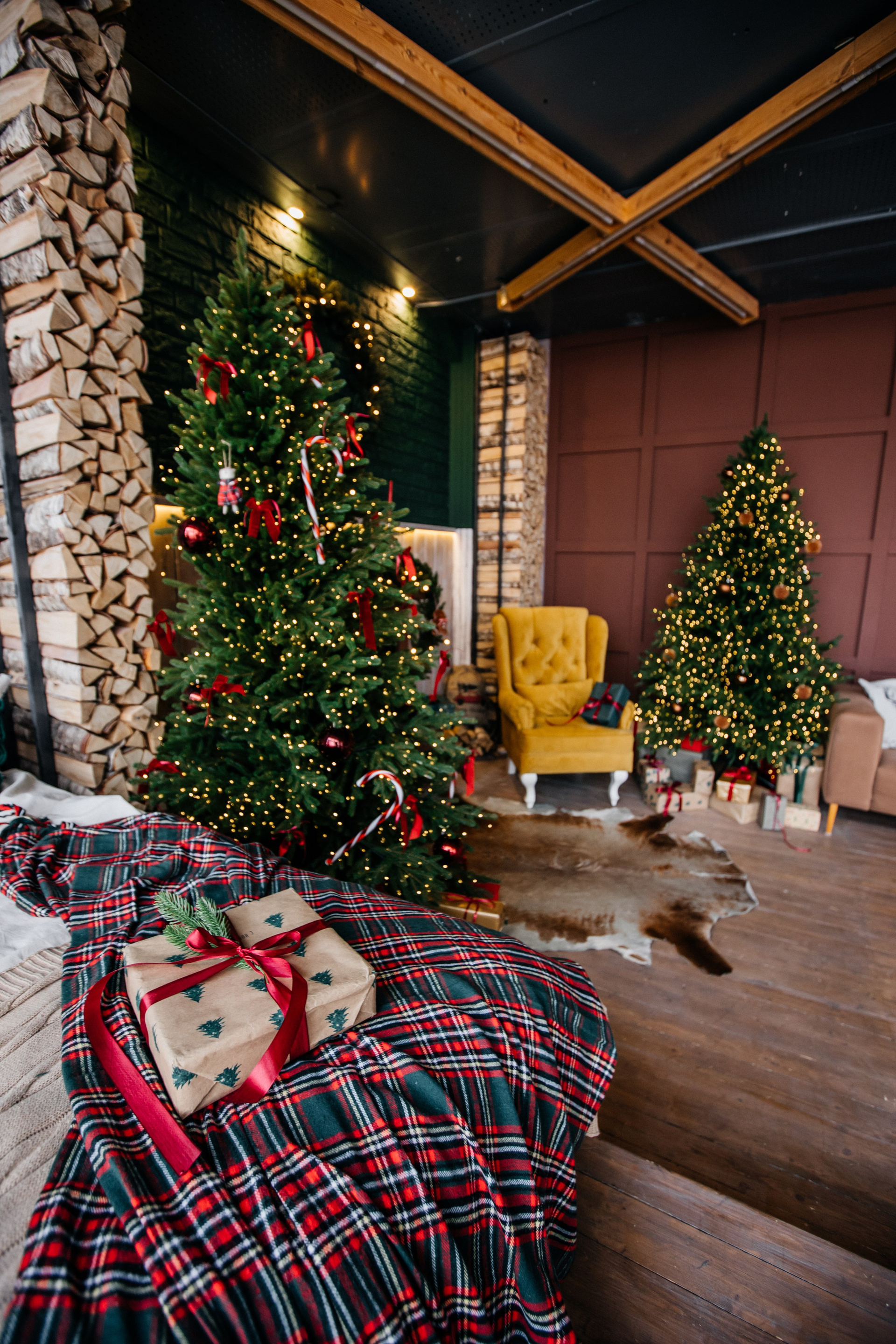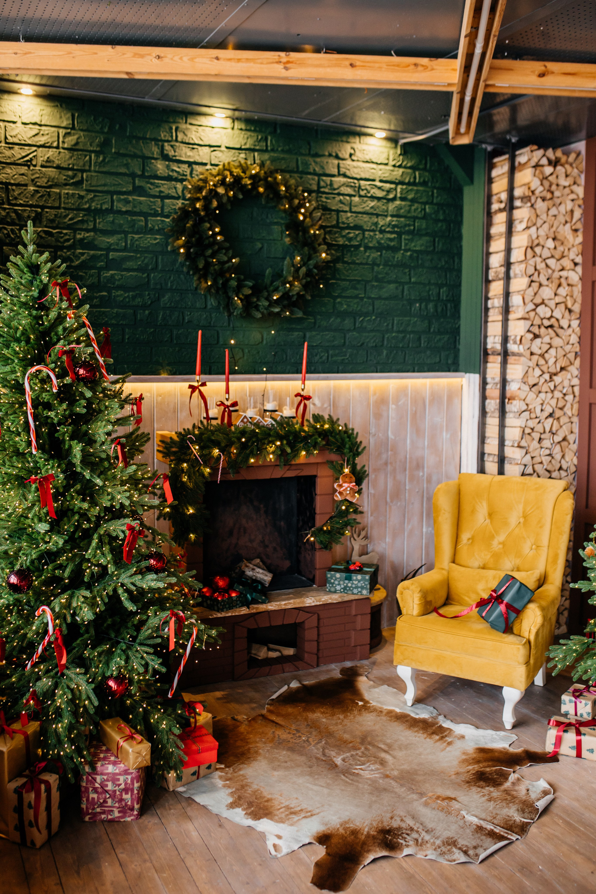 Световая стена, подиум 40 м², панорамные окна в пол, эксклюзивная мебель, камин, электрокамин, уникальные элементы декора, четыре литые ёлки очень схожи с натуральными, кровать в зимнем лесу, черно-белый ромбовидны пол, красная стена.