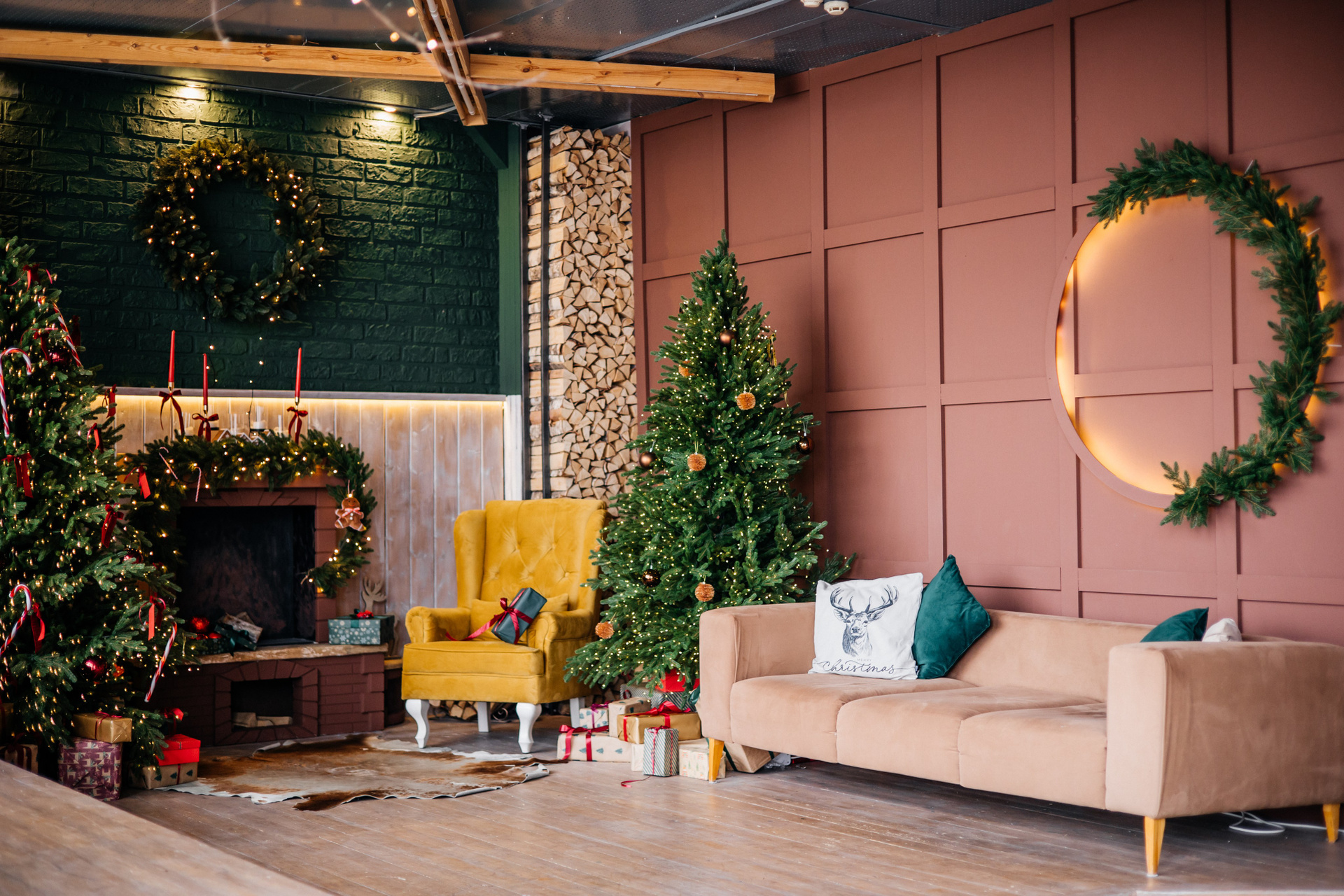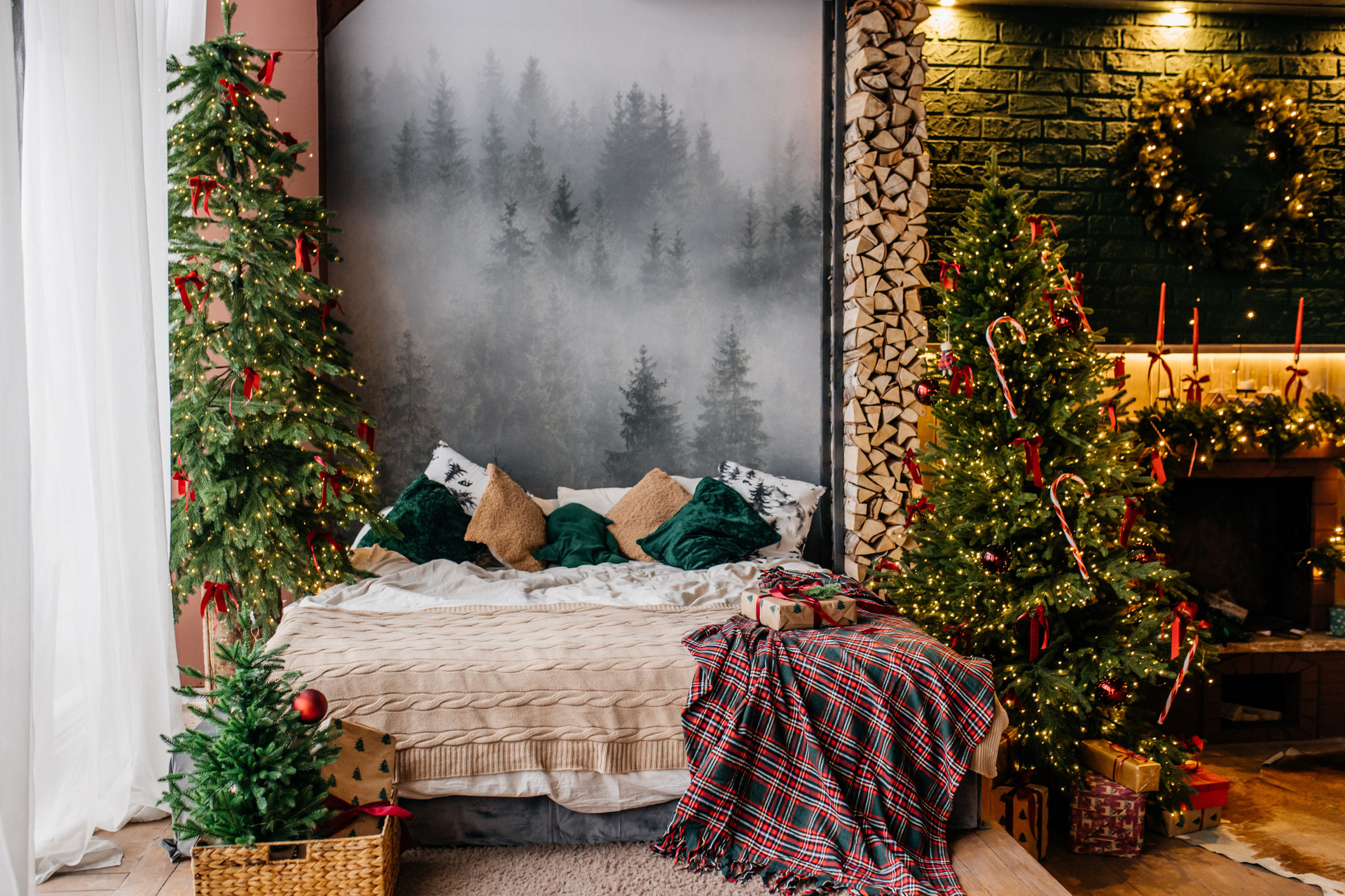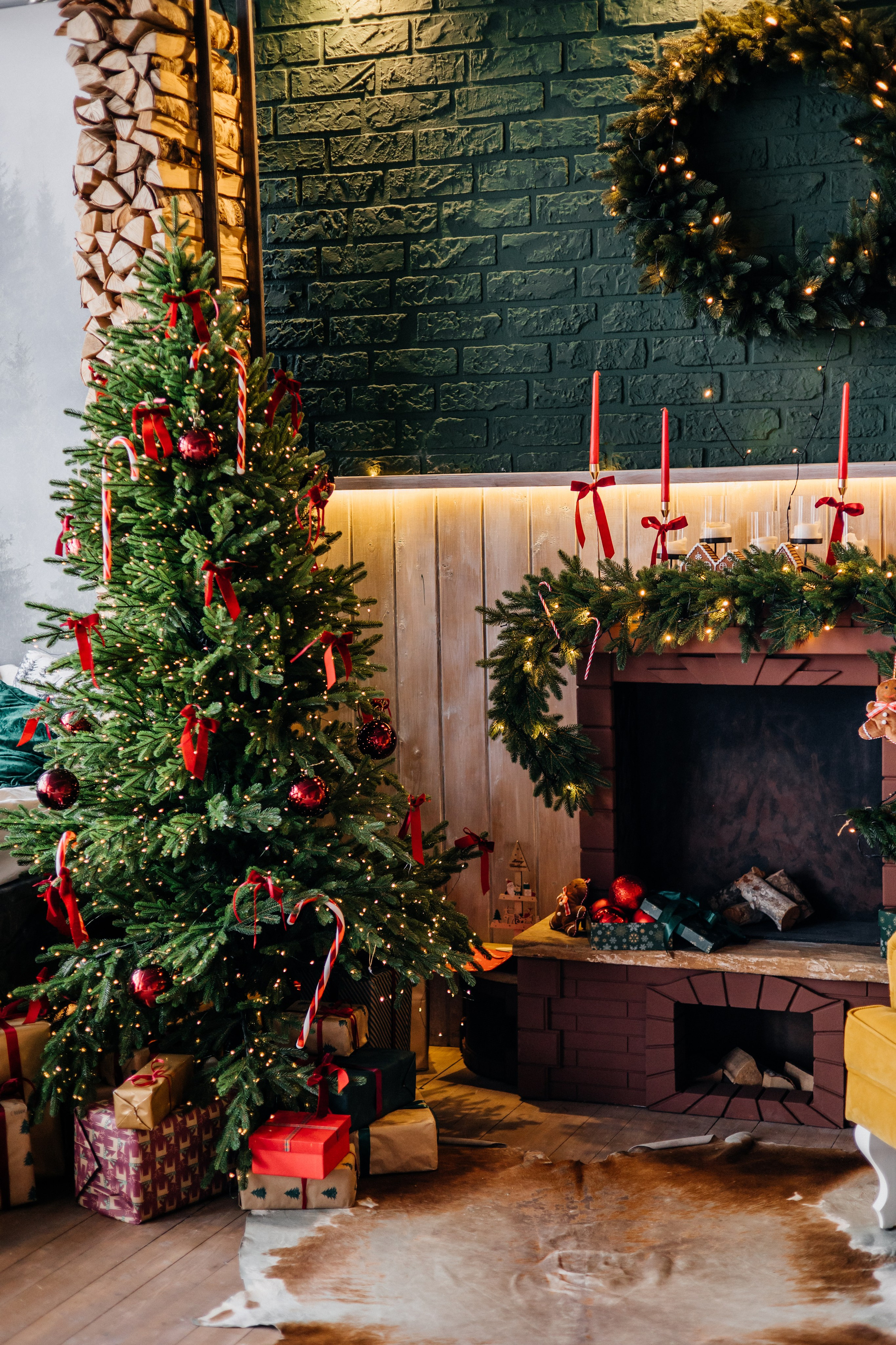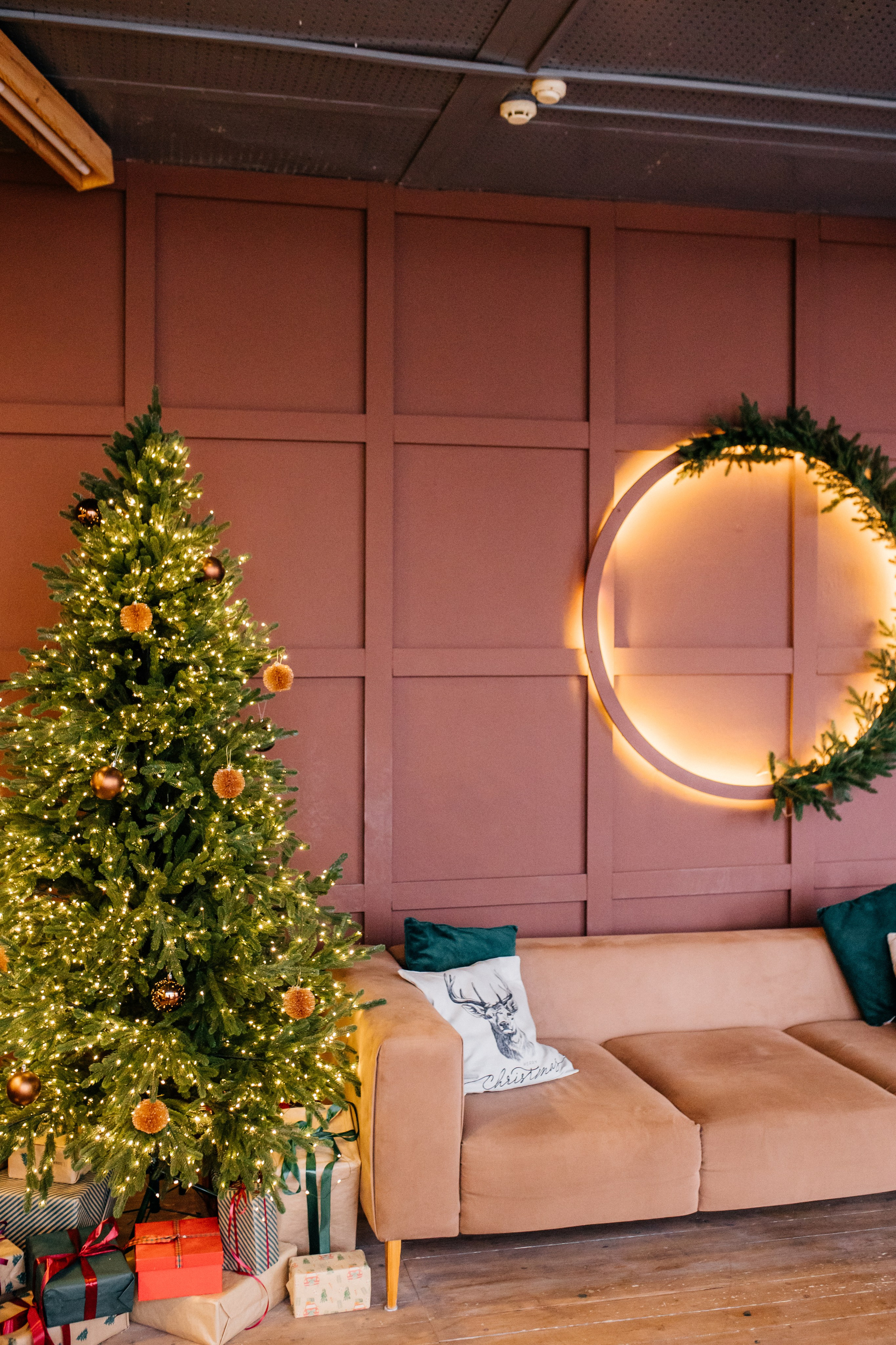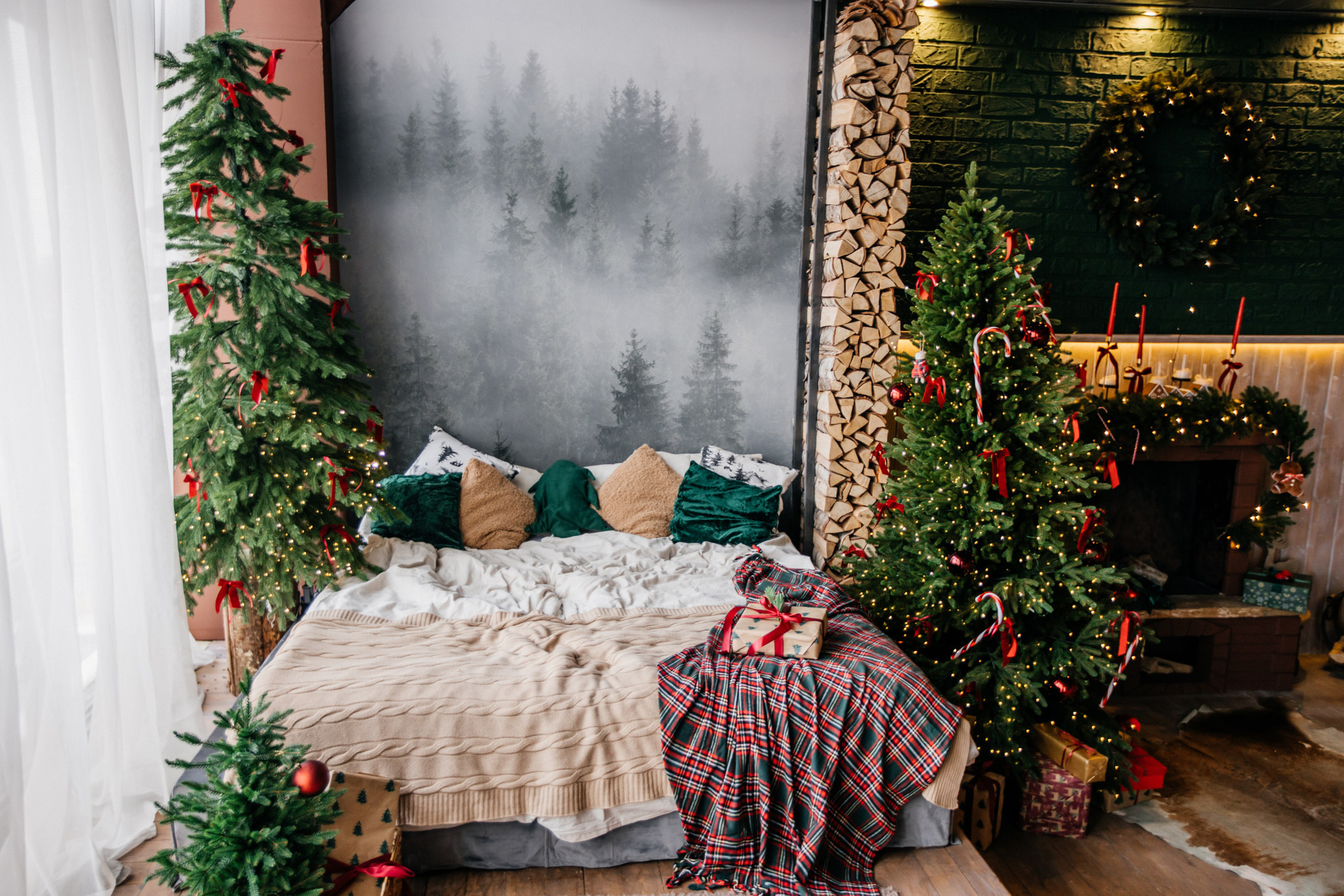 Световая стена, подиум 40 м², панорамные окна в пол, эксклюзивная мебель, камин, электрокамин, уникальные элементы декора, четыре литые ёлки очень схожи с натуральными, кровать в зимнем лесу, черно-белый ромбовидны пол, красная стена.