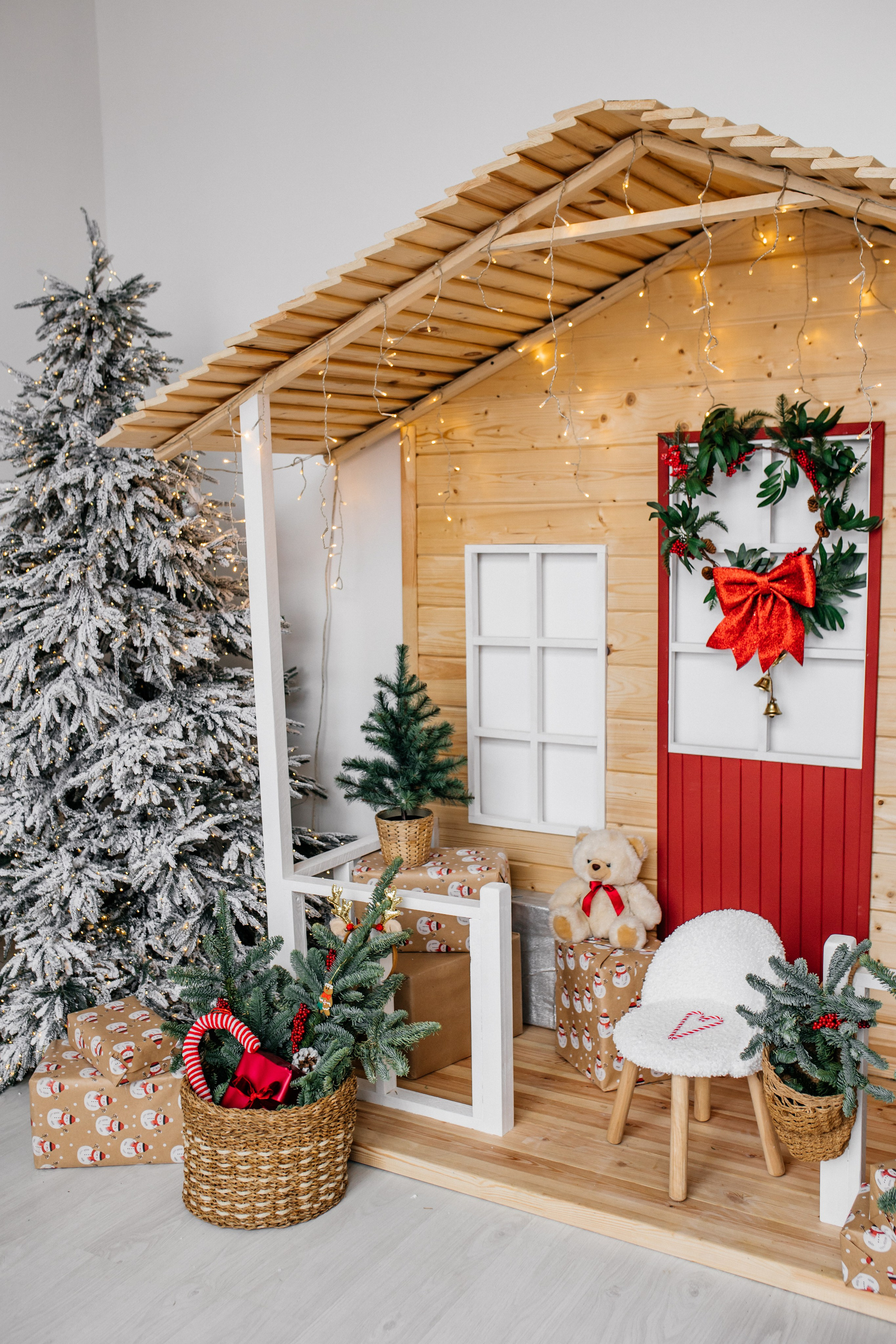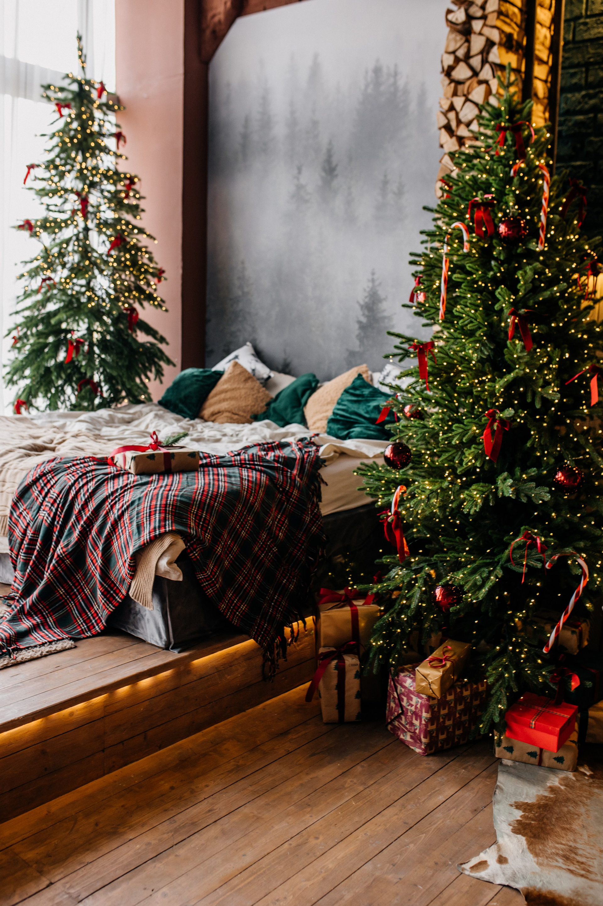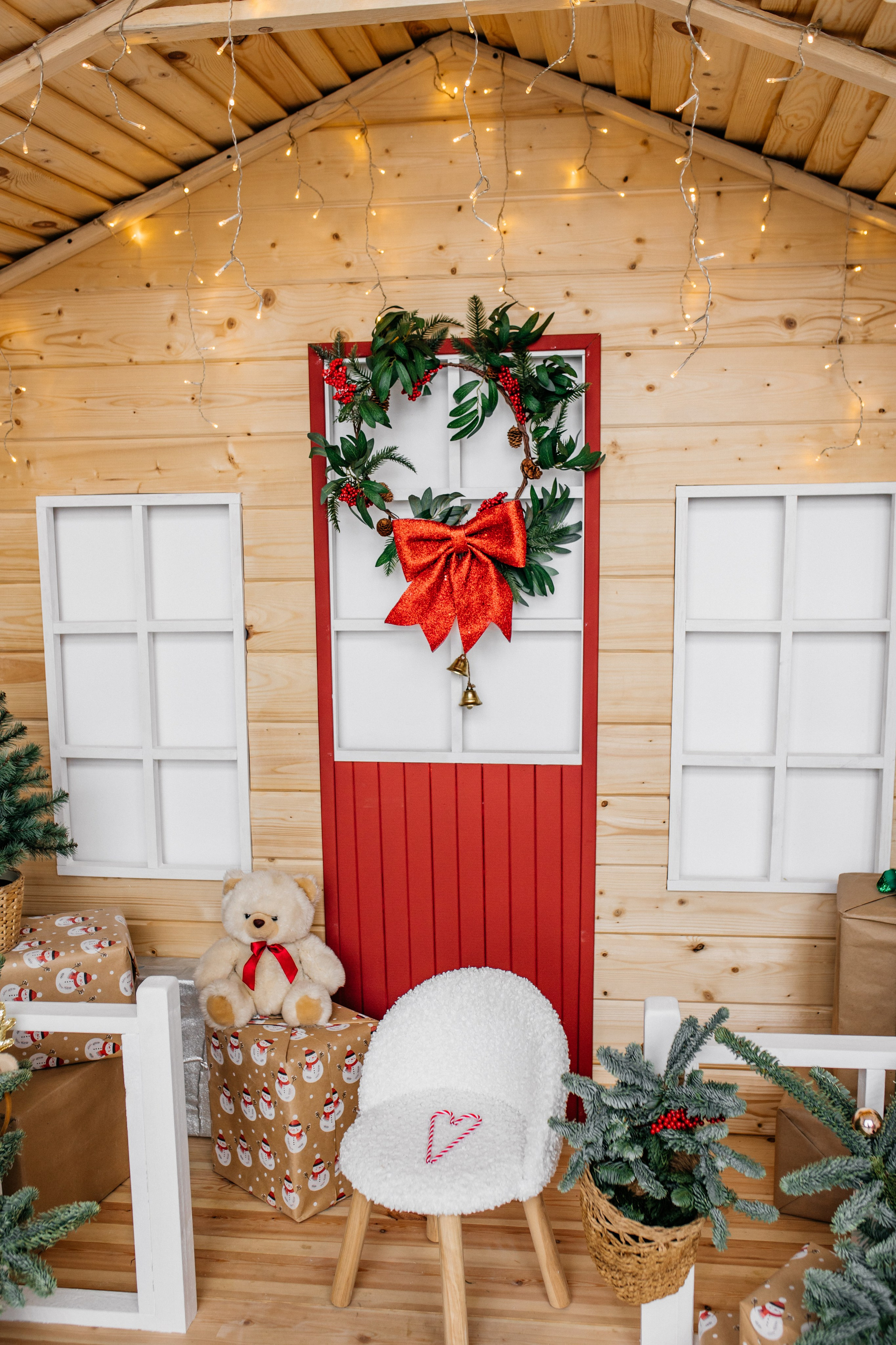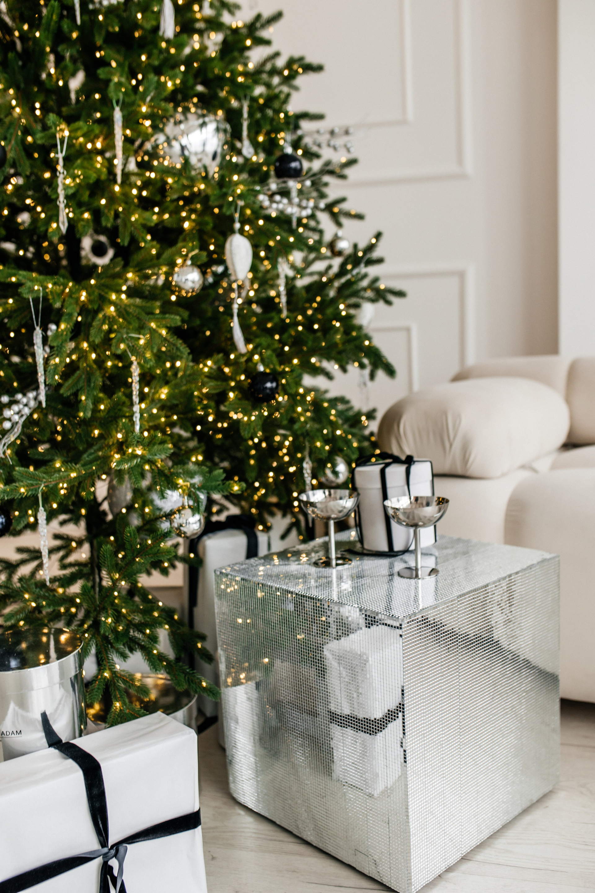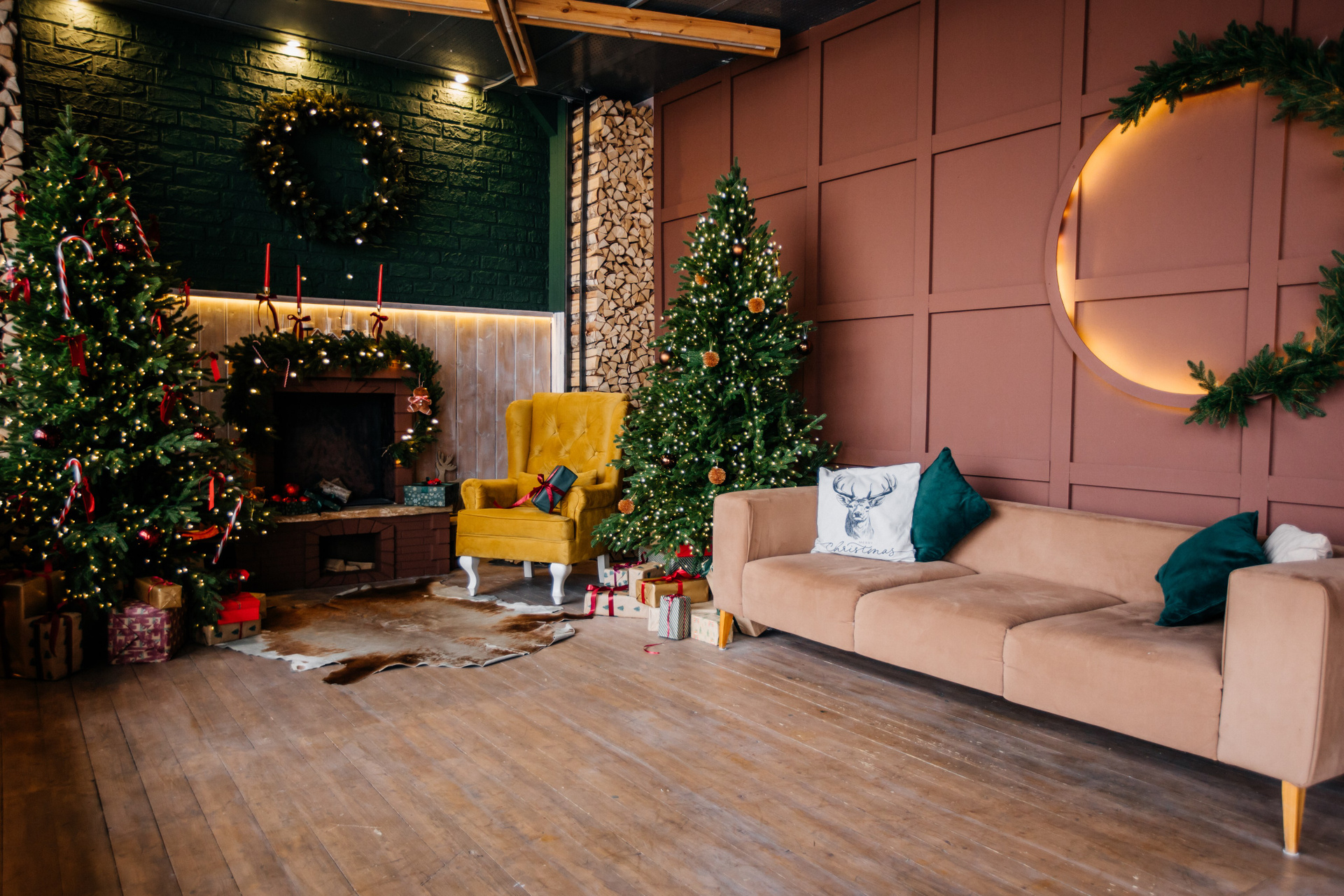 Световая стена, подиум 40 м², панорамные окна в пол, эксклюзивная мебель, камин, электрокамин, уникальные элементы декора, четыре литые ёлки очень схожи с натуральными, кровать в зимнем лесу, черно-белый ромбовидны пол, красная стена.