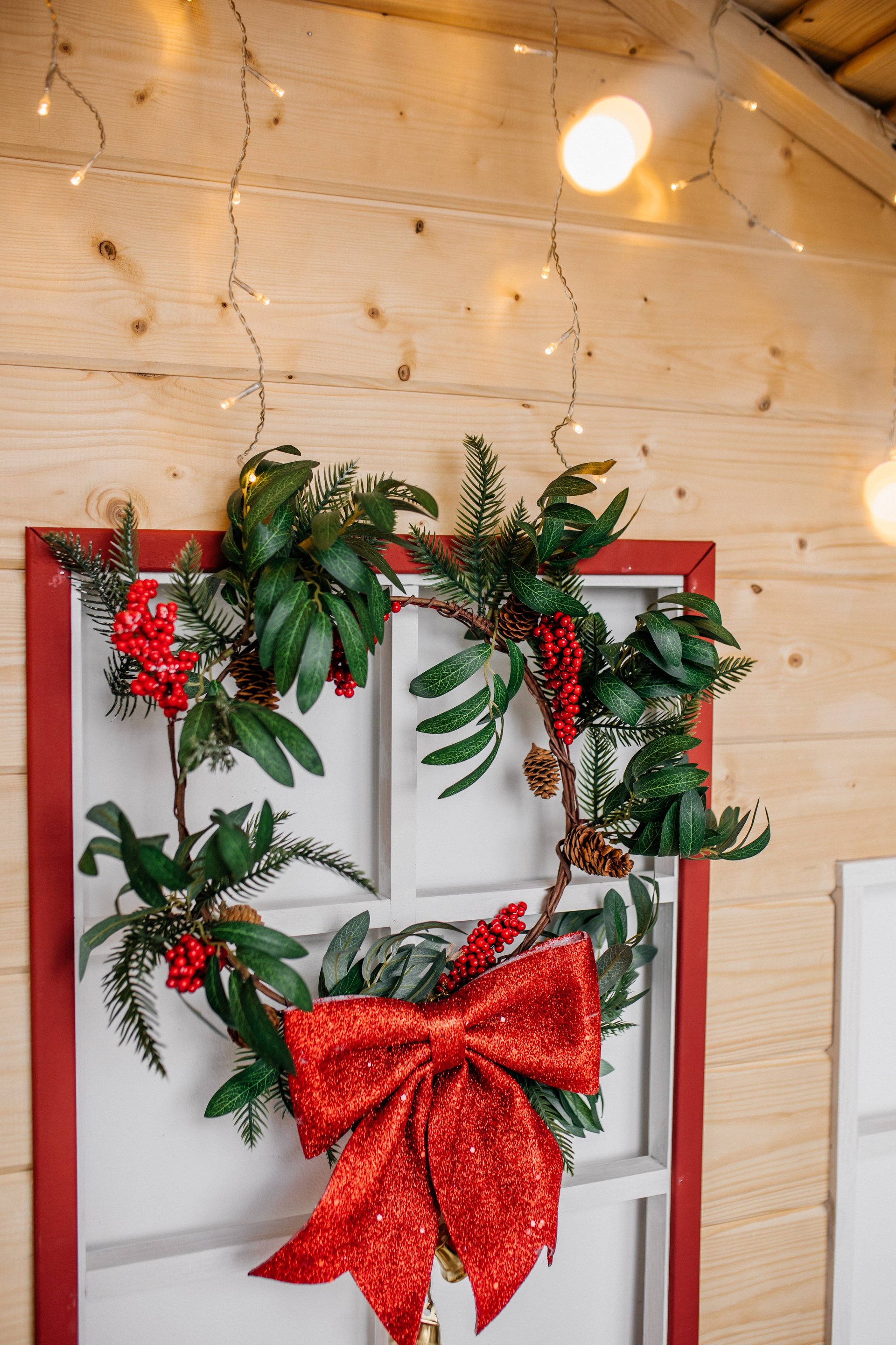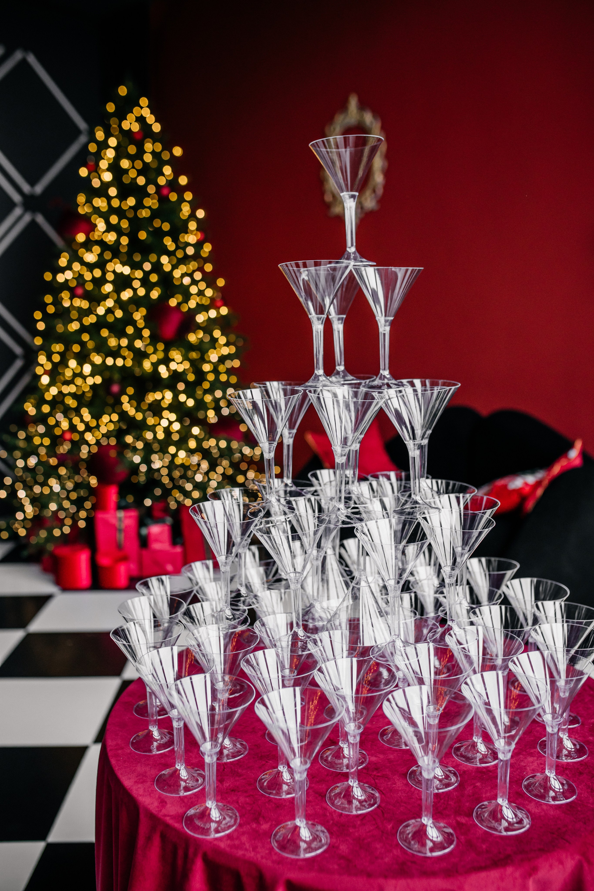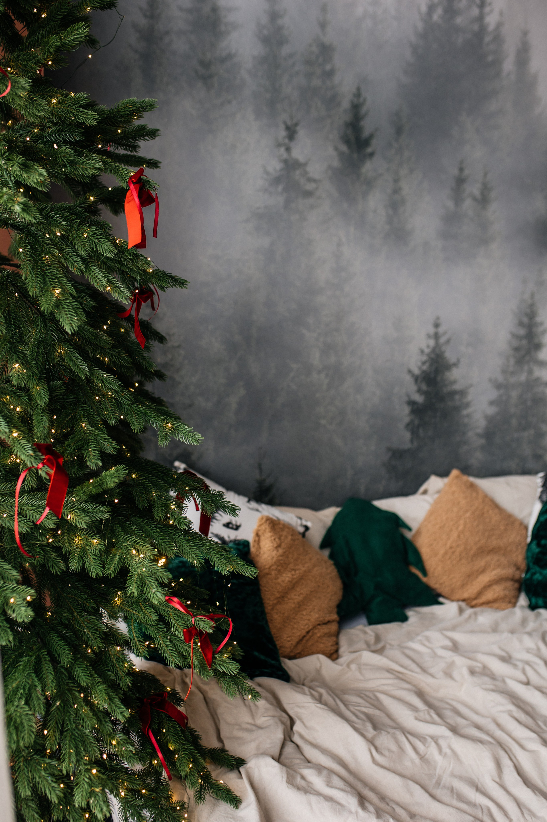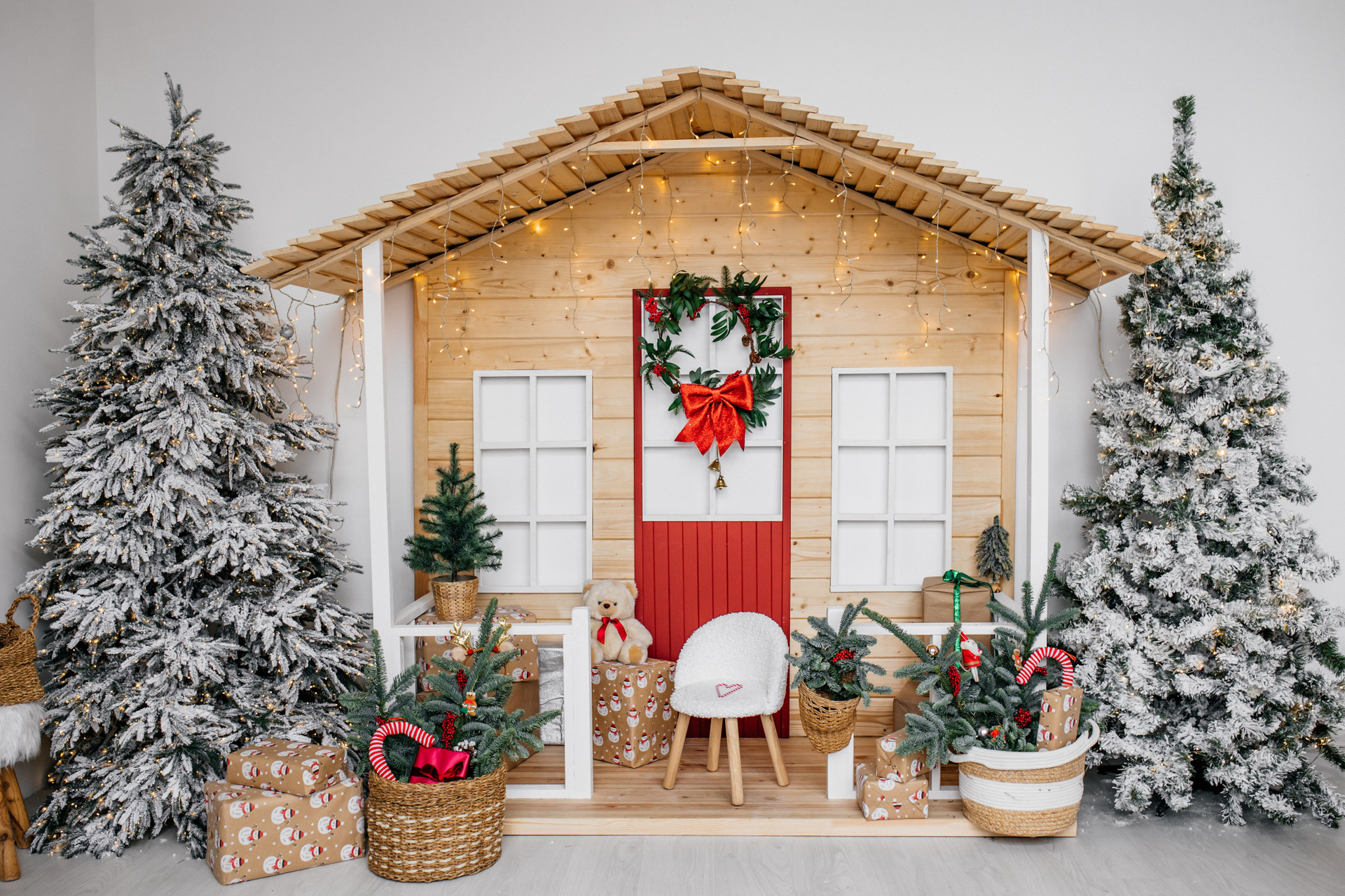 Световая стена, подиум 40 м², панорамные окна в пол, эксклюзивная мебель, камин, электрокамин, уникальные элементы декора, четыре литые ёлки очень схожи с натуральными, кровать в зимнем лесу, черно-белый ромбовидны пол, красная стена.