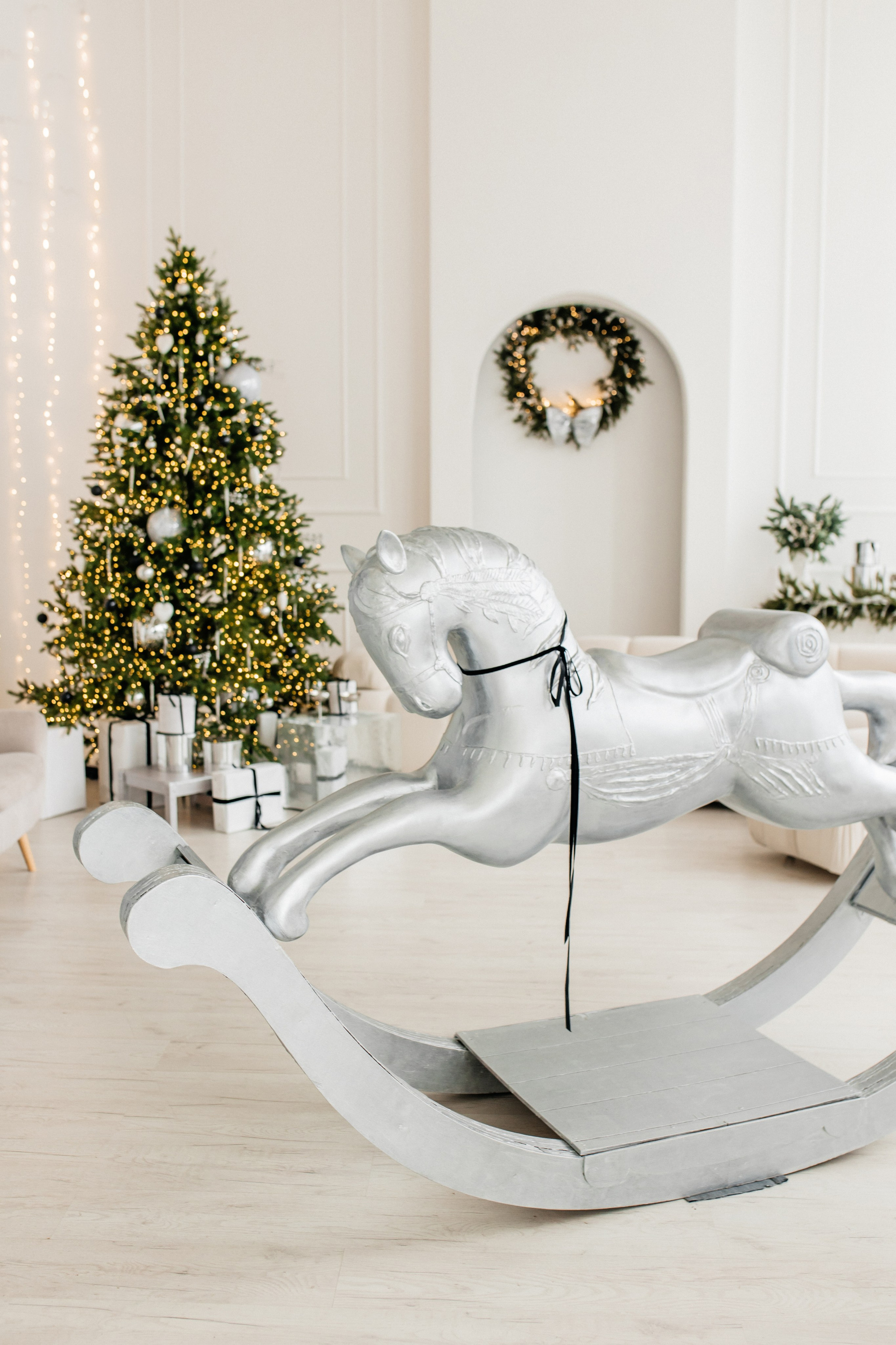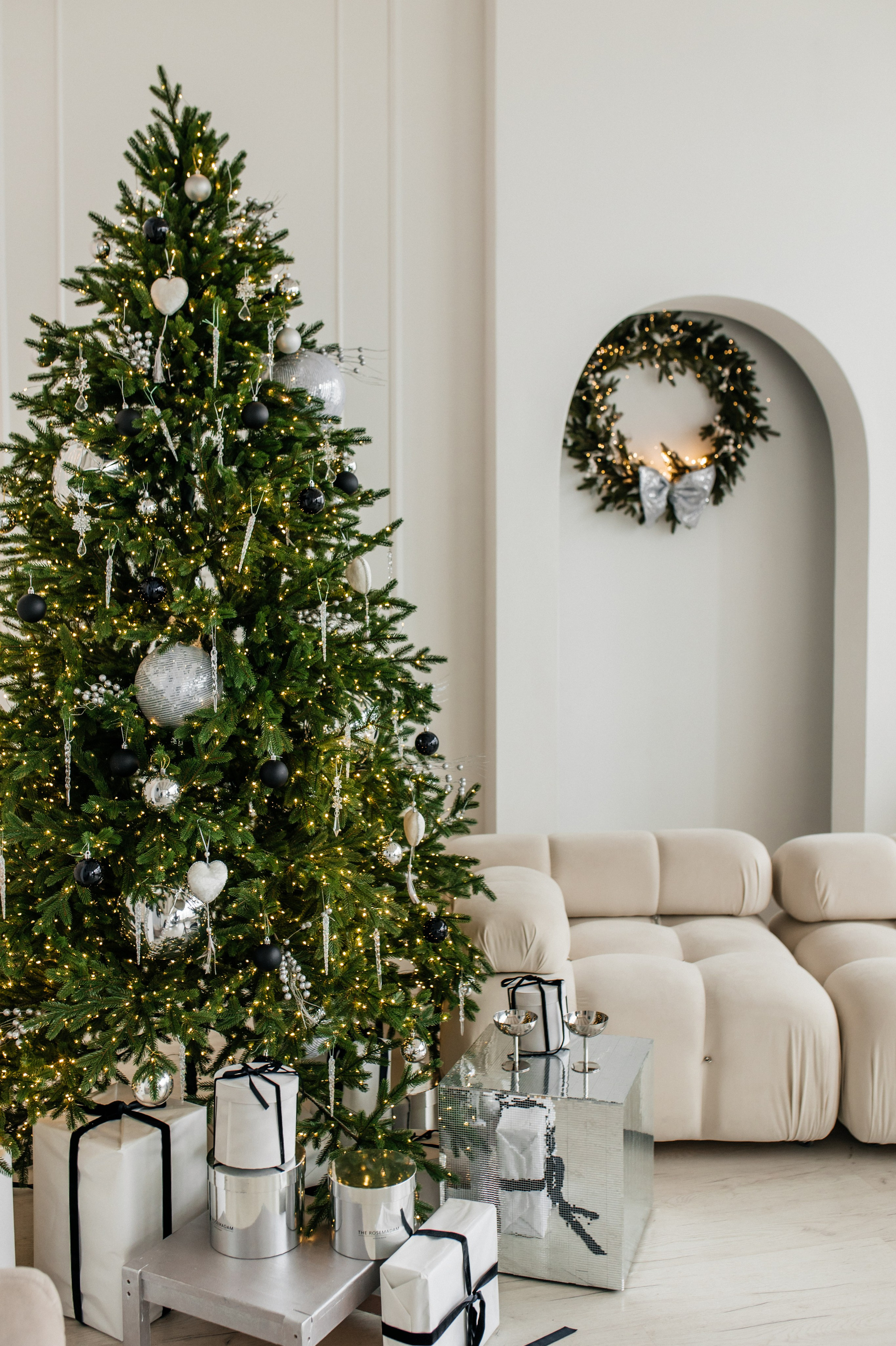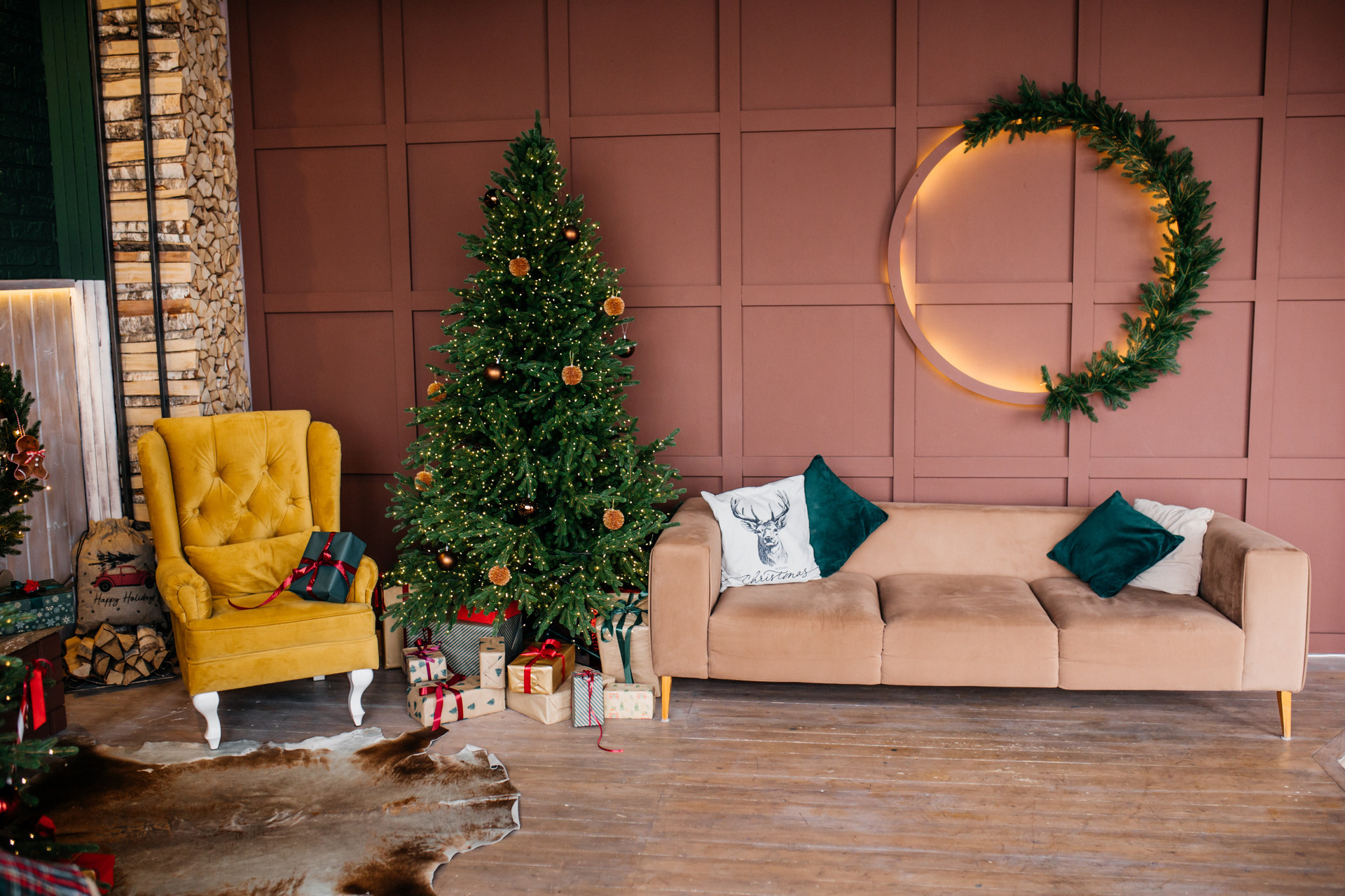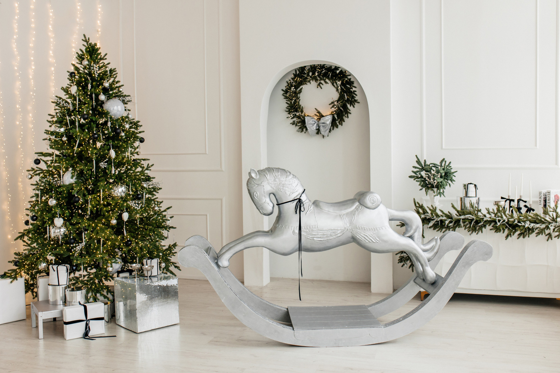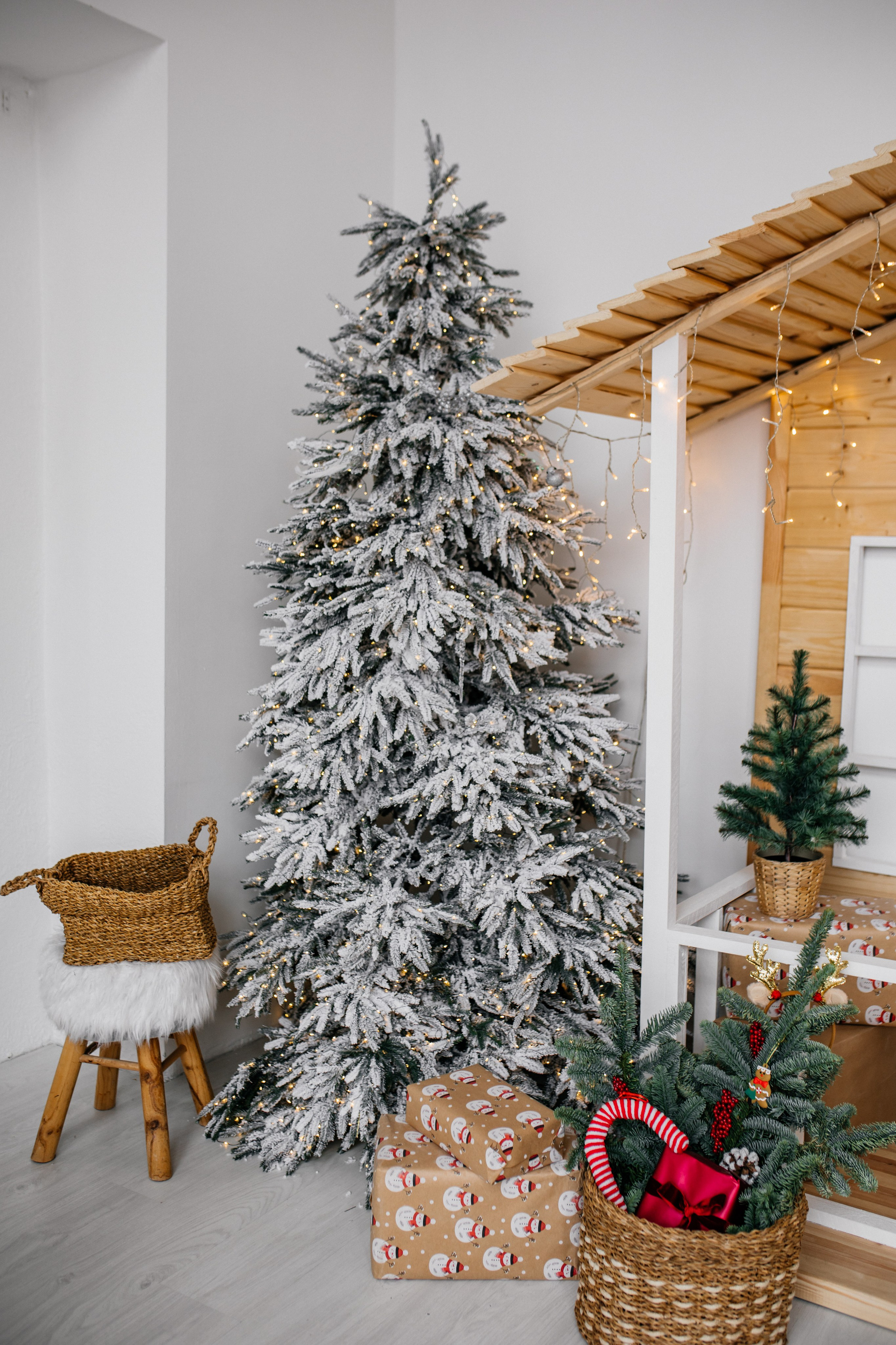 Световая стена, подиум 40 м², панорамные окна в пол, эксклюзивная мебель, камин, электрокамин, уникальные элементы декора, четыре литые ёлки очень схожи с натуральными, кровать в зимнем лесу, черно-белый ромбовидны пол, красная стена.