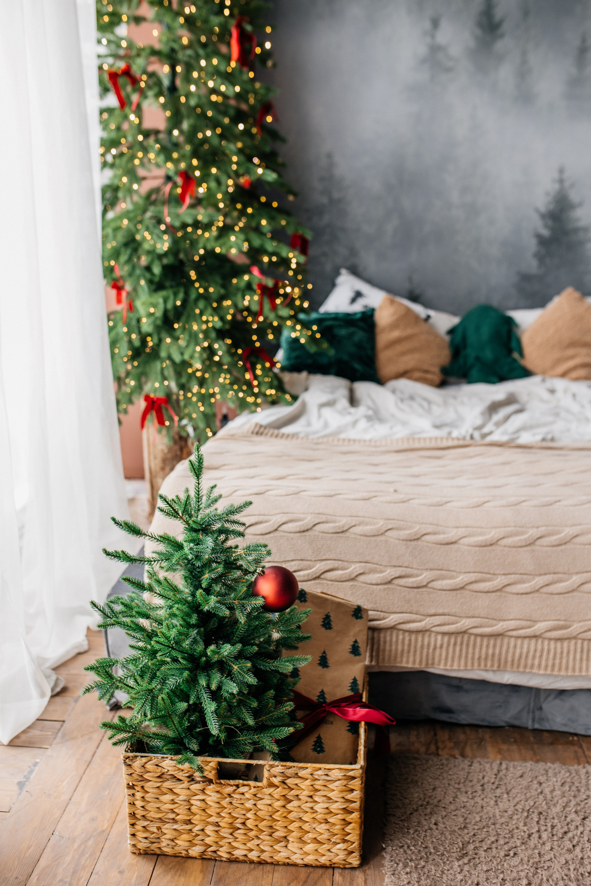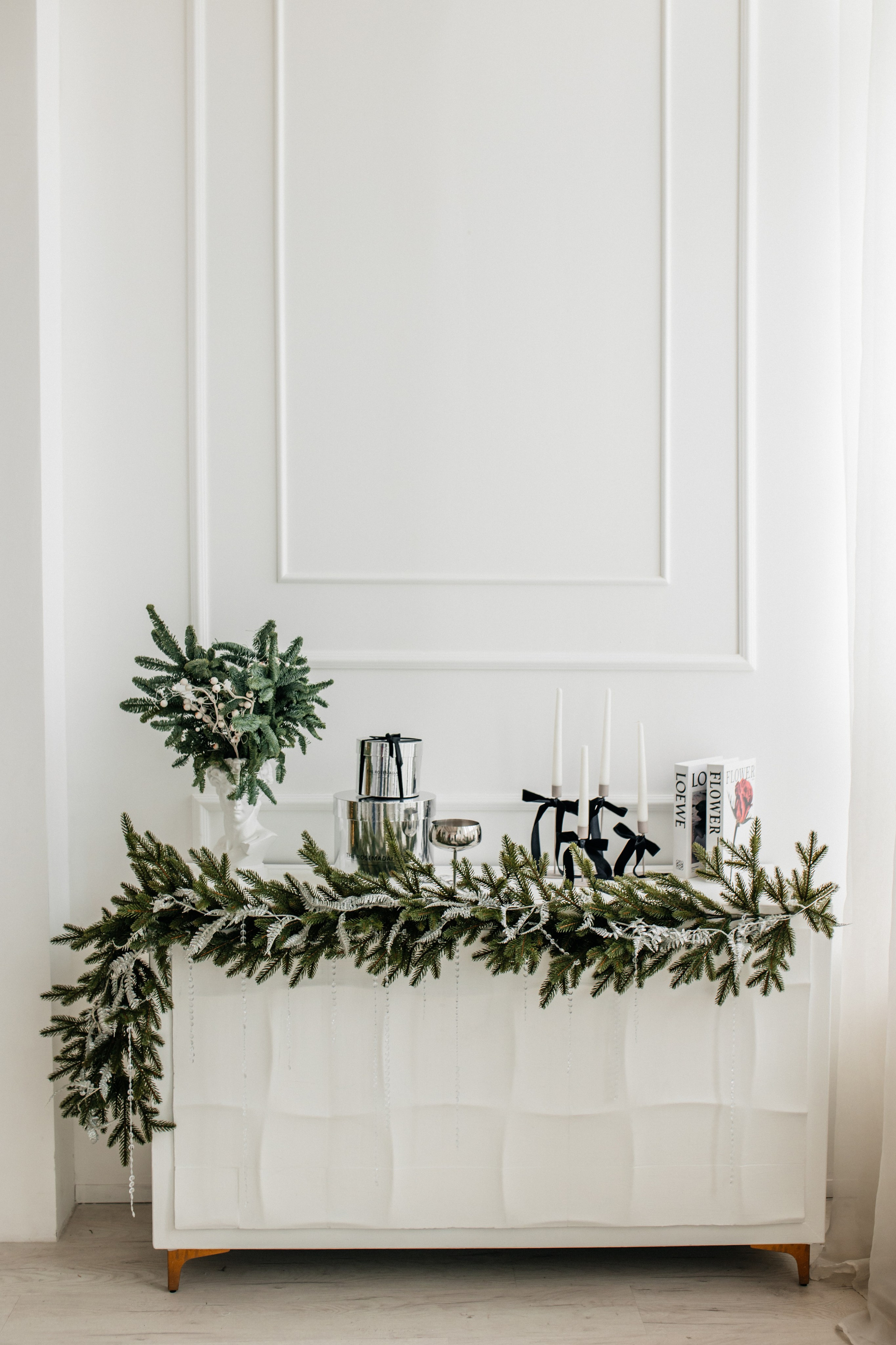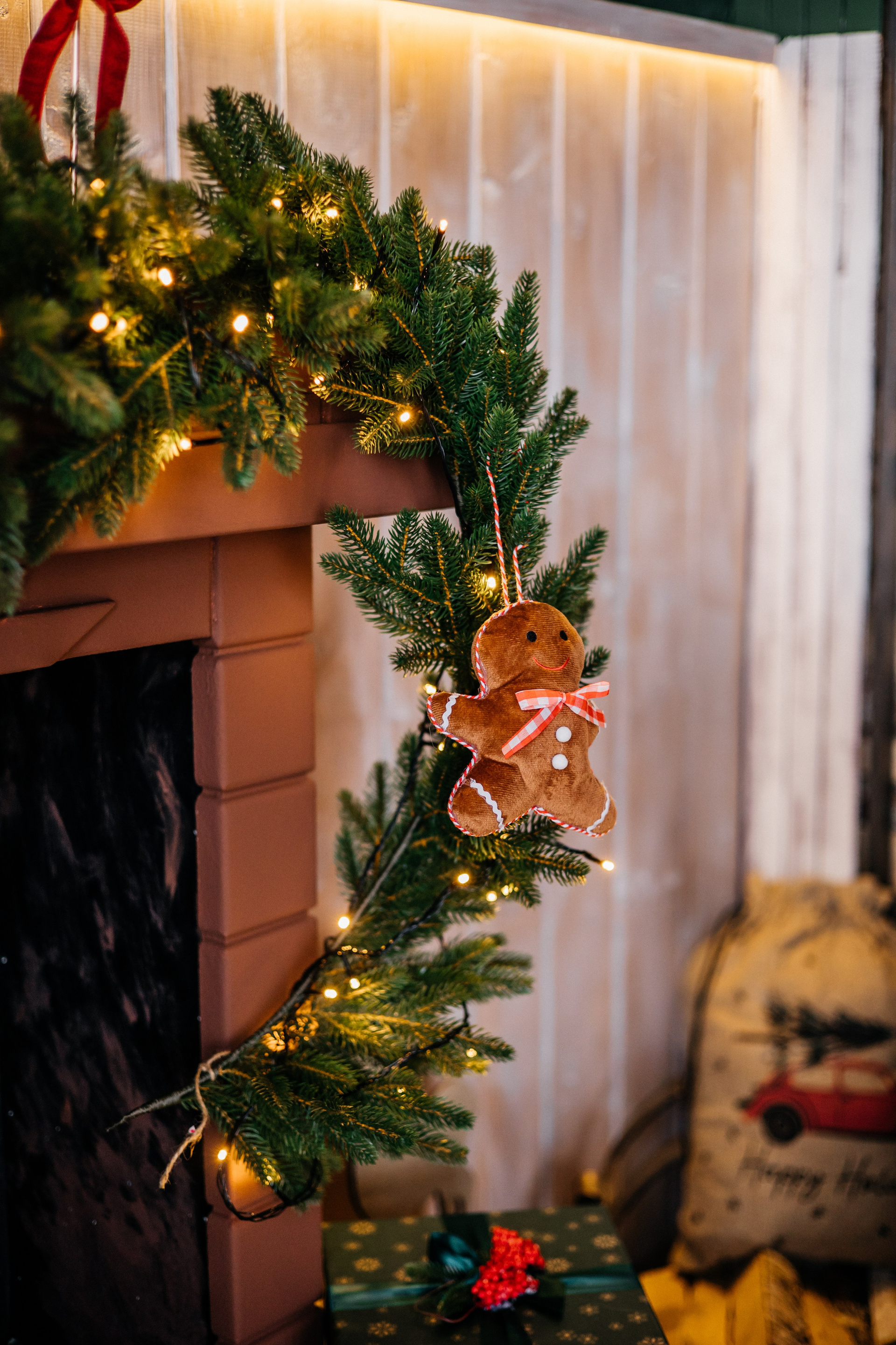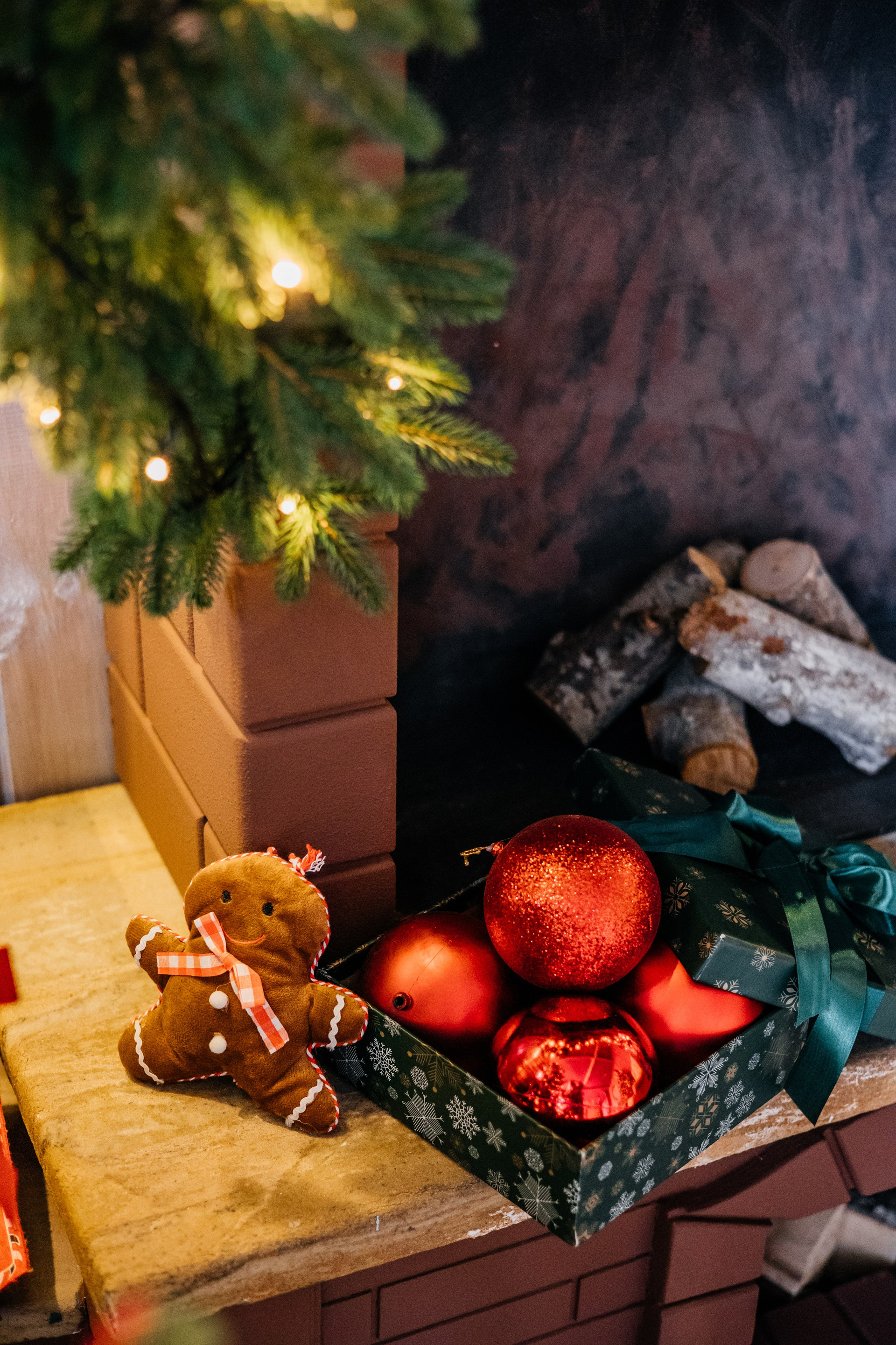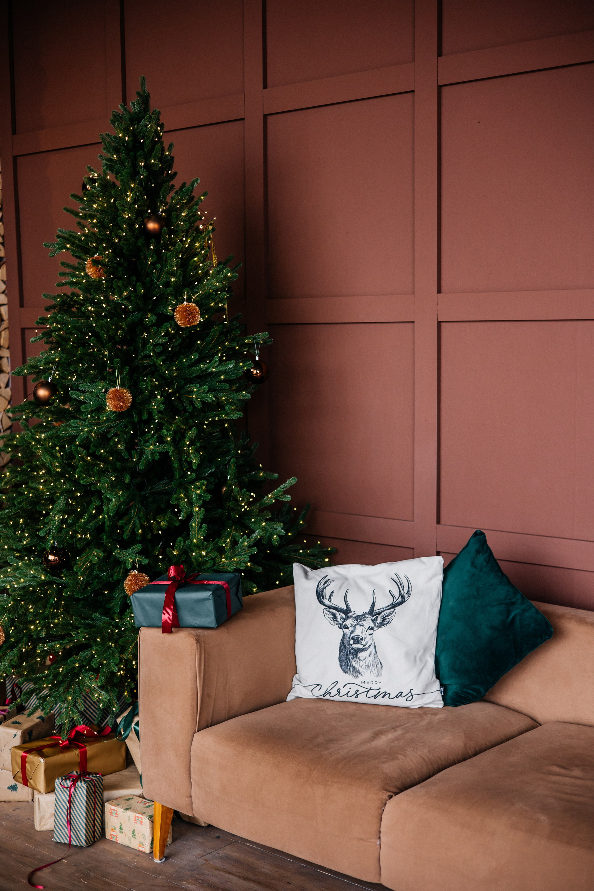 Световая стена, подиум 40 м², панорамные окна в пол, эксклюзивная мебель, камин, электрокамин, уникальные элементы декора, четыре литые ёлки очень схожи с натуральными, кровать в зимнем лесу, черно-белый ромбовидны пол, красная стена.