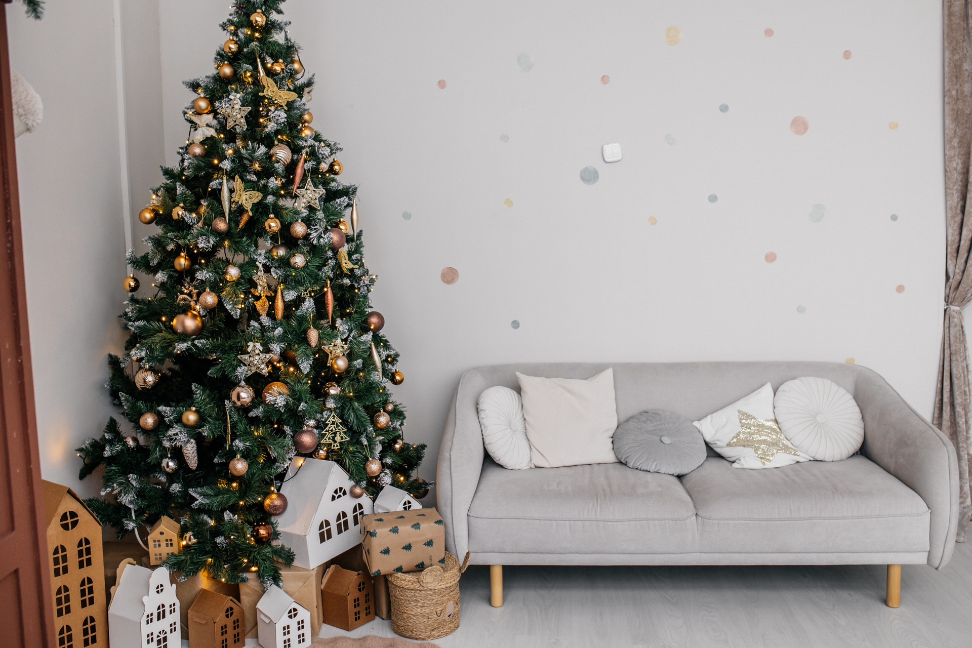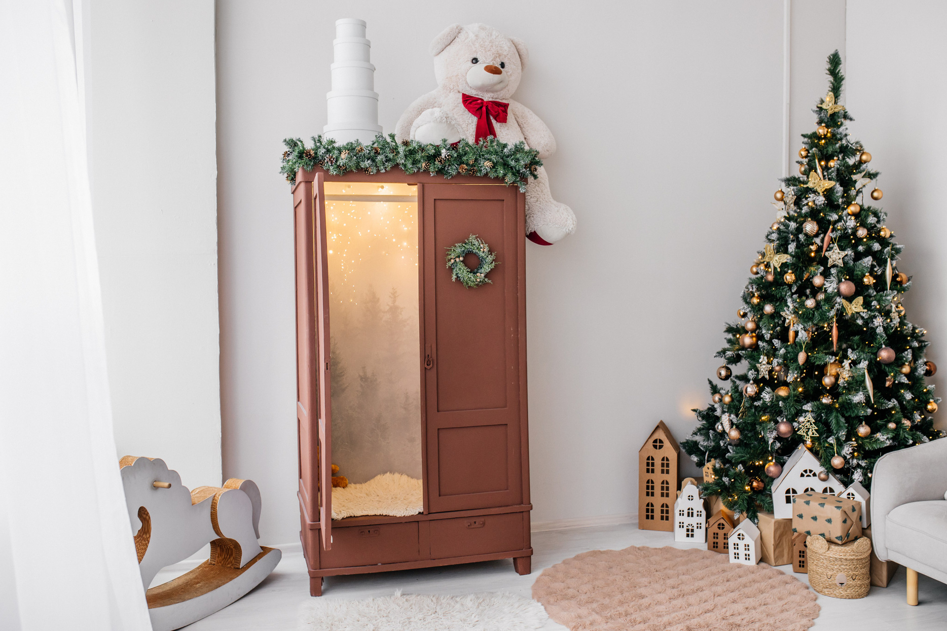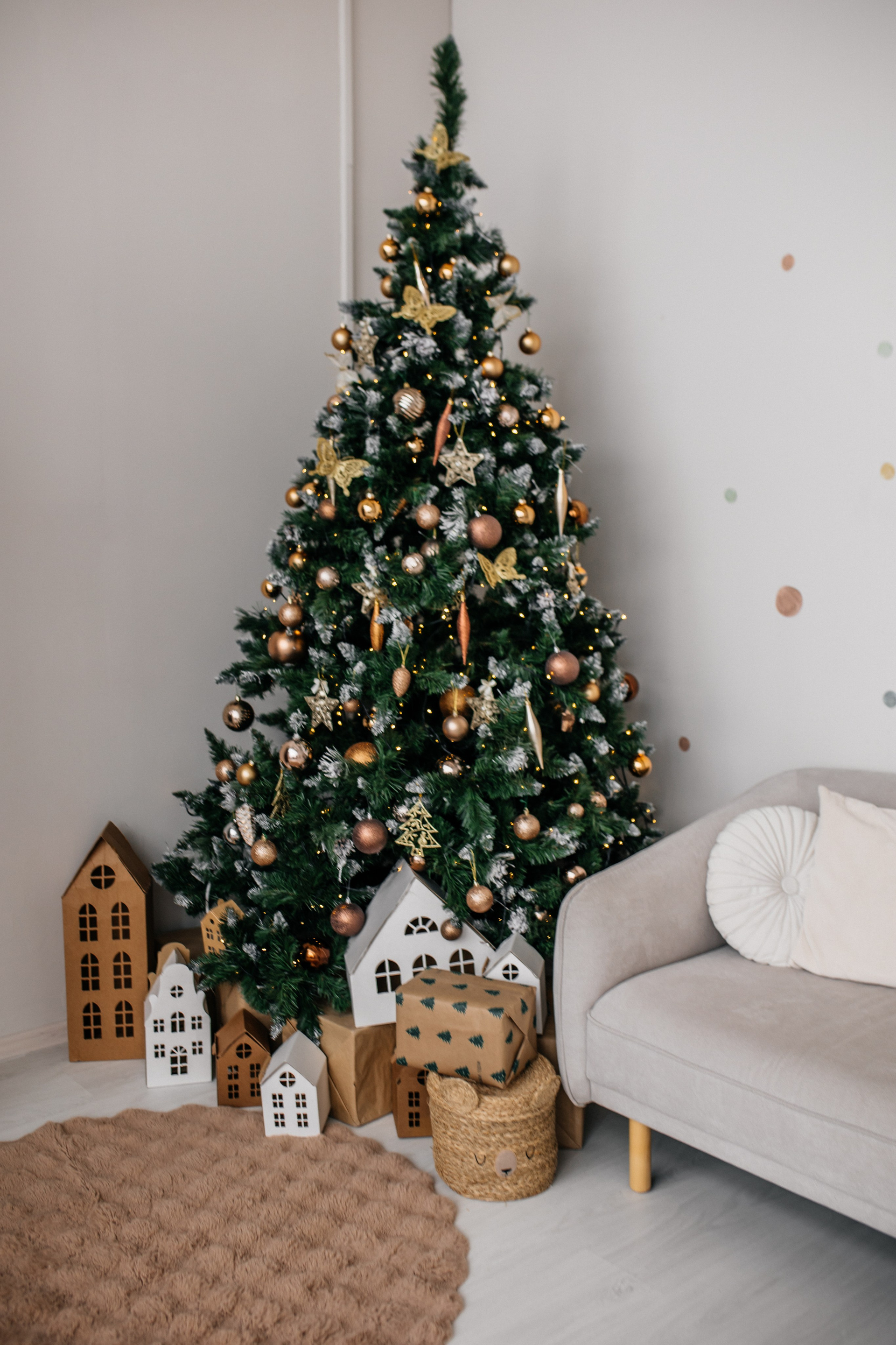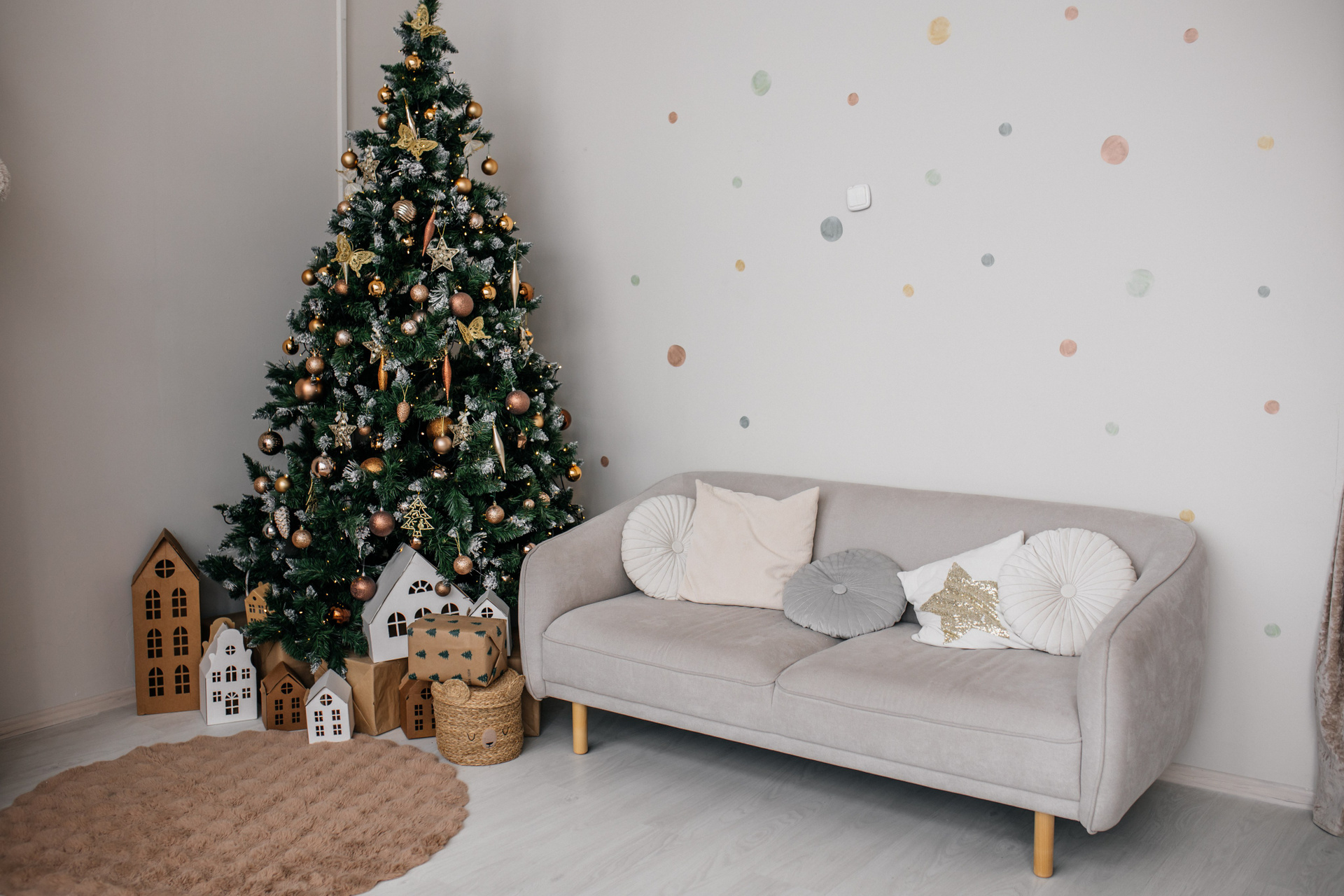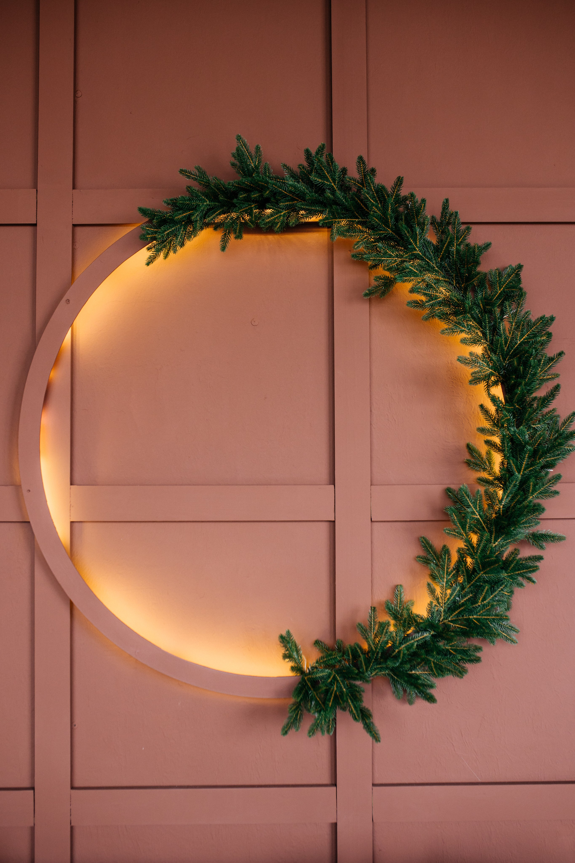Световая стена, подиум 40 м², панорамные окна в пол, эксклюзивная мебель, камин, электрокамин, уникальные элементы декора, четыре литые ёлки очень схожи с натуральными, кровать в зимнем лесу, черно-белый ромбовидны пол, красная стена.