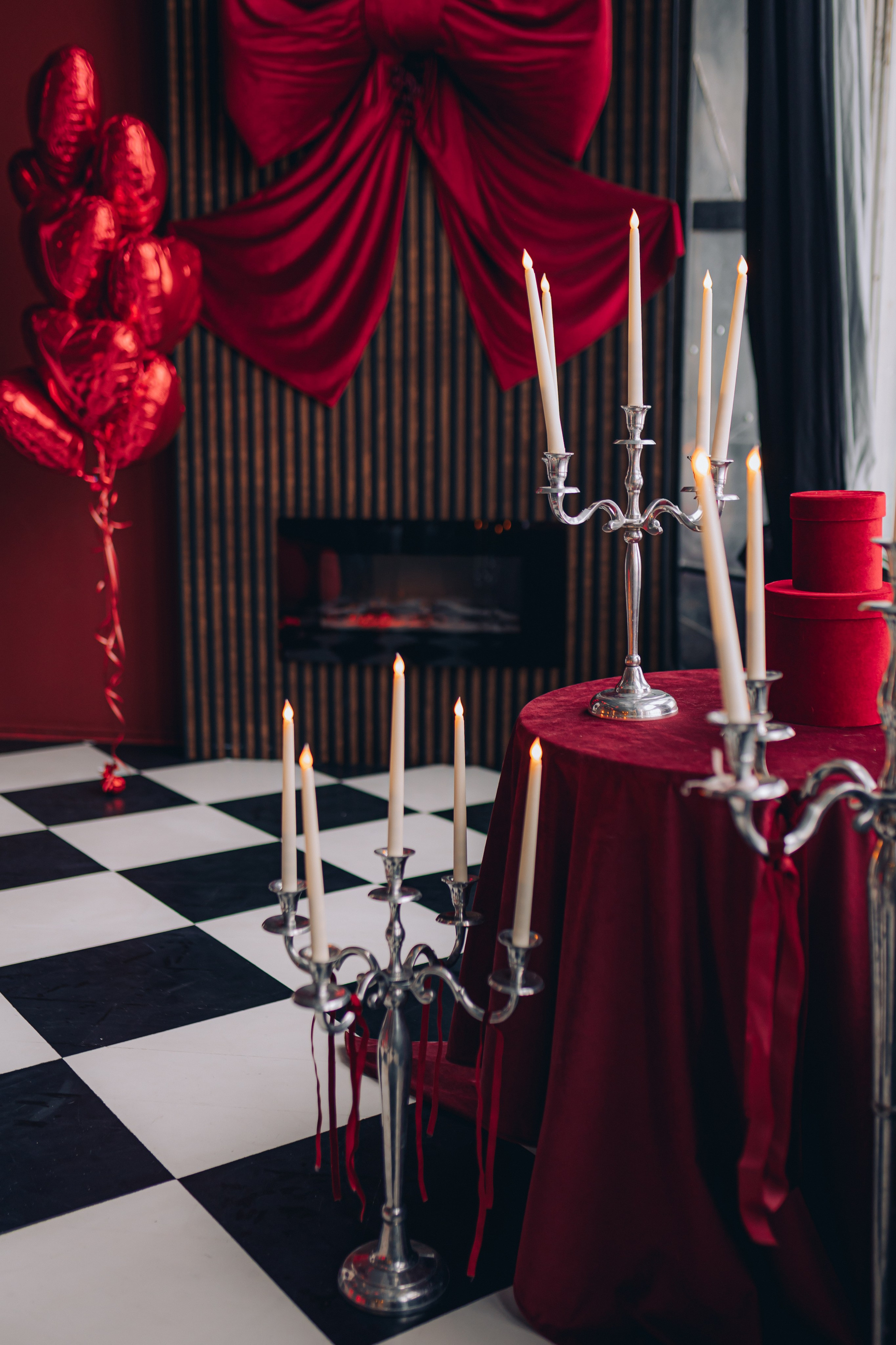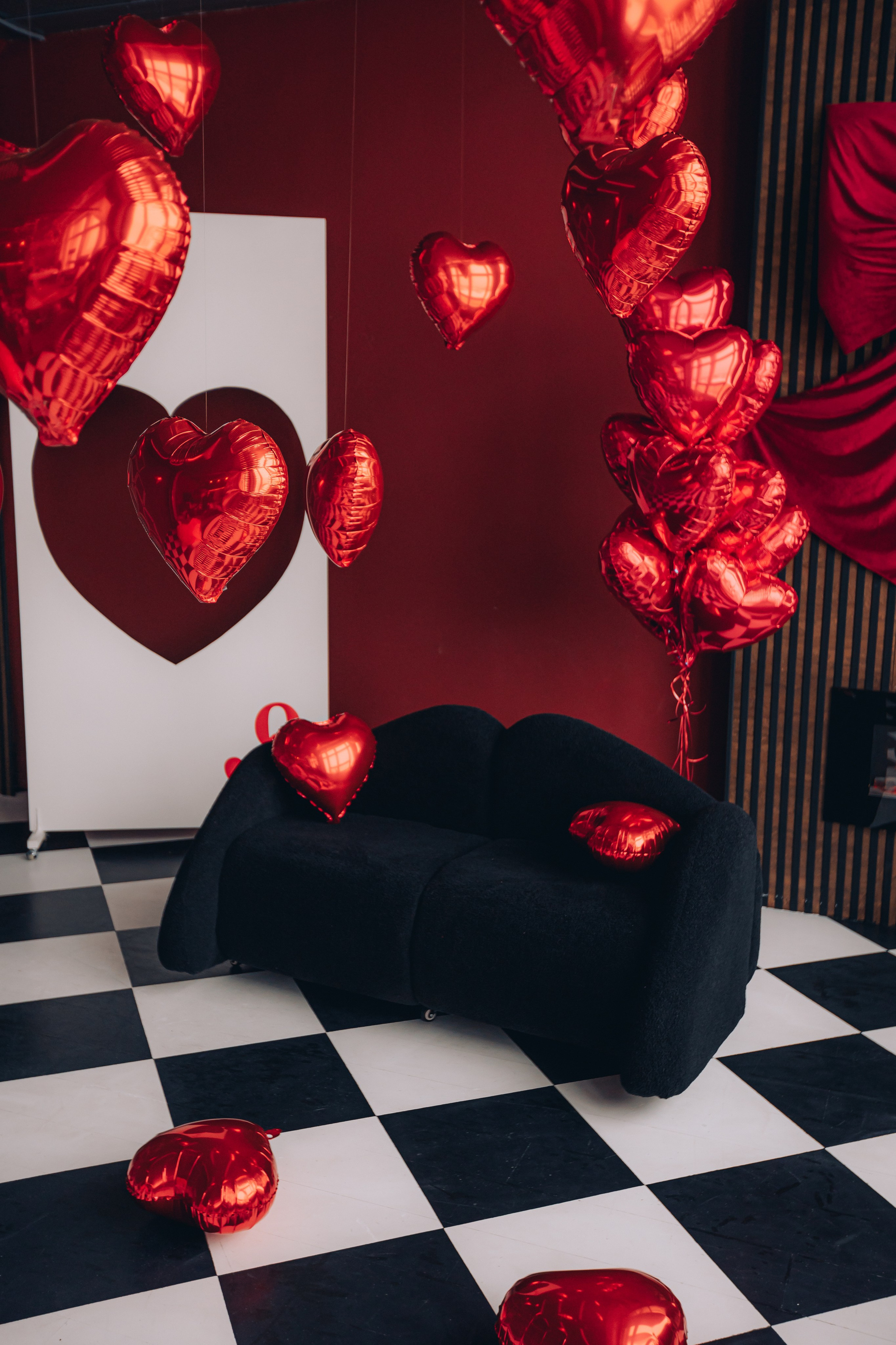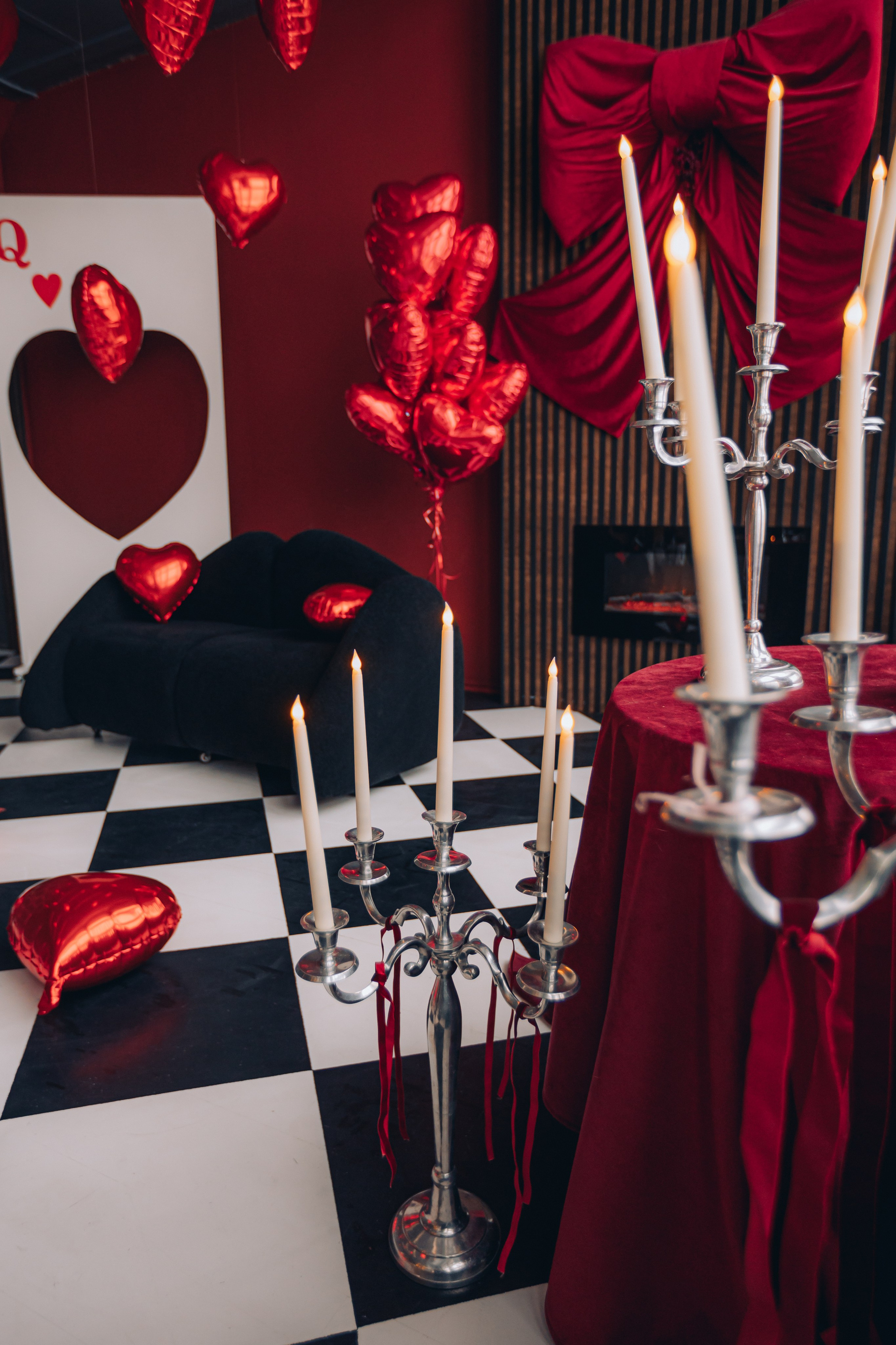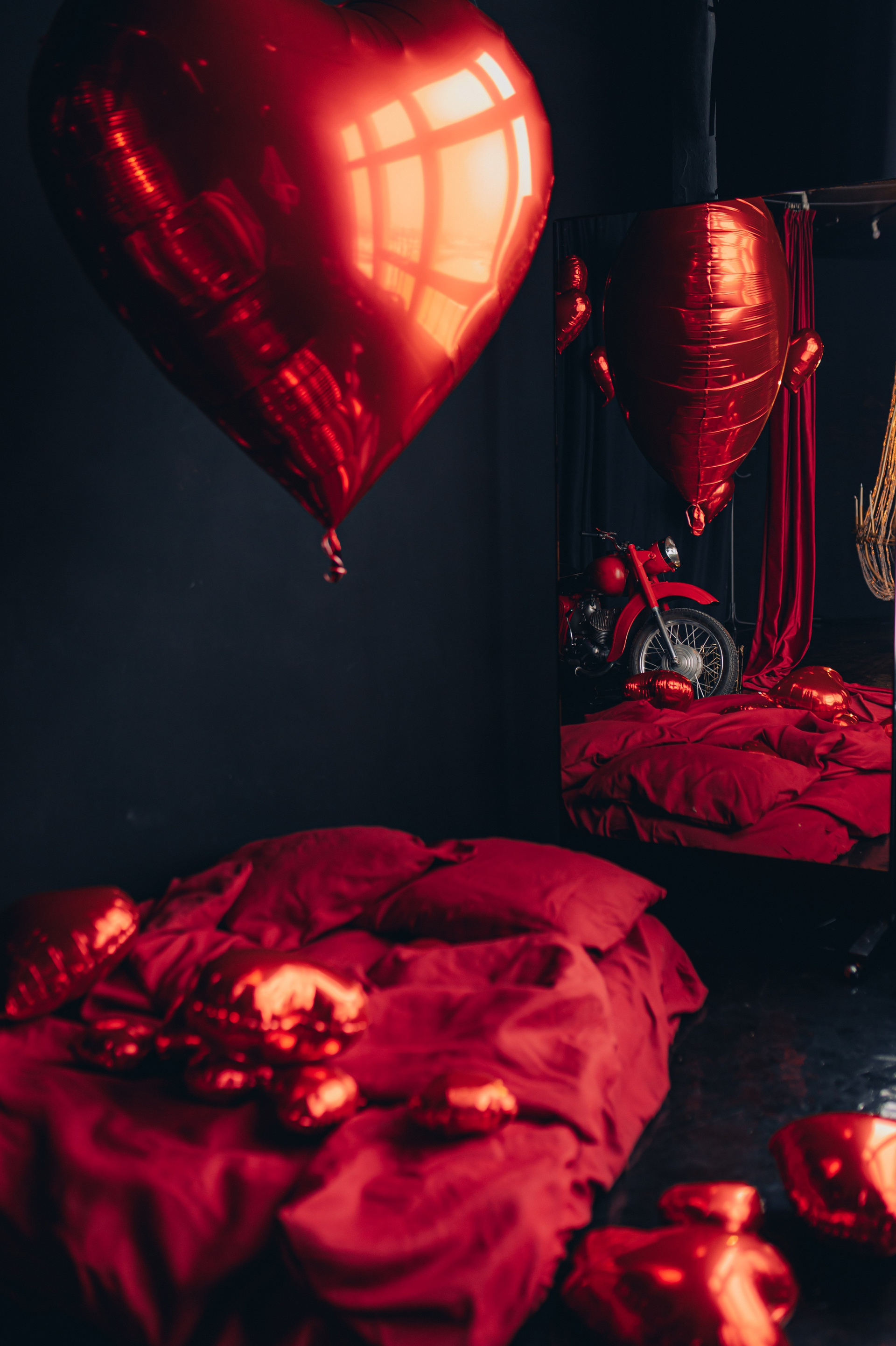 красный мотоцикл, огромная роскошная люстра со свечами (можно садиться), две стильные люстры (можно крепить в любом месте и на разной высоте), дизайнерский диван, арка, черные и красные шторы