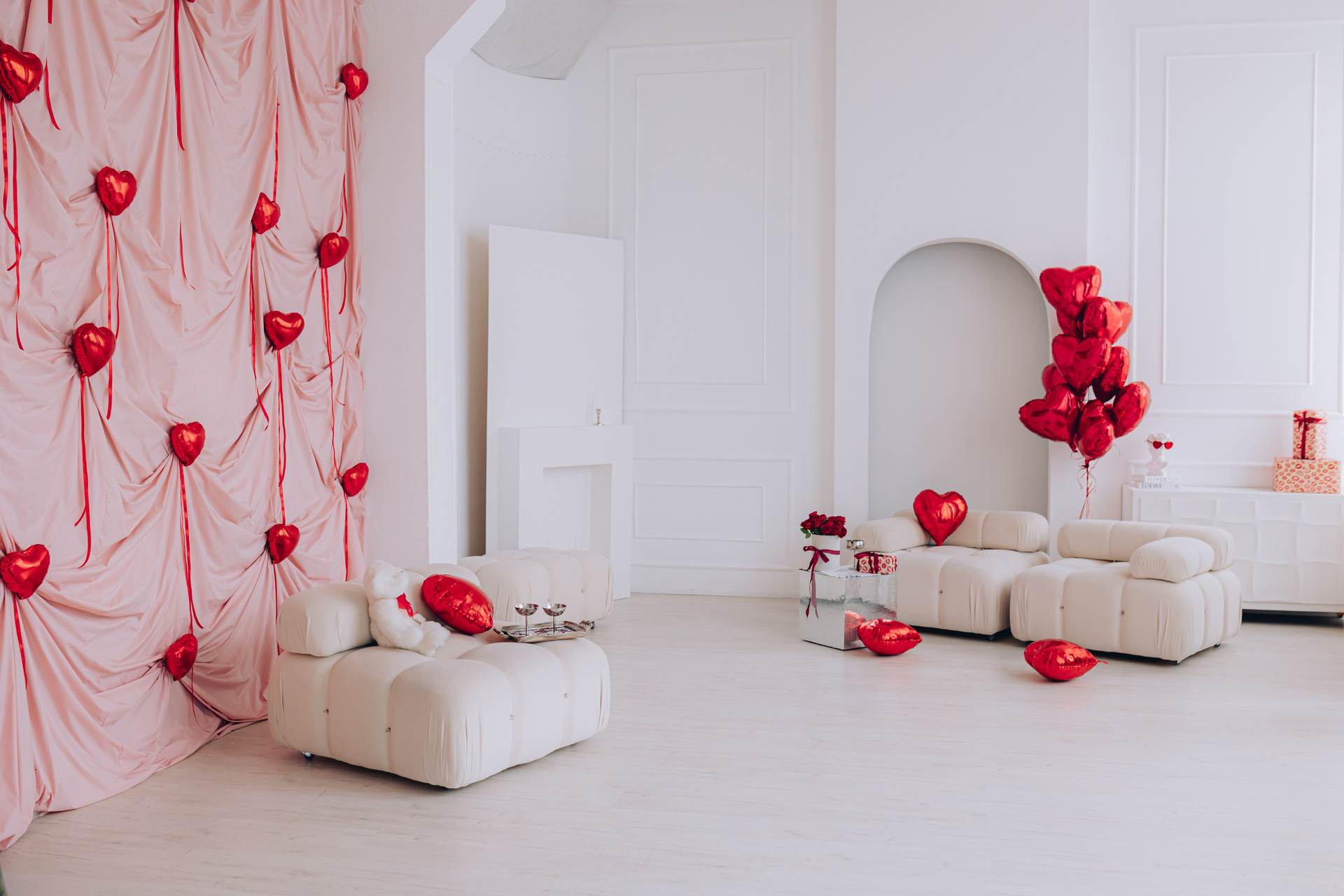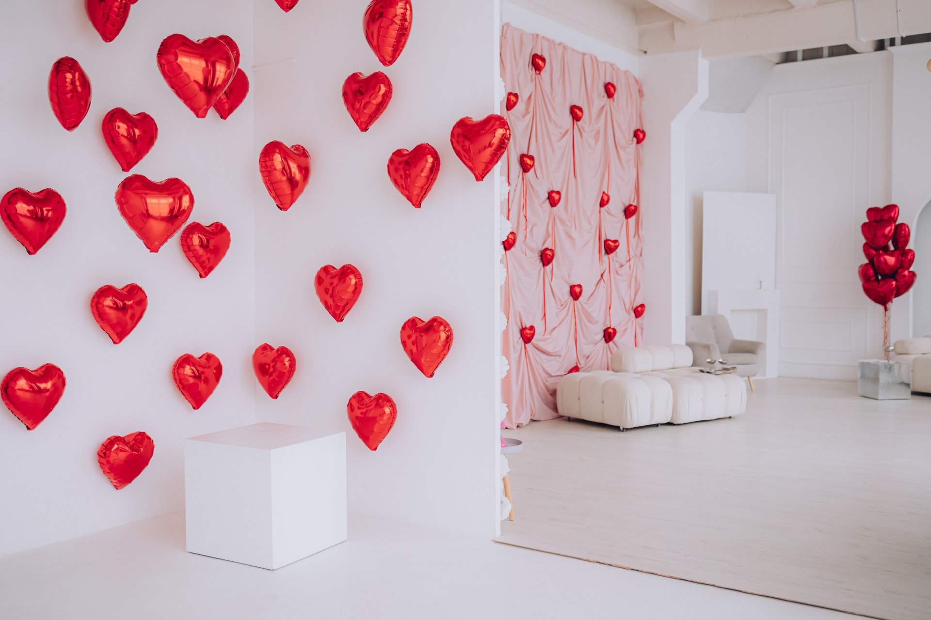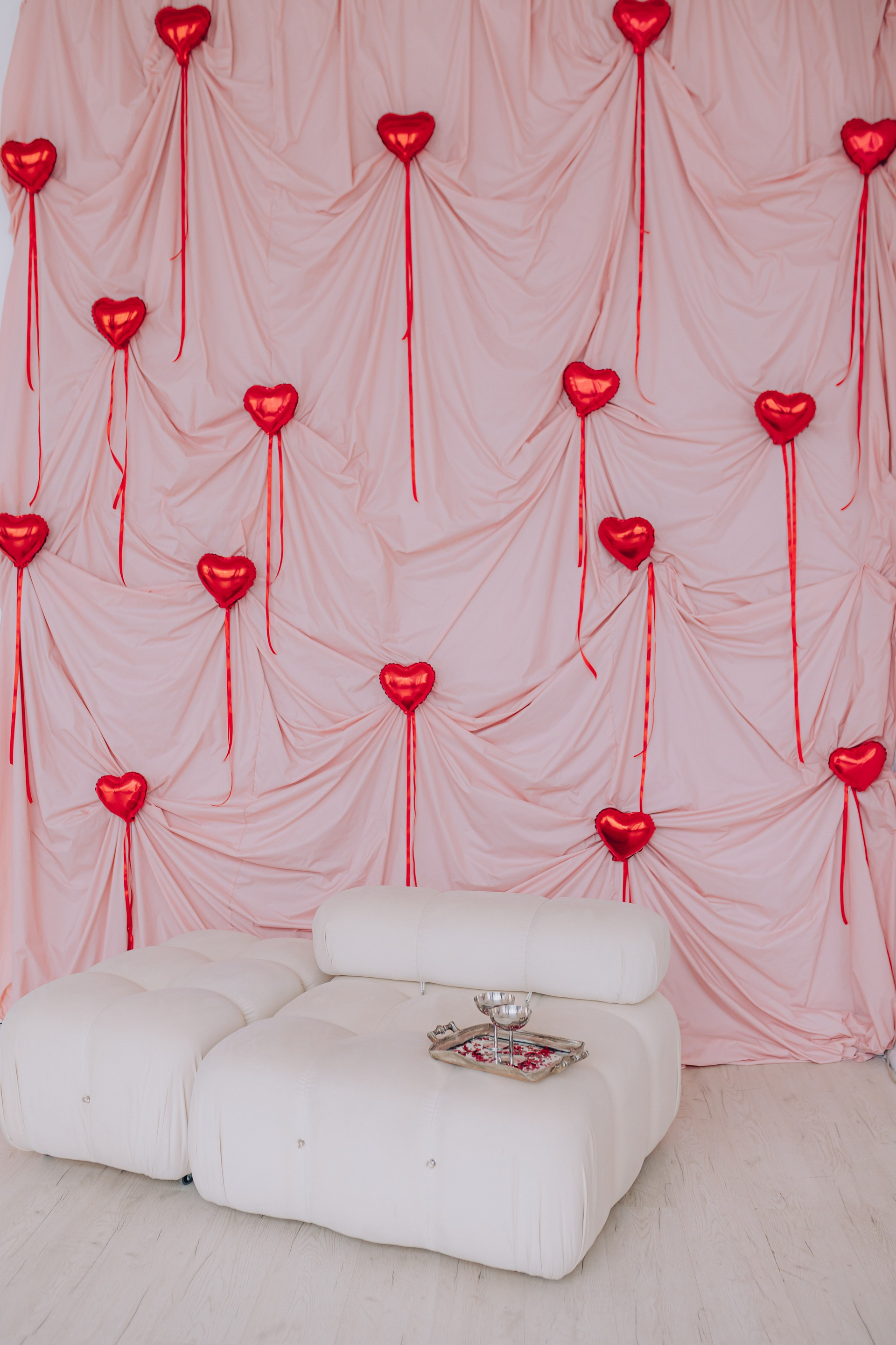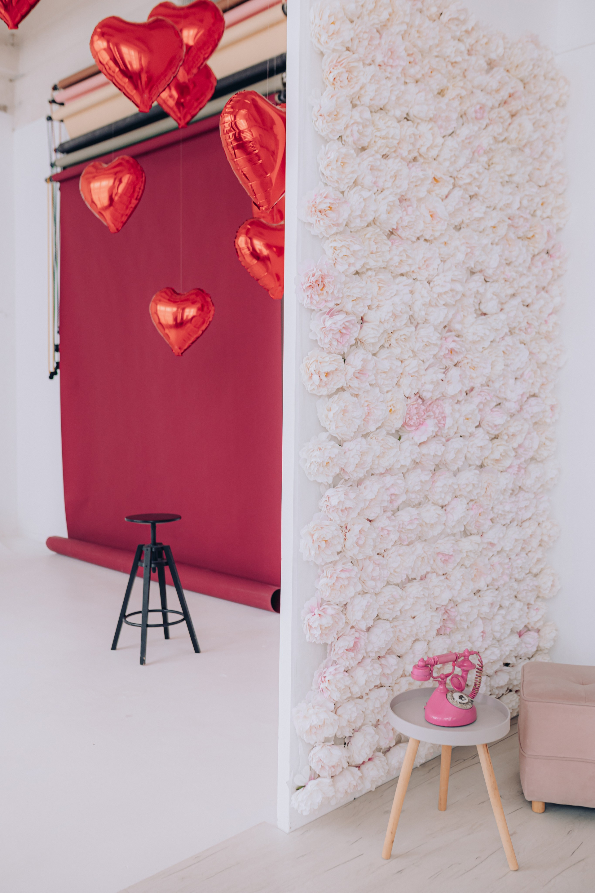 Декор будет установлен до 15 февраля.Общая площадь зала составляет 100 м. кв. В зале находится большая циклорама, так же есть бумажные фоны
