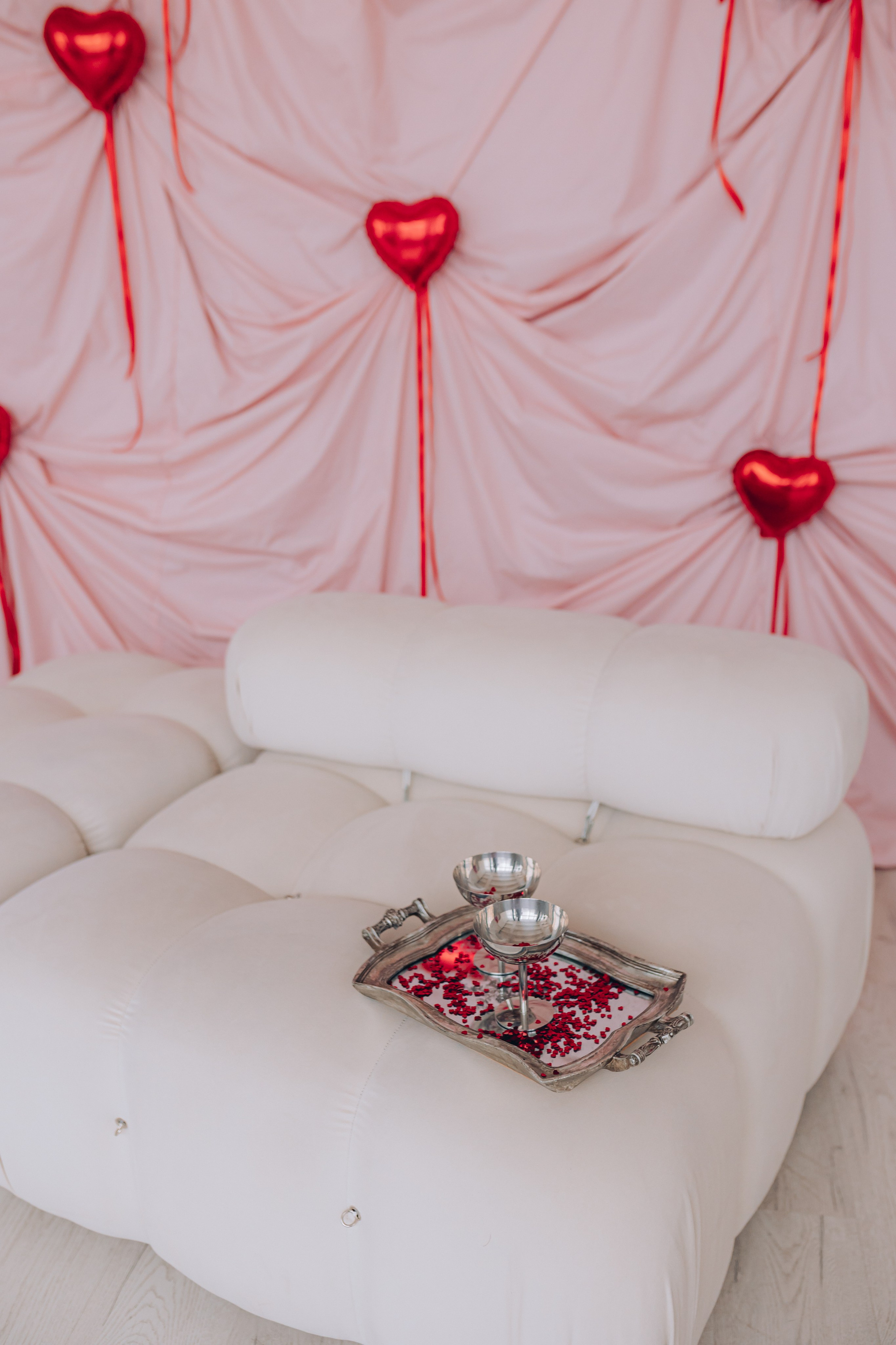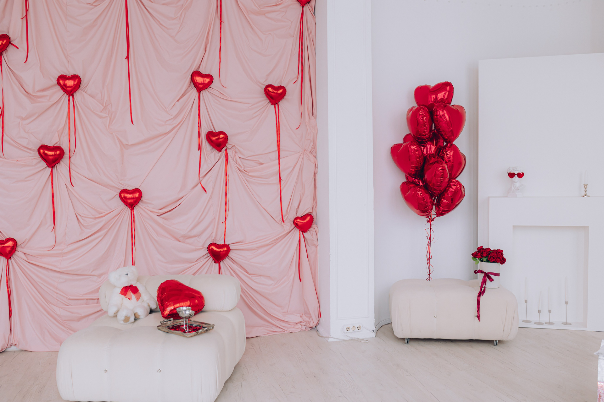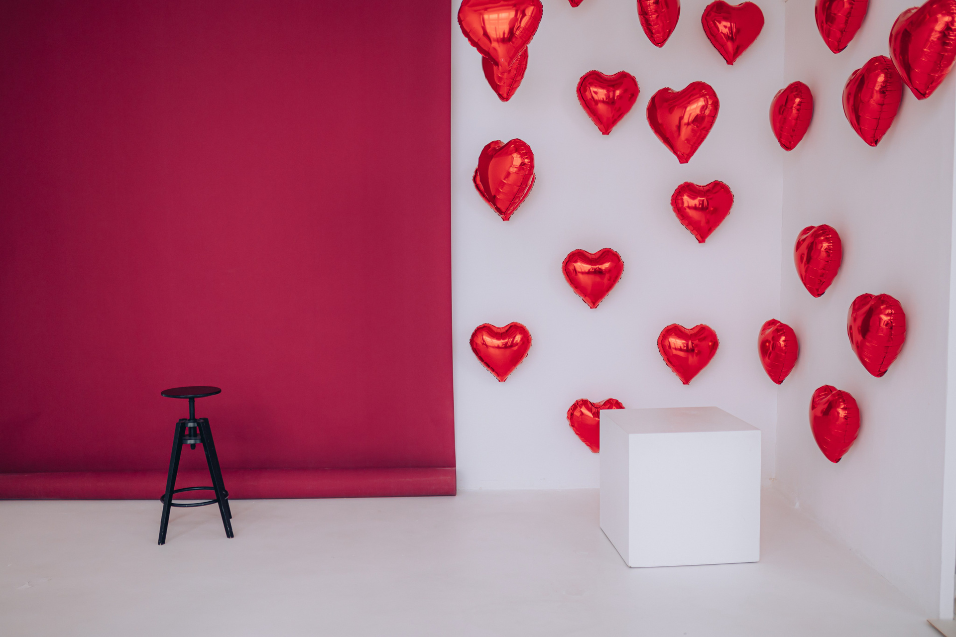 Декор будет установлен до 15 февраля.Общая площадь зала составляет 100 м. кв. В зале находится большая циклорама, так же есть бумажные фоны