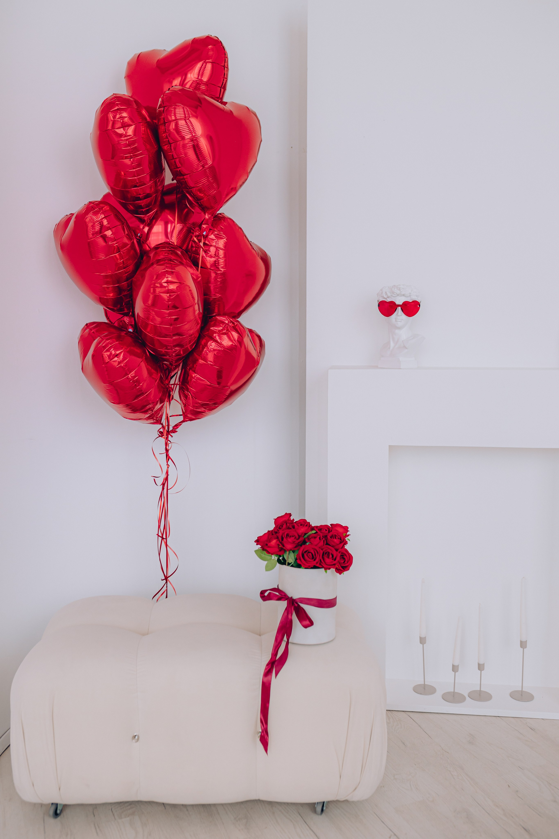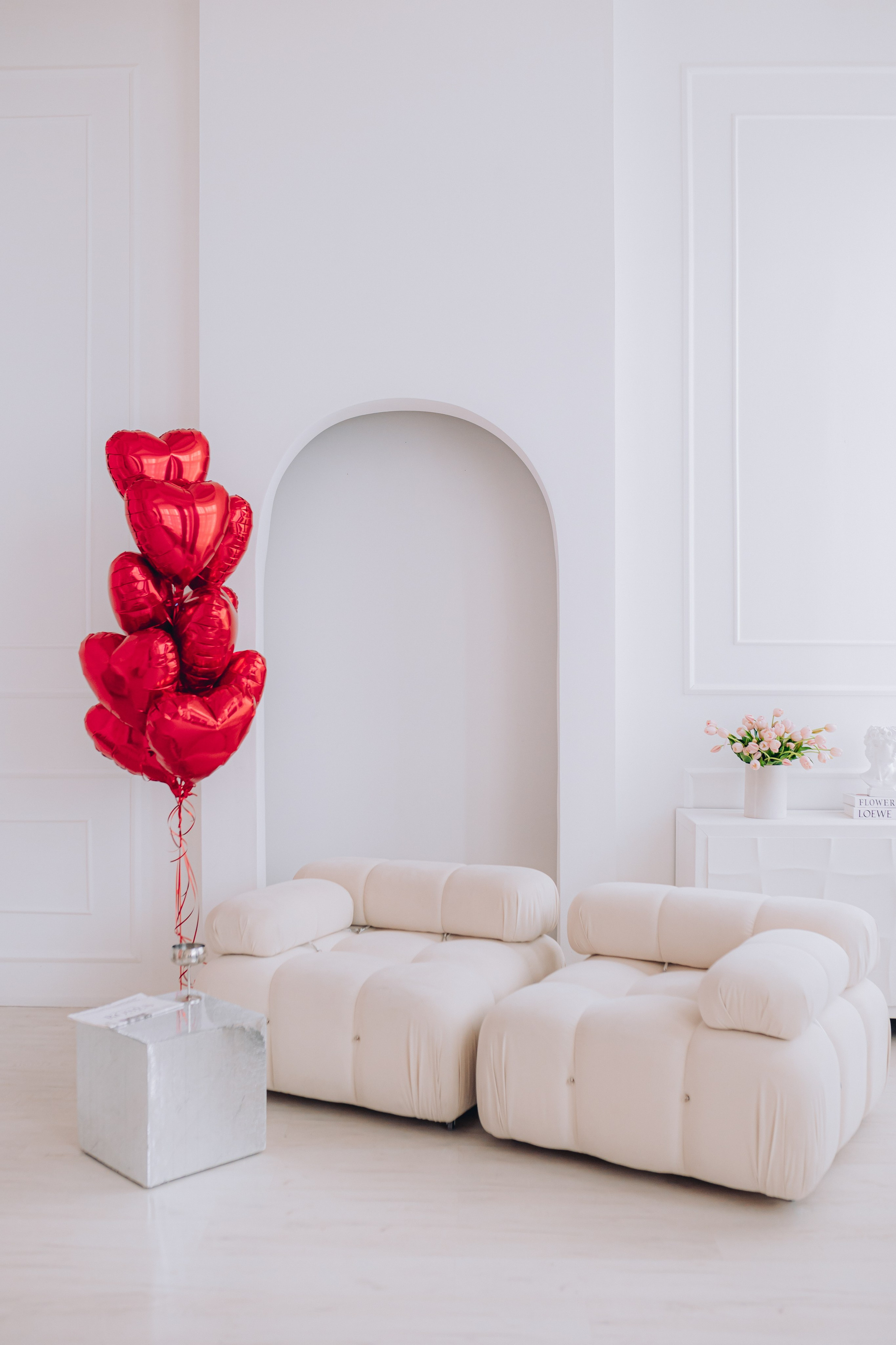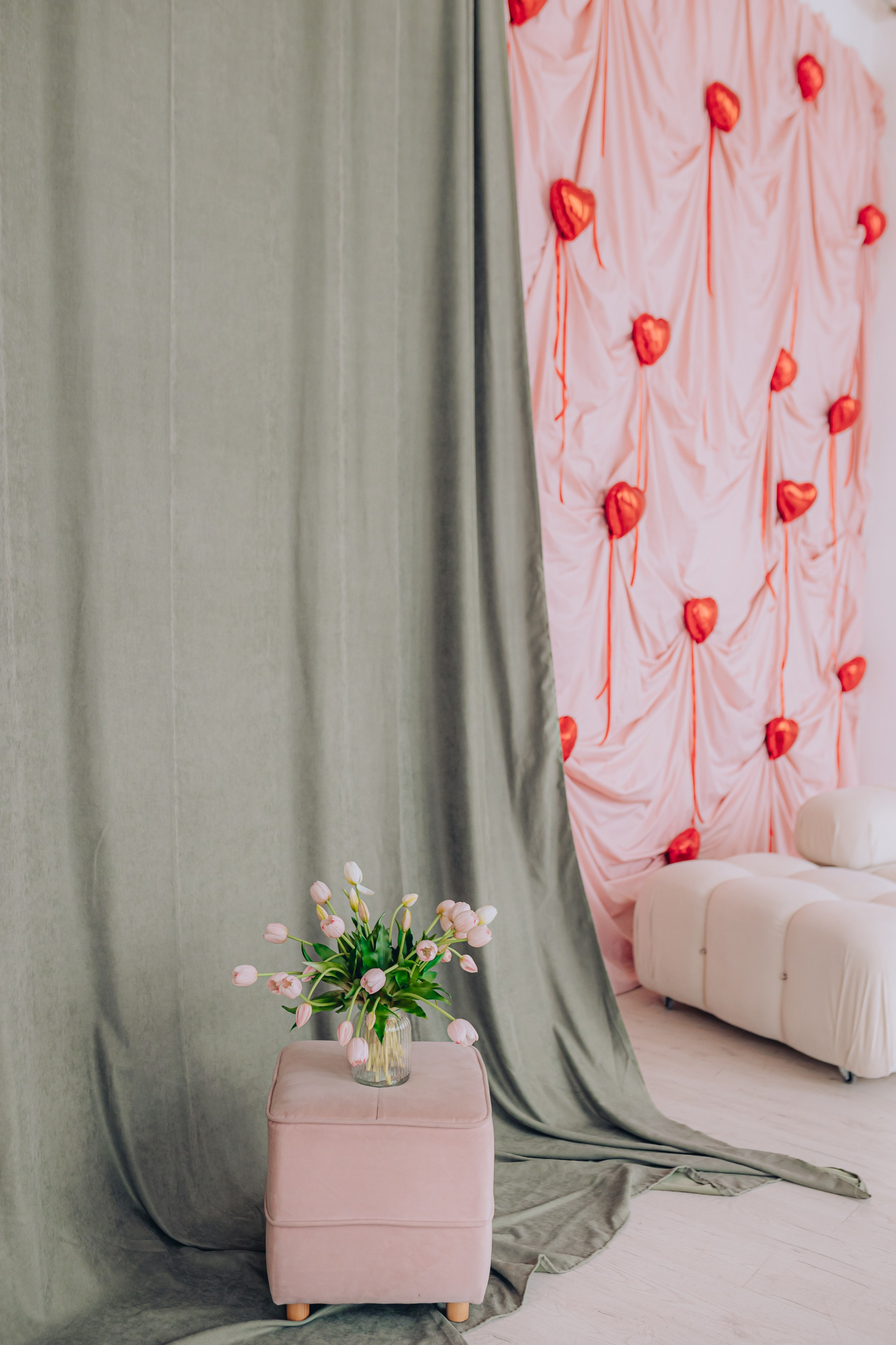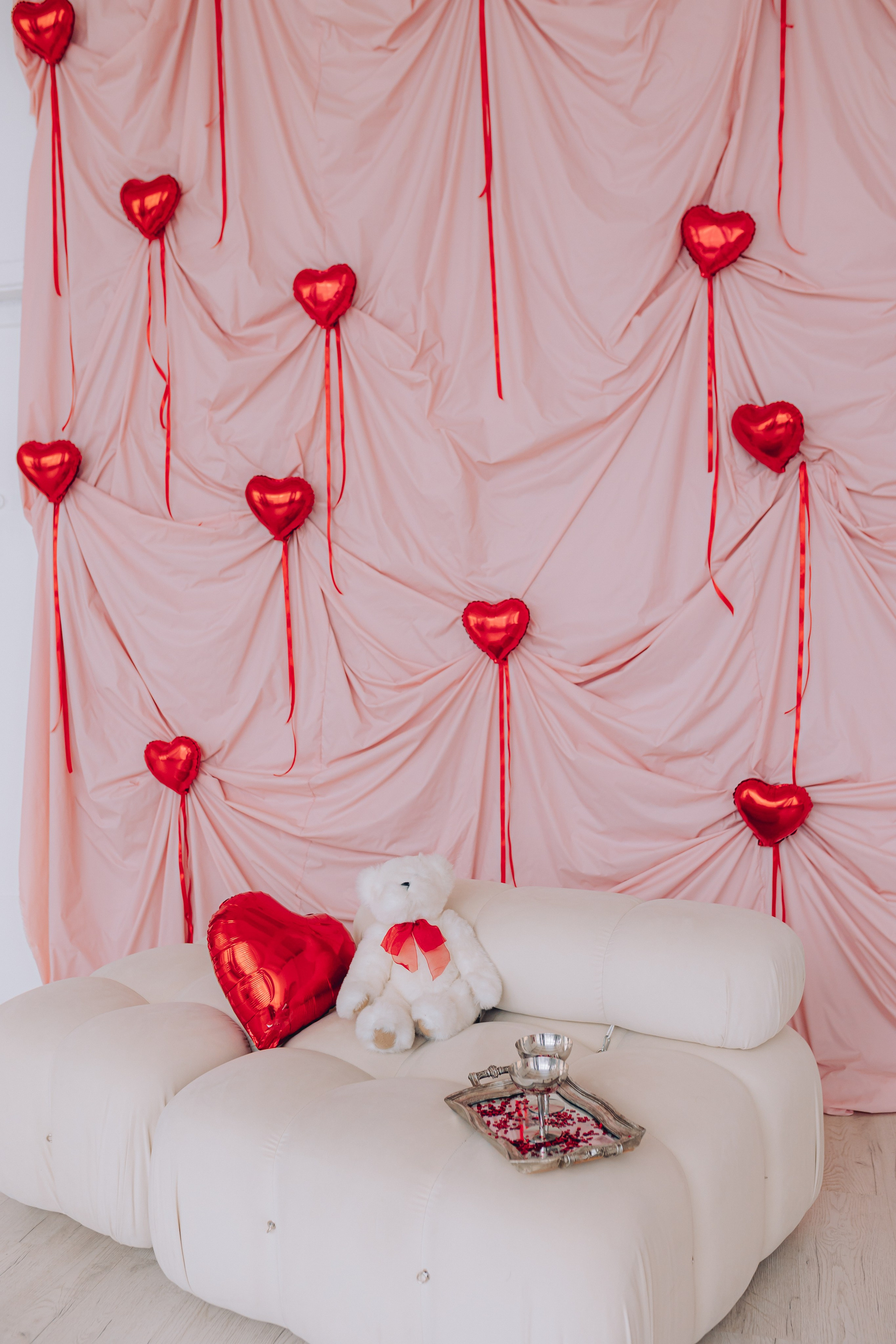 Декор будет установлен до 15 февраля.Общая площадь зала составляет 100 м. кв. В зале находится большая циклорама, так же есть бумажные фоны