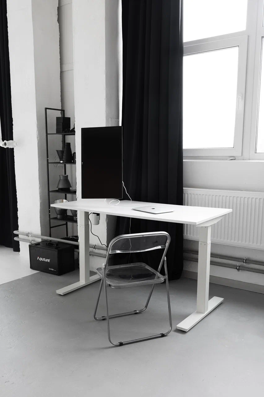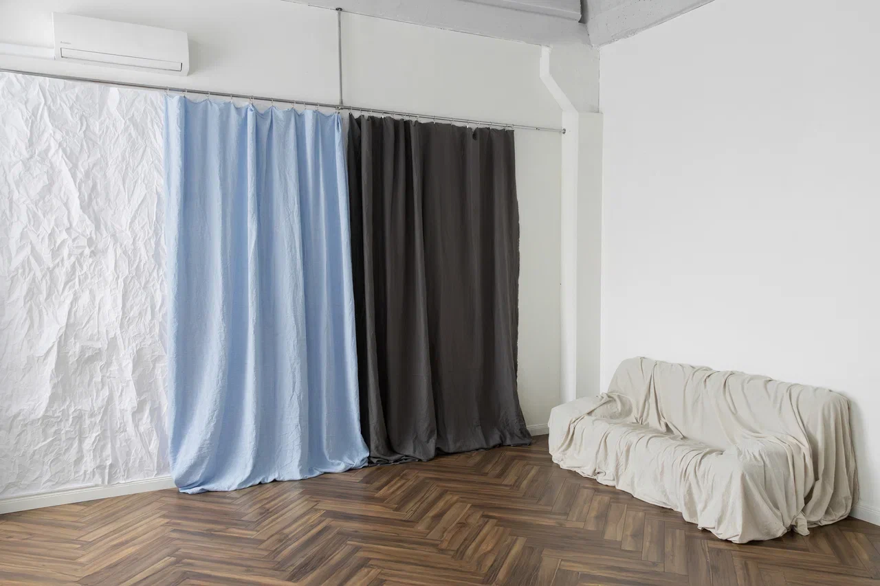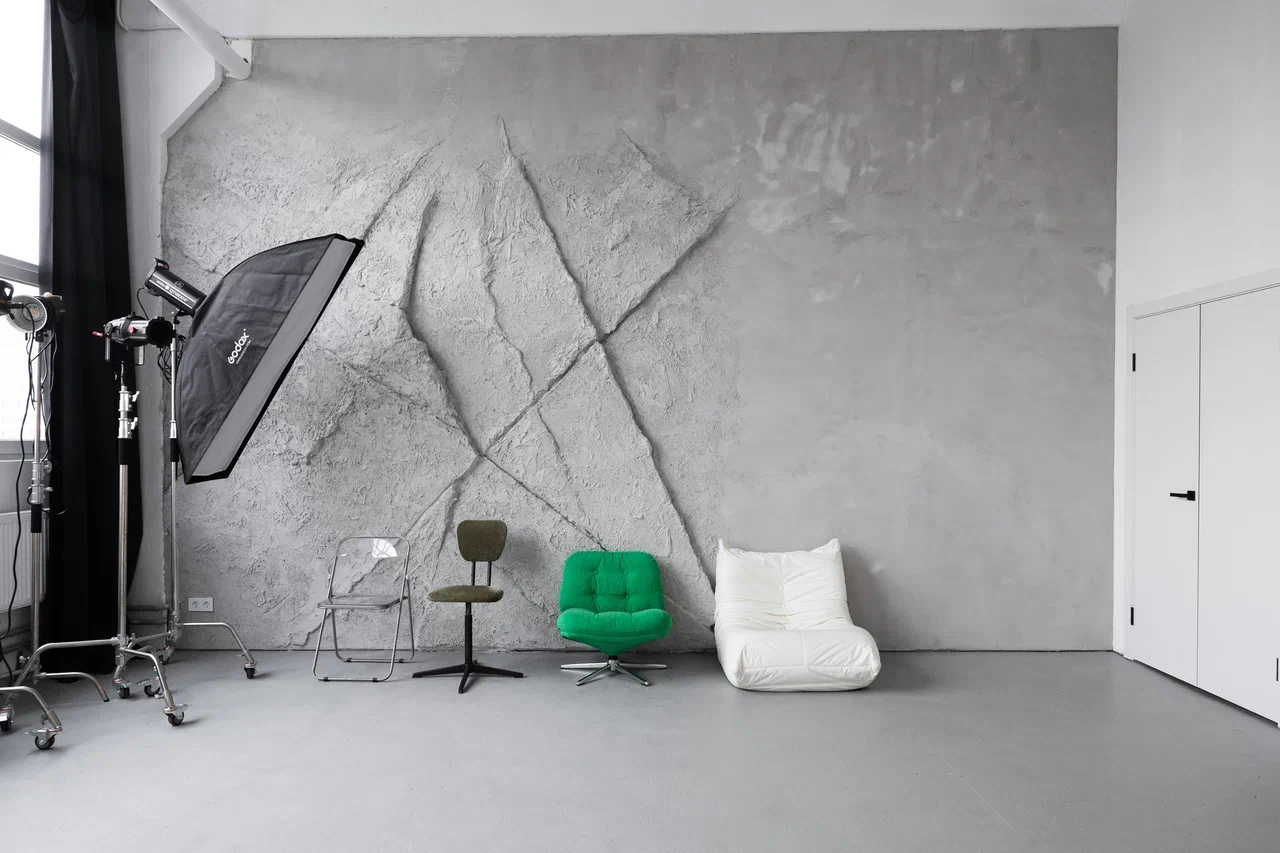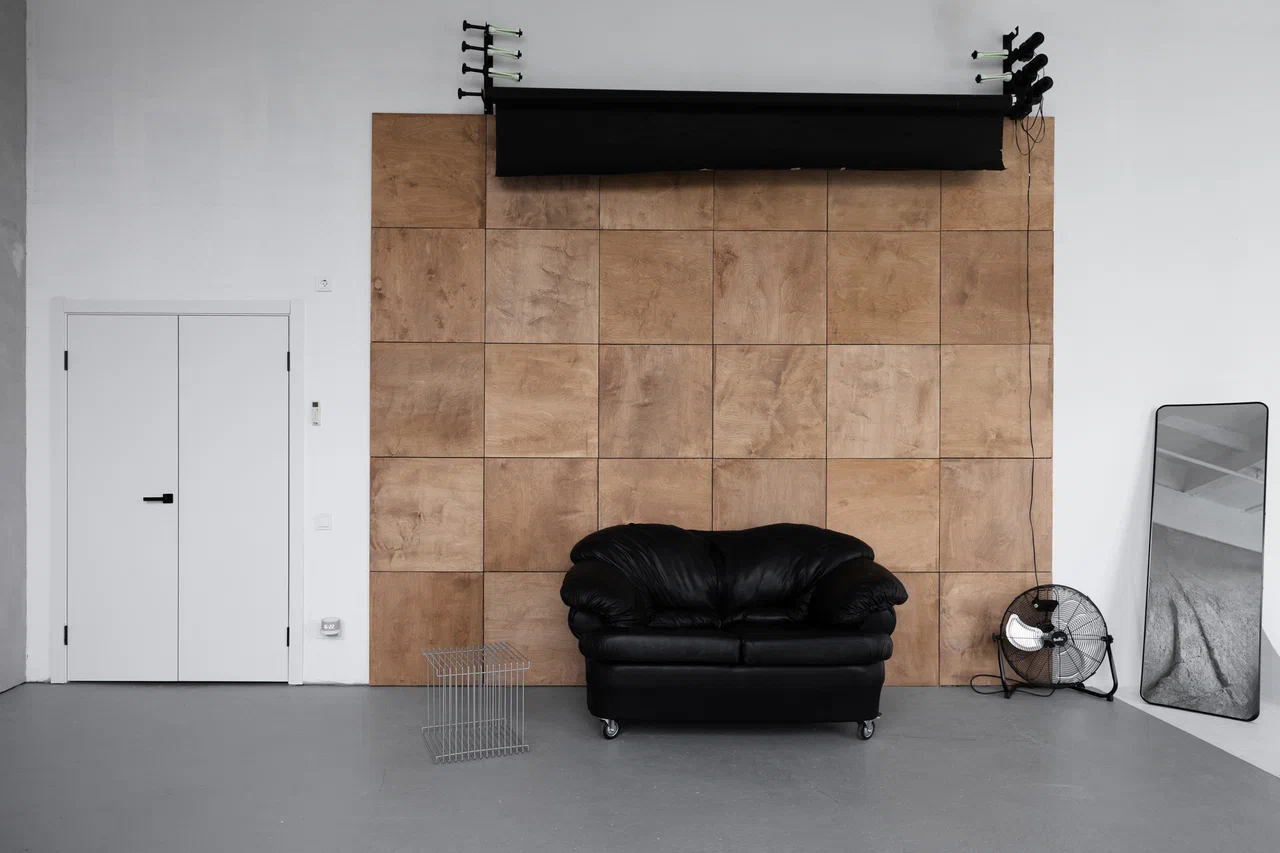 Просторный зал 80 кв. м. с огромными окнами на южной стороне. В зале есть большая угловая циклорама 6 на 7 метров, трендовая деревянная стена, уникальная стена в виде скалы. Также есть автоматическая система подъемных фонов с черным бумажным фоном, рейл, вентилятор, разная стильная минималистичная мебель.