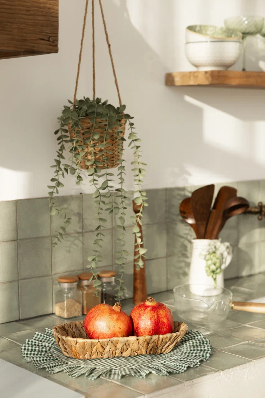 ✨яркая кухня с лестницей, большим количеством хвои, сервированным столом и яркими деталями на полочках