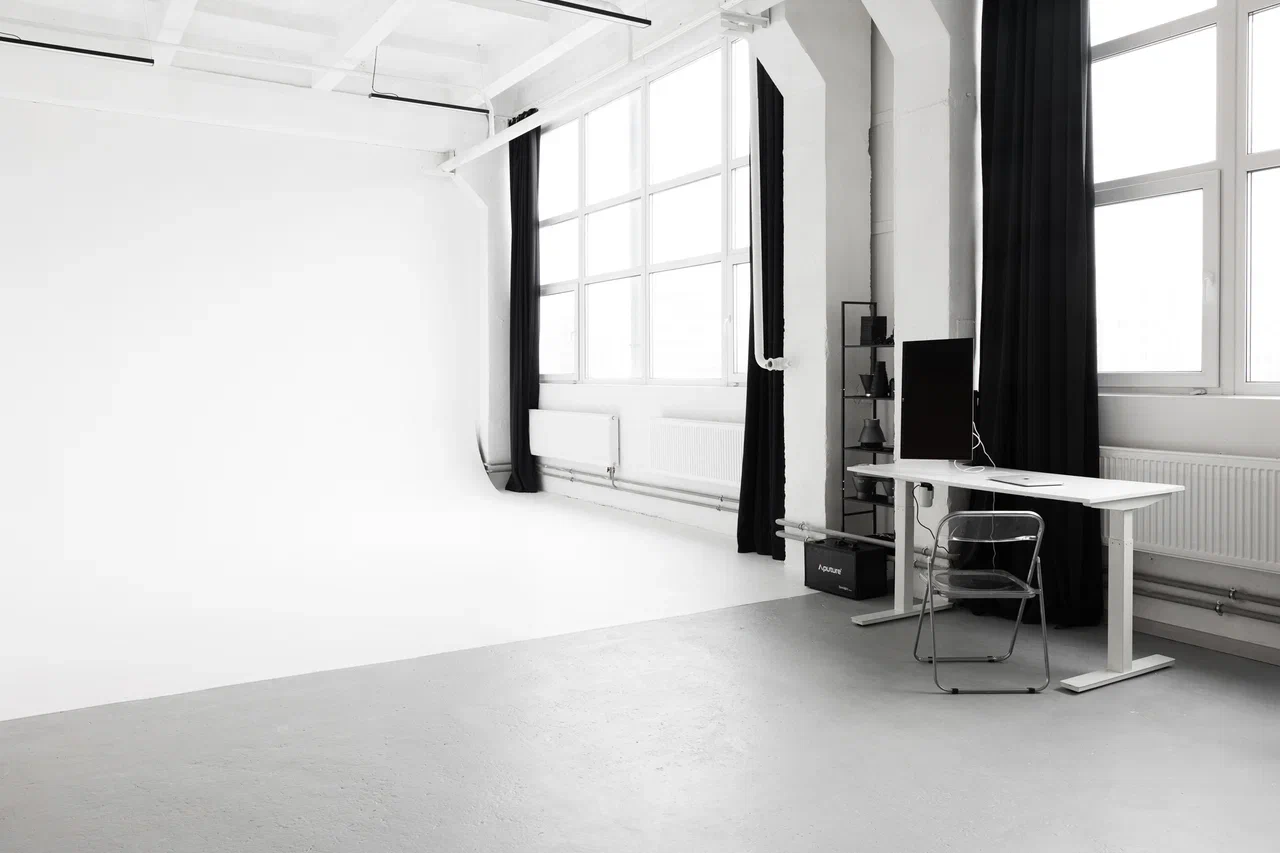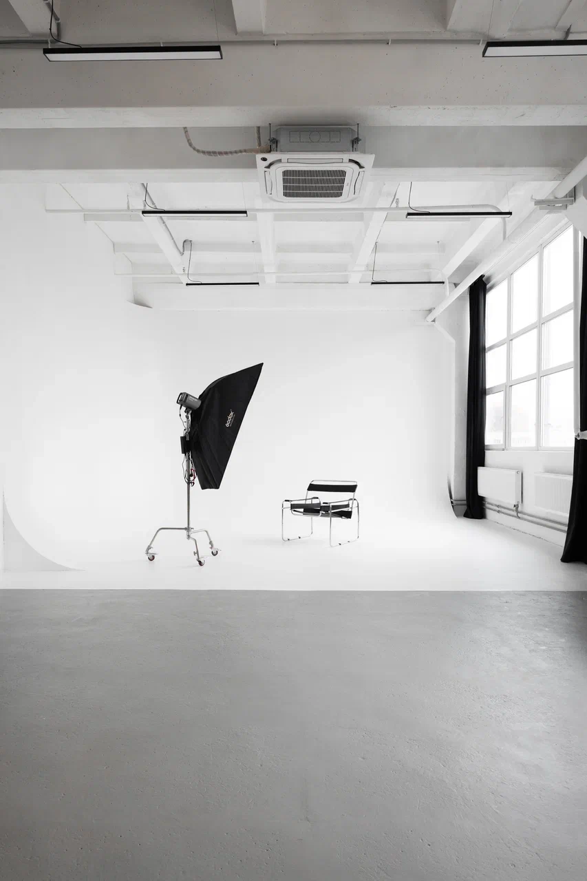 Большой зал 80 квадратных метров с фотозонами для съемок в минималистичном стиле.