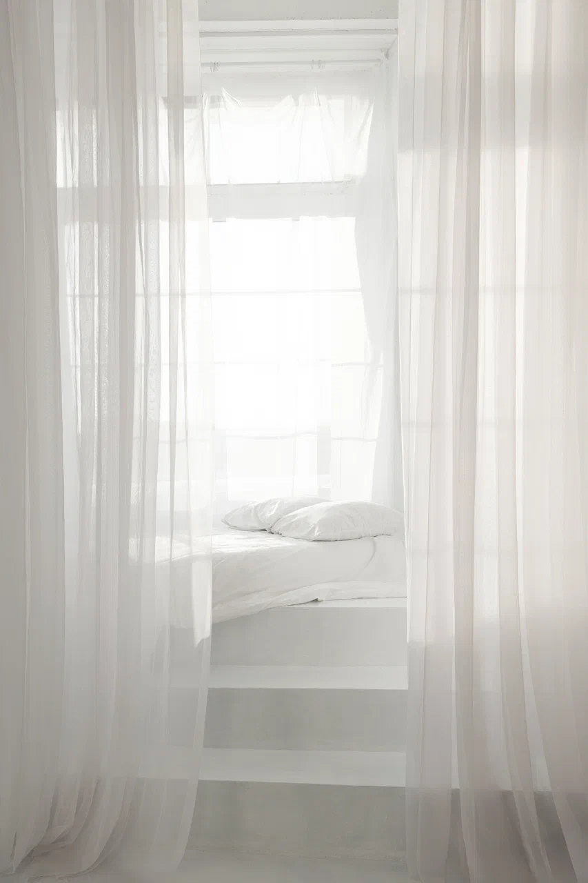 — матрас с белым постельным бельем на подиуме, окутанный воздушной вуалью