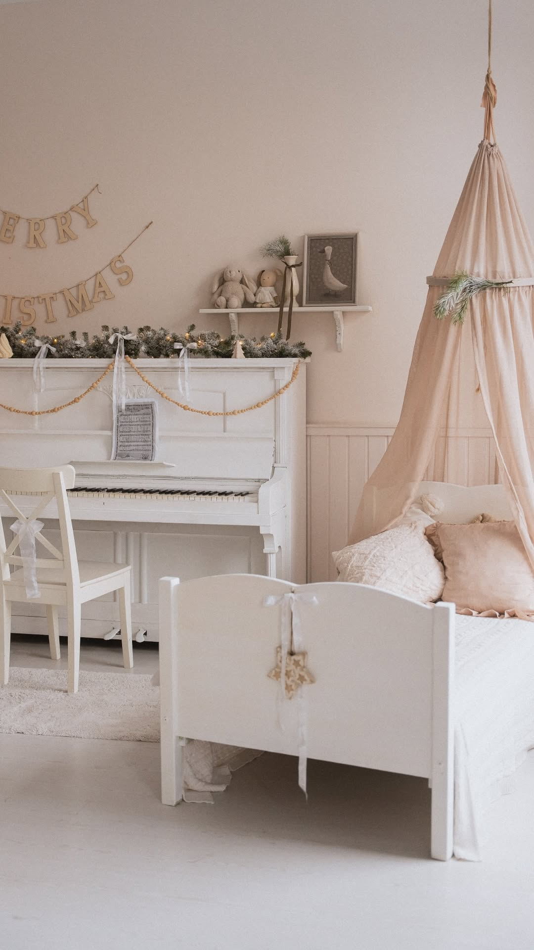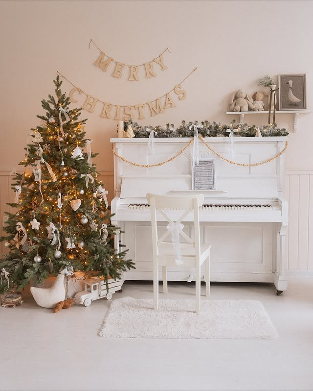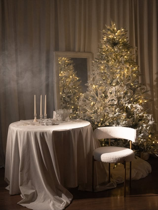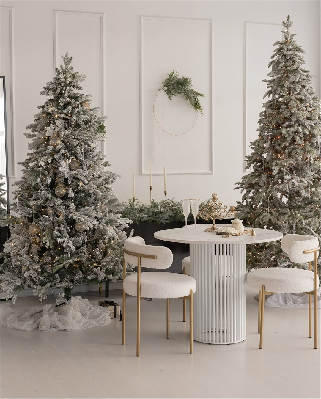 «Белое сияние» — элегантные ёлки, золото в деталях и мягкий свет. Лёгкость, стиль и праздничная магия в каждом кадре.