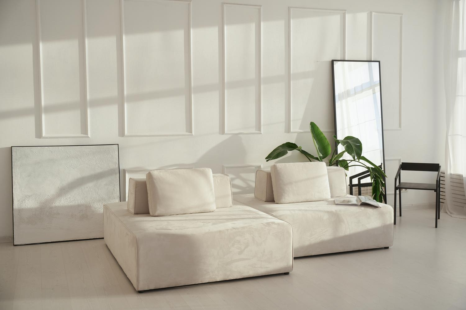 Зал LOFT 70 кв. метров съёмочного пространства с панорамными окнами, циклорамой и минималистичным интерьером, потолки 3,3 метра, блэкаут шторы.