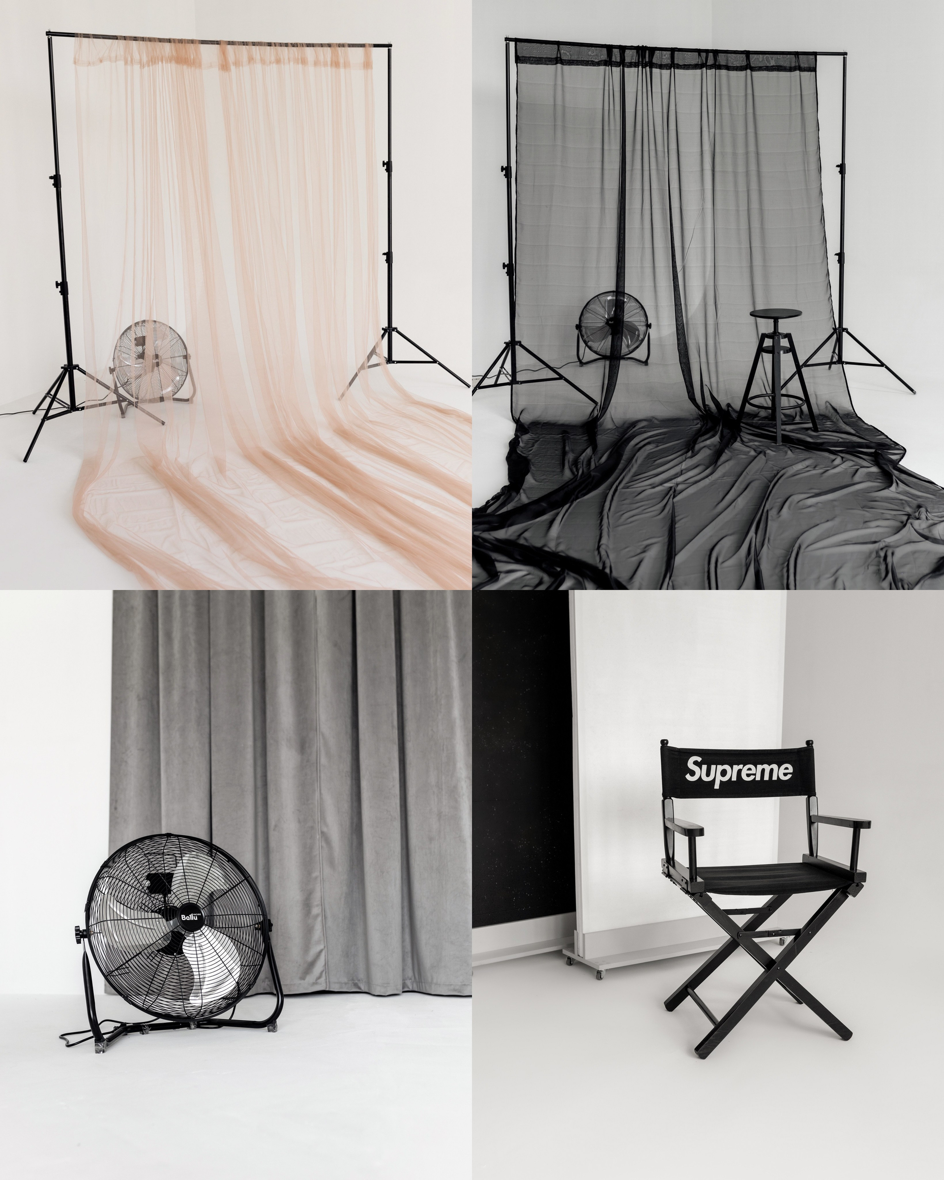 В зале белая циклорама 6×7 м. Все подошвы съёмочной обуви должны быть заклеены скотчем, т. к. циклорама белого цвета и незаклеенная обувь может оставлять черные полосы или следы.