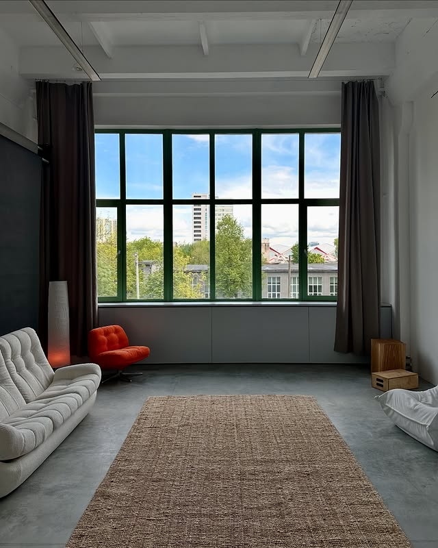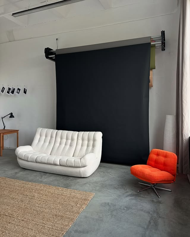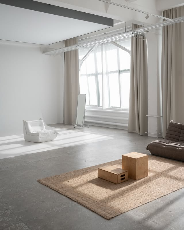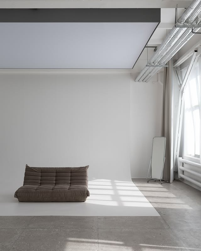 Это просторный зал с циклорамой и подсветкой lightbox, большими окнами на восточной стороне (имеются тюль и шторы), стильной мебелью