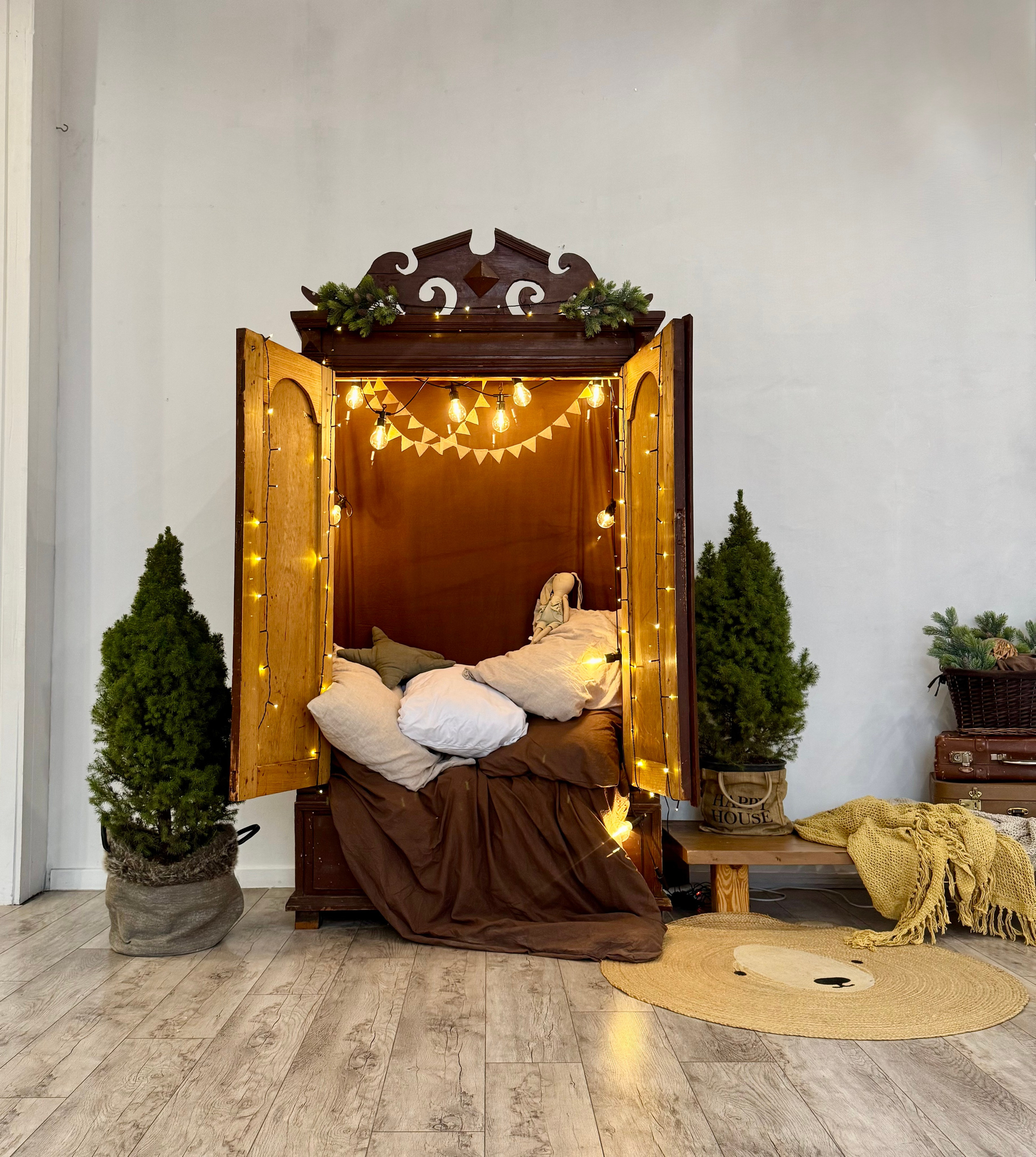 В основе — дерево, зелень, коричневые и карамельные оттенки, натуральные ткани и живые ели.