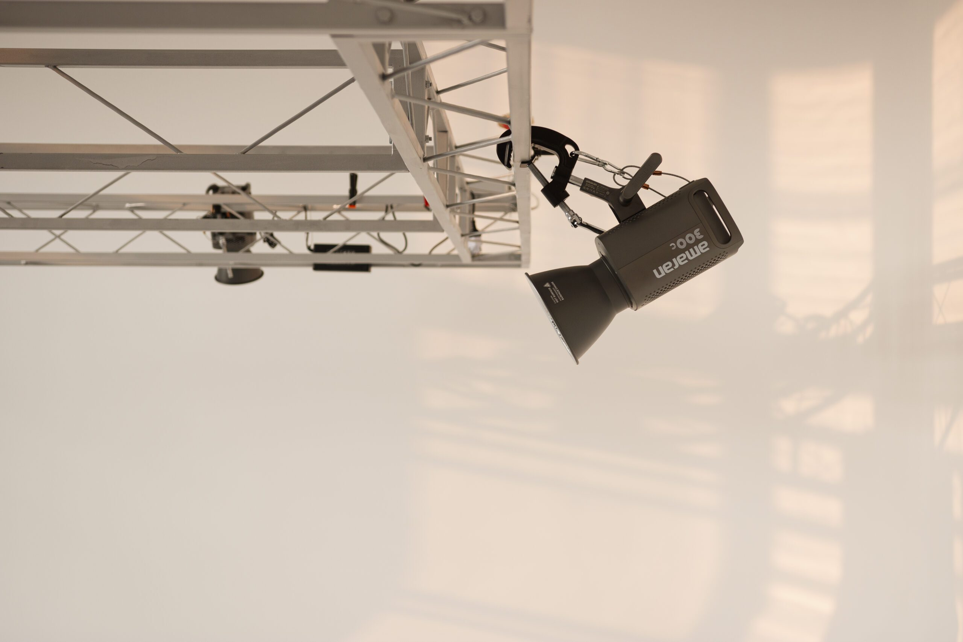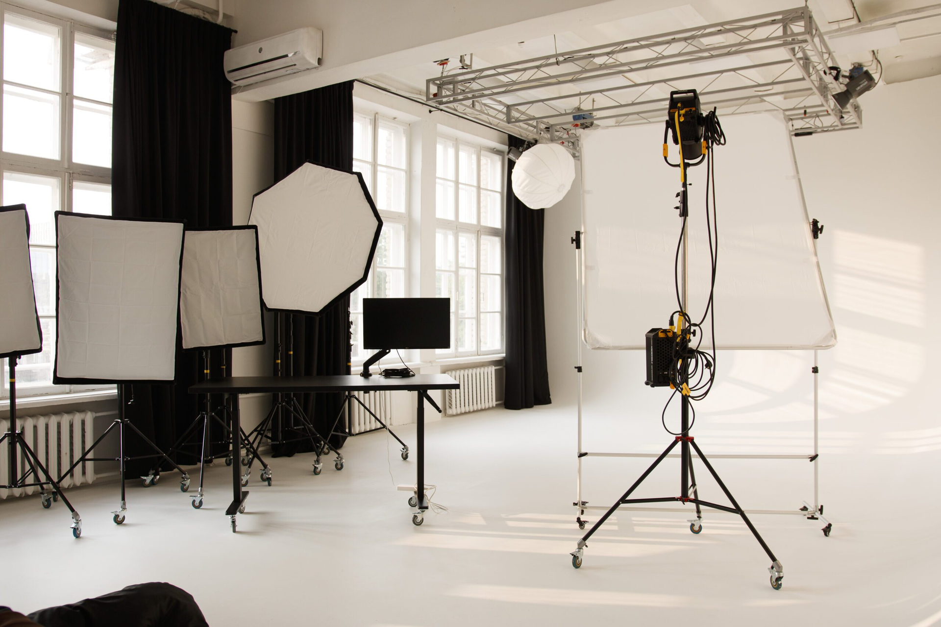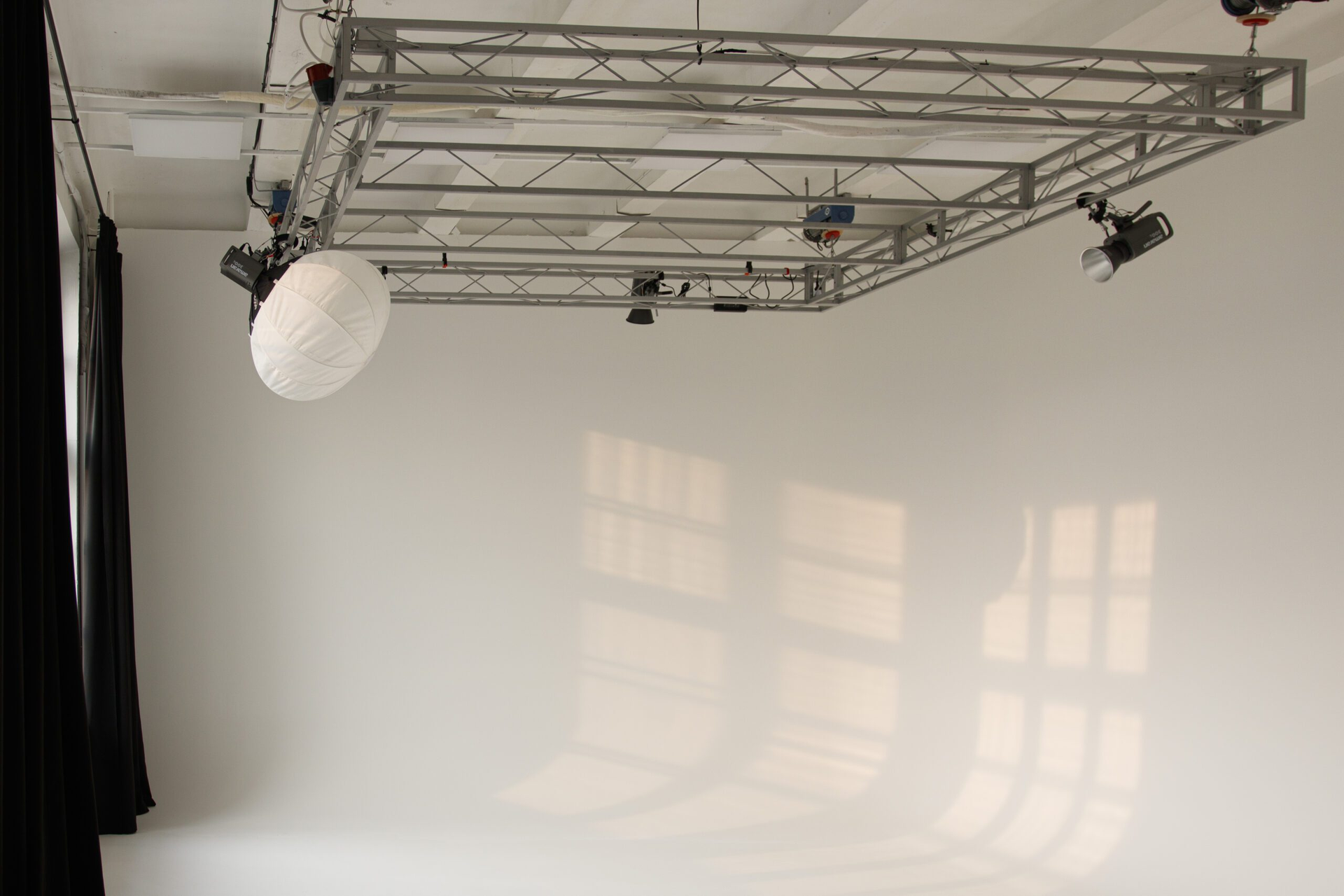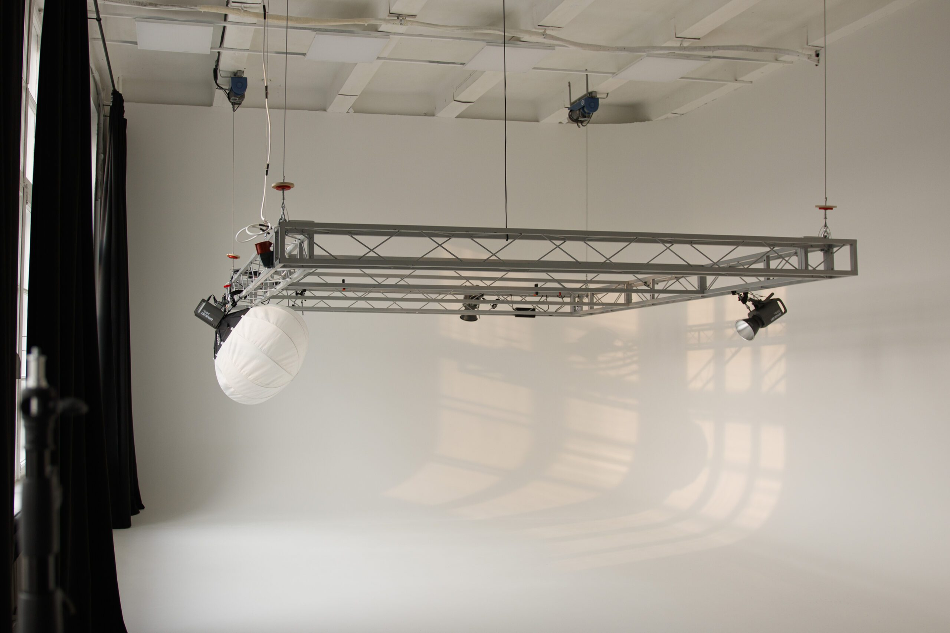 Зал оборудован всем необходимым для профессиональных съемок, включая сценическую ферму и световую систему.