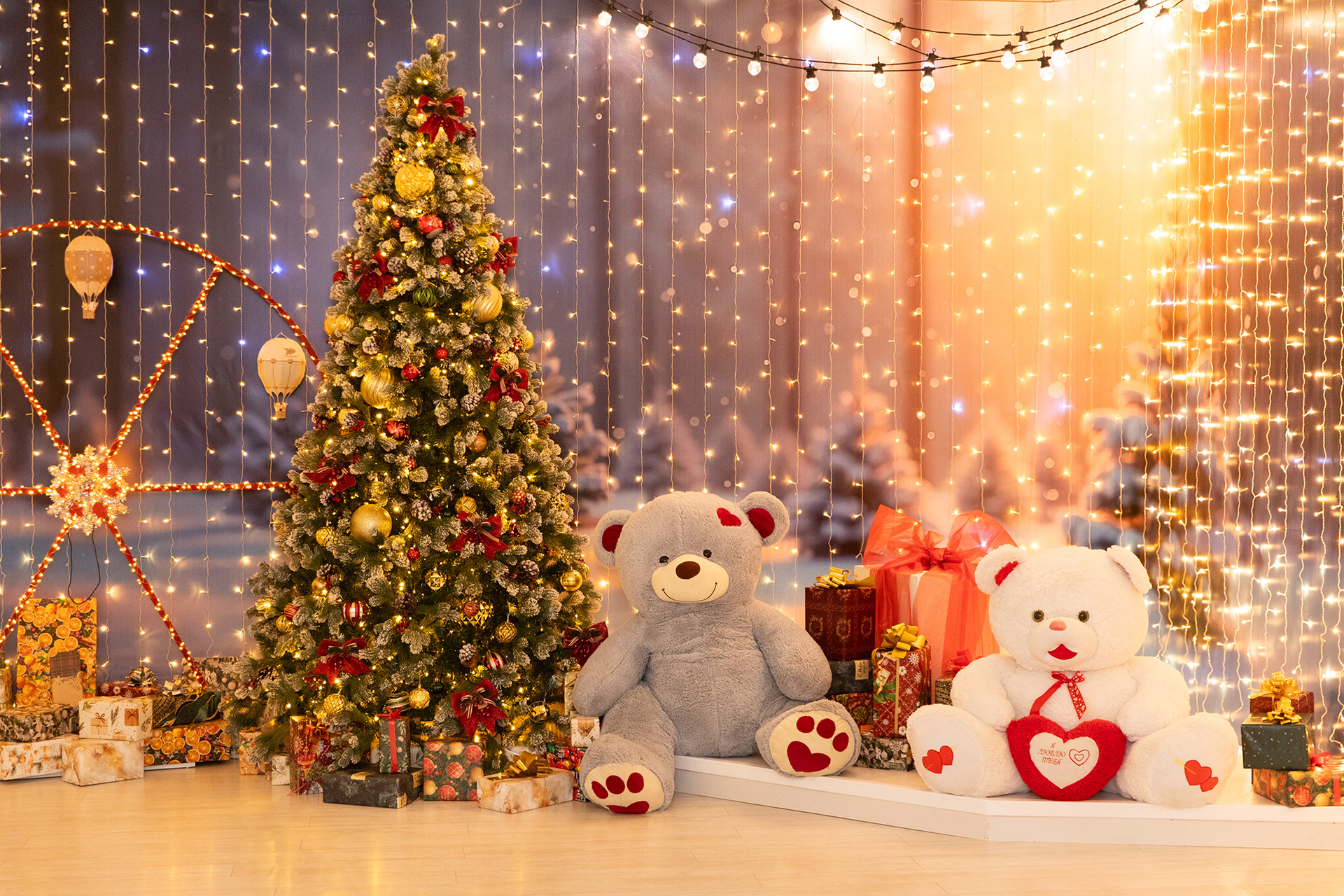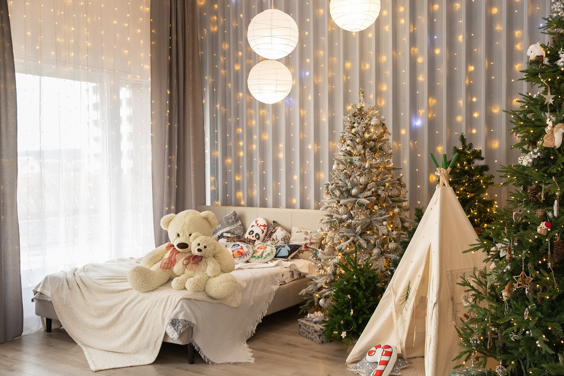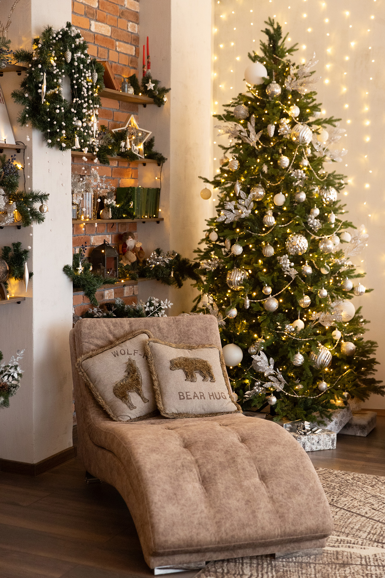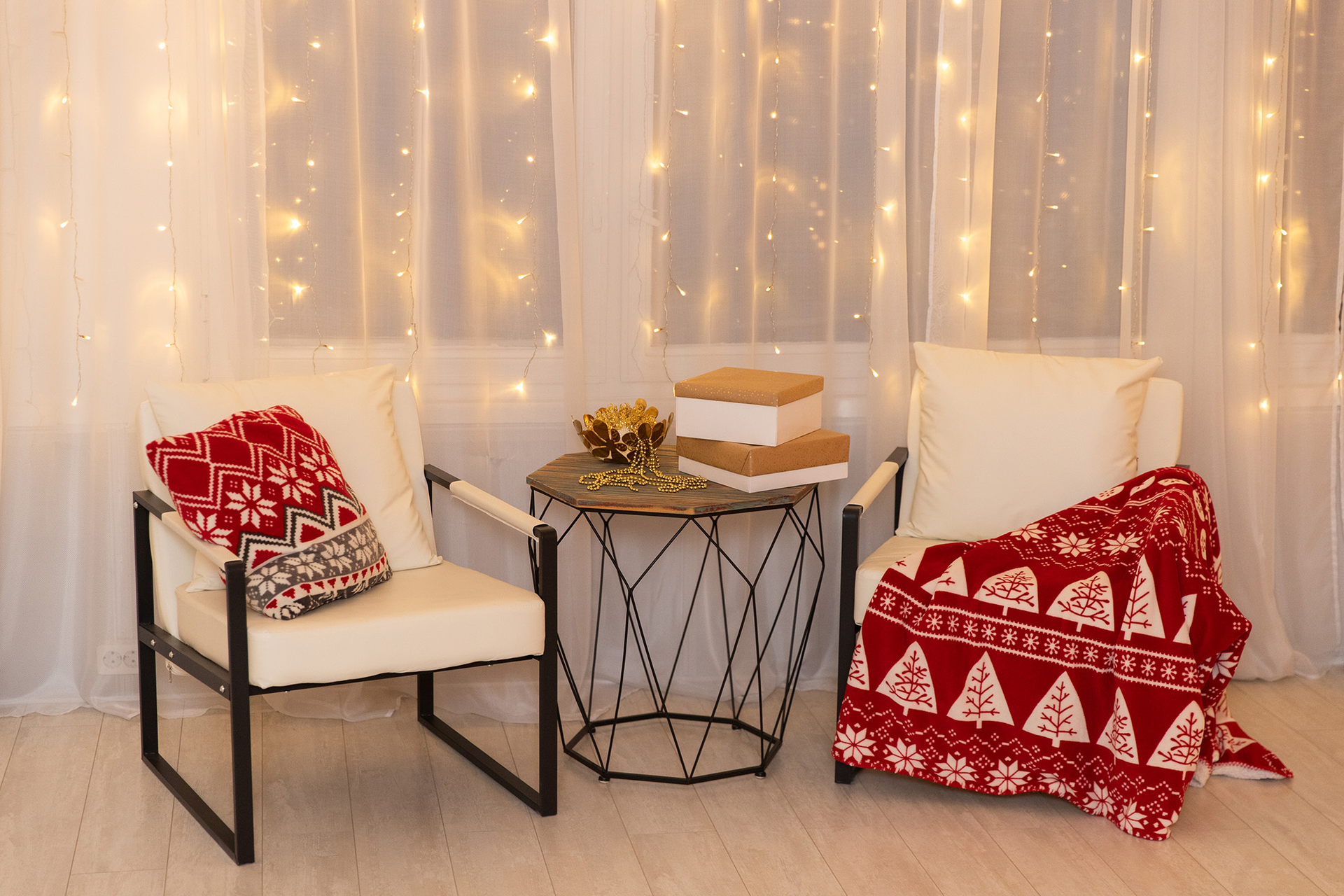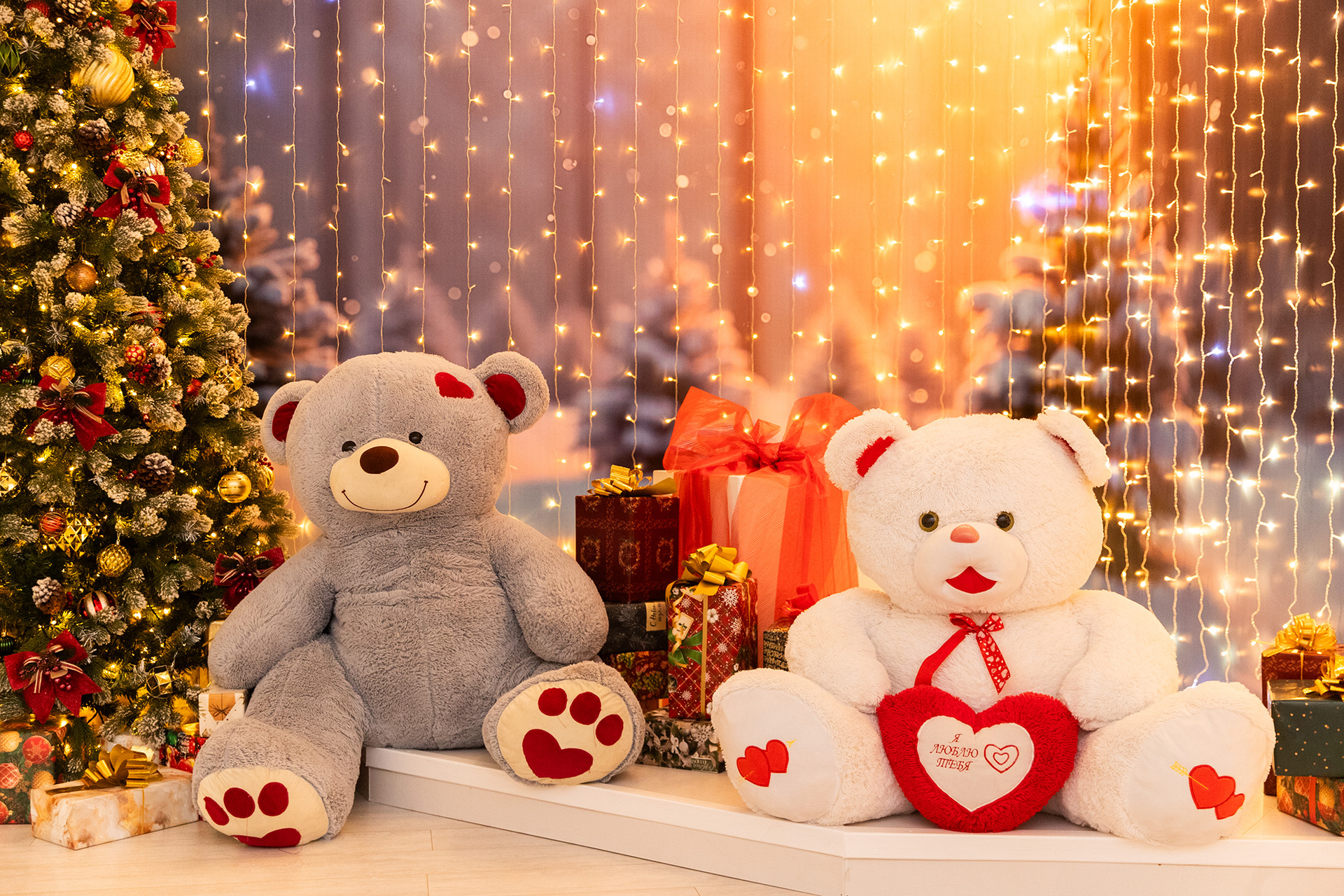 В зале имеется кровать (160×200), 2 больших дивана, кушетка, темно-коричневое кресло, и мишки. Много подушек и пледов создают уютную домашнюю атмосферу. Обилие мелкого декора на полках и комоде, и огромное количество декоративного освещения