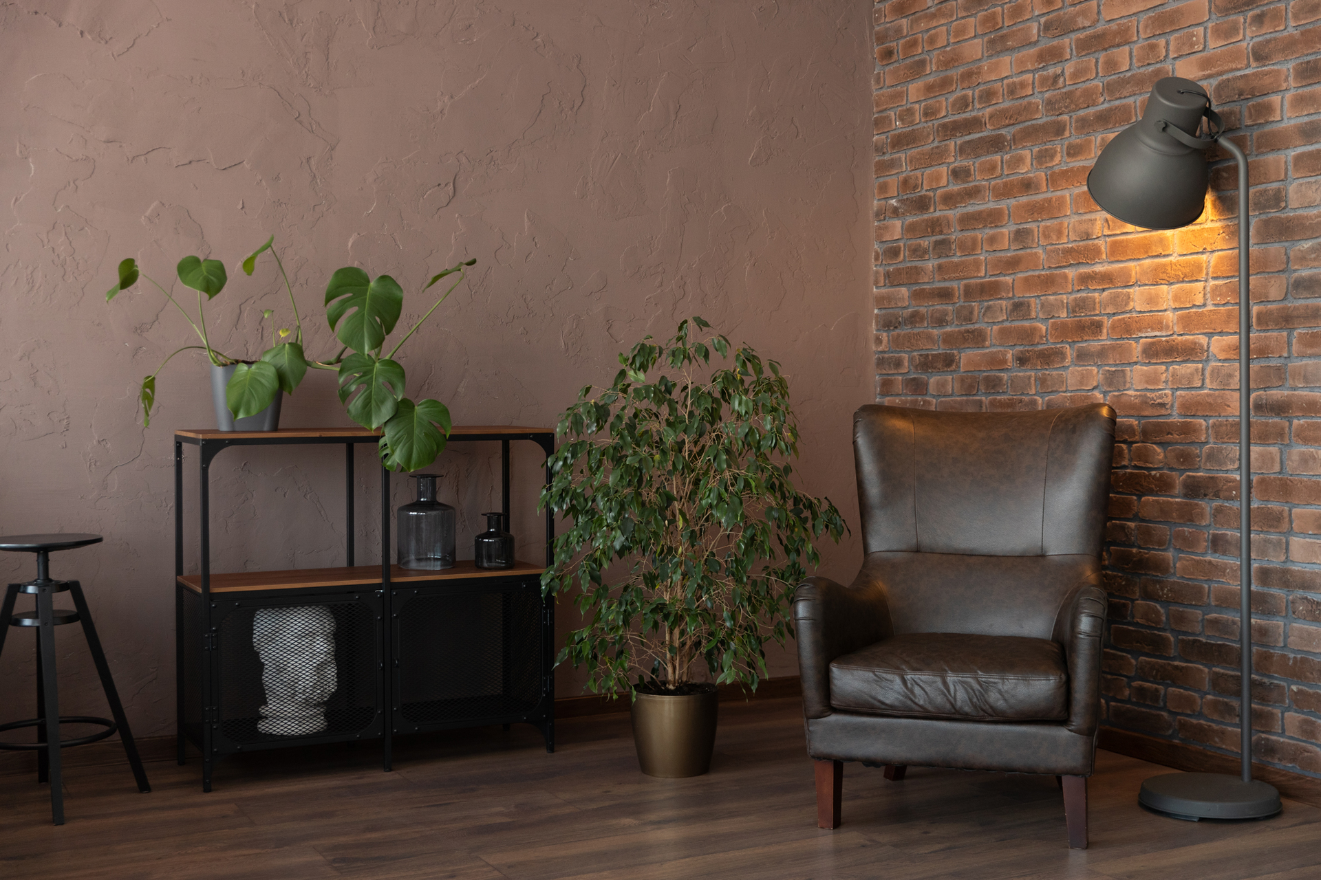 Зал выполнен в темных тонах. Стены отделаны декоративной штукатуркой и декоративным кирпичом.