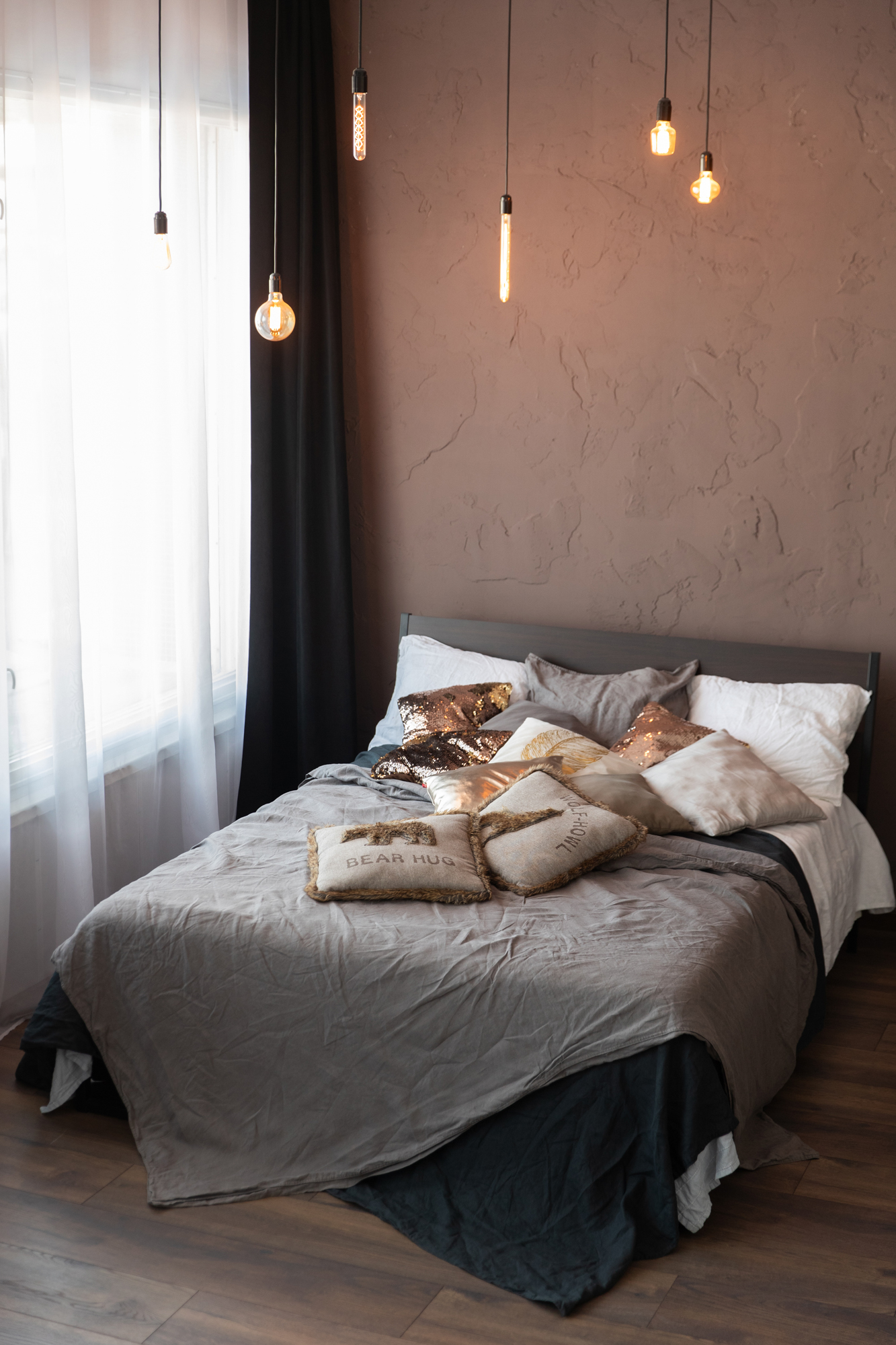 - Кровать с пледиками и большим количеством мягких подушечек