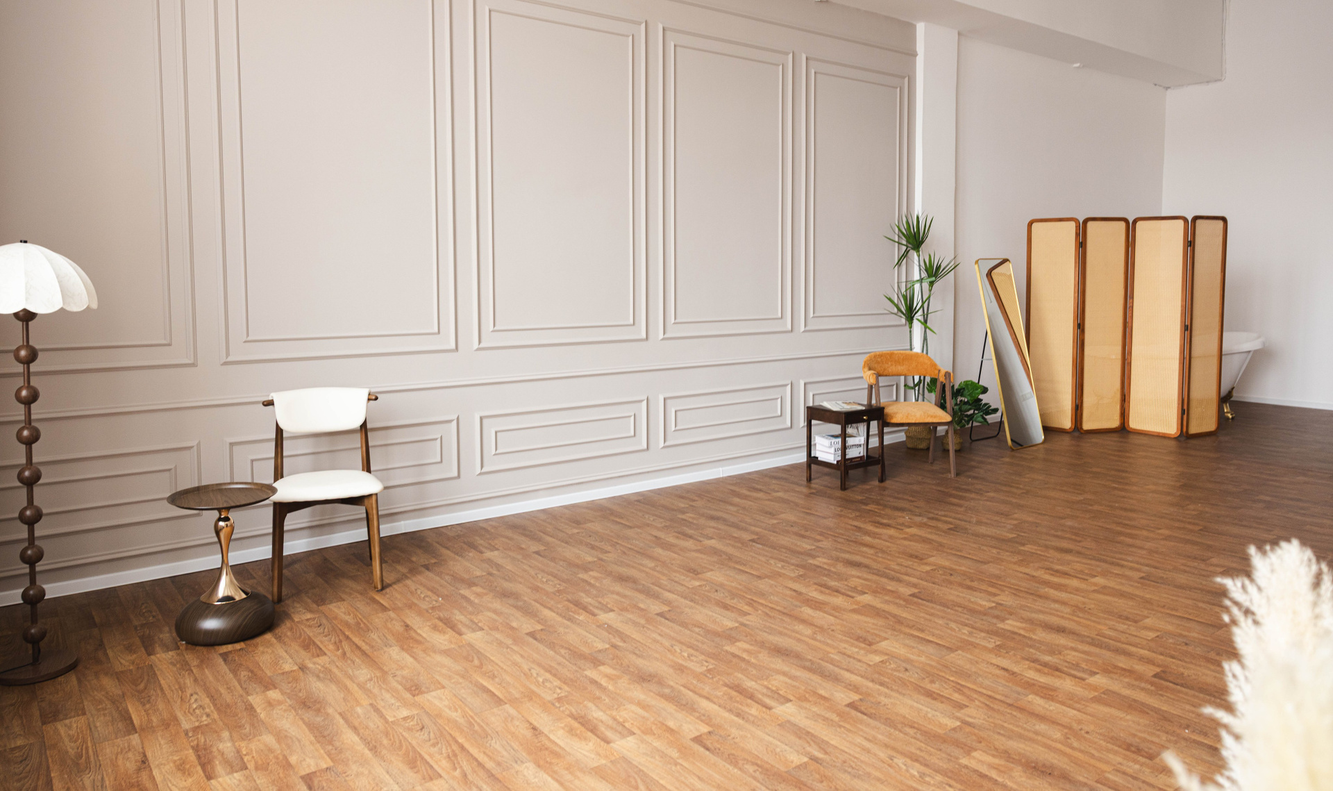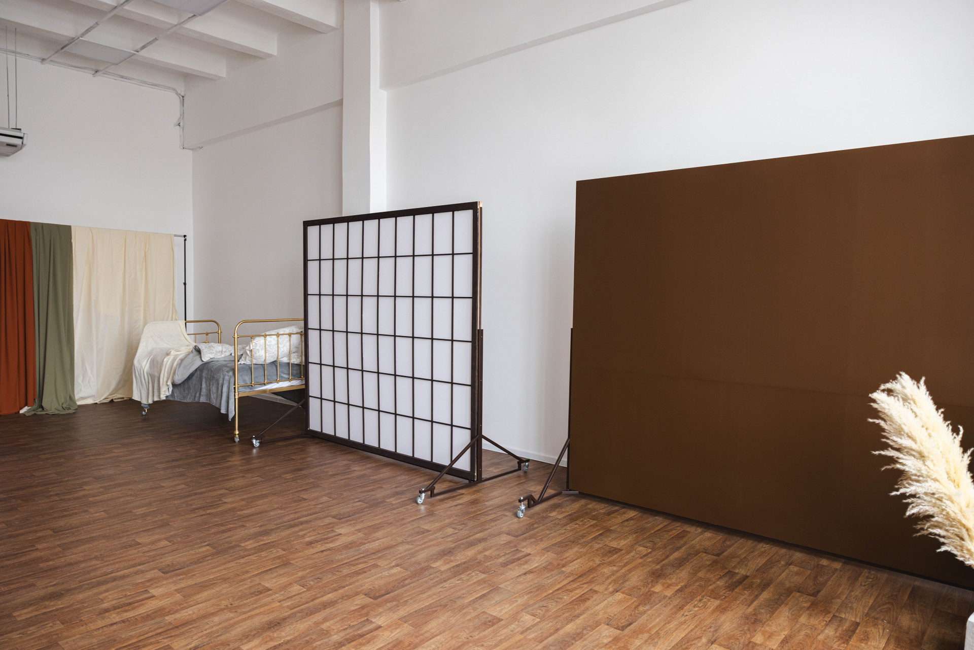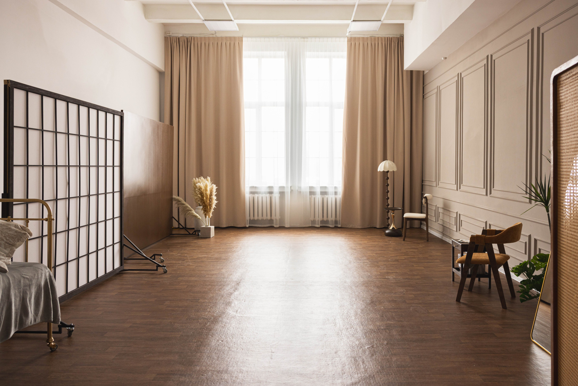 Зал наполнен базовой мебелью и ширмами, которые создают глубину кадра, но не перетягивают внимание на себя.
