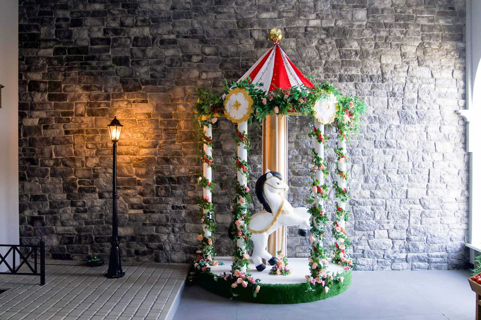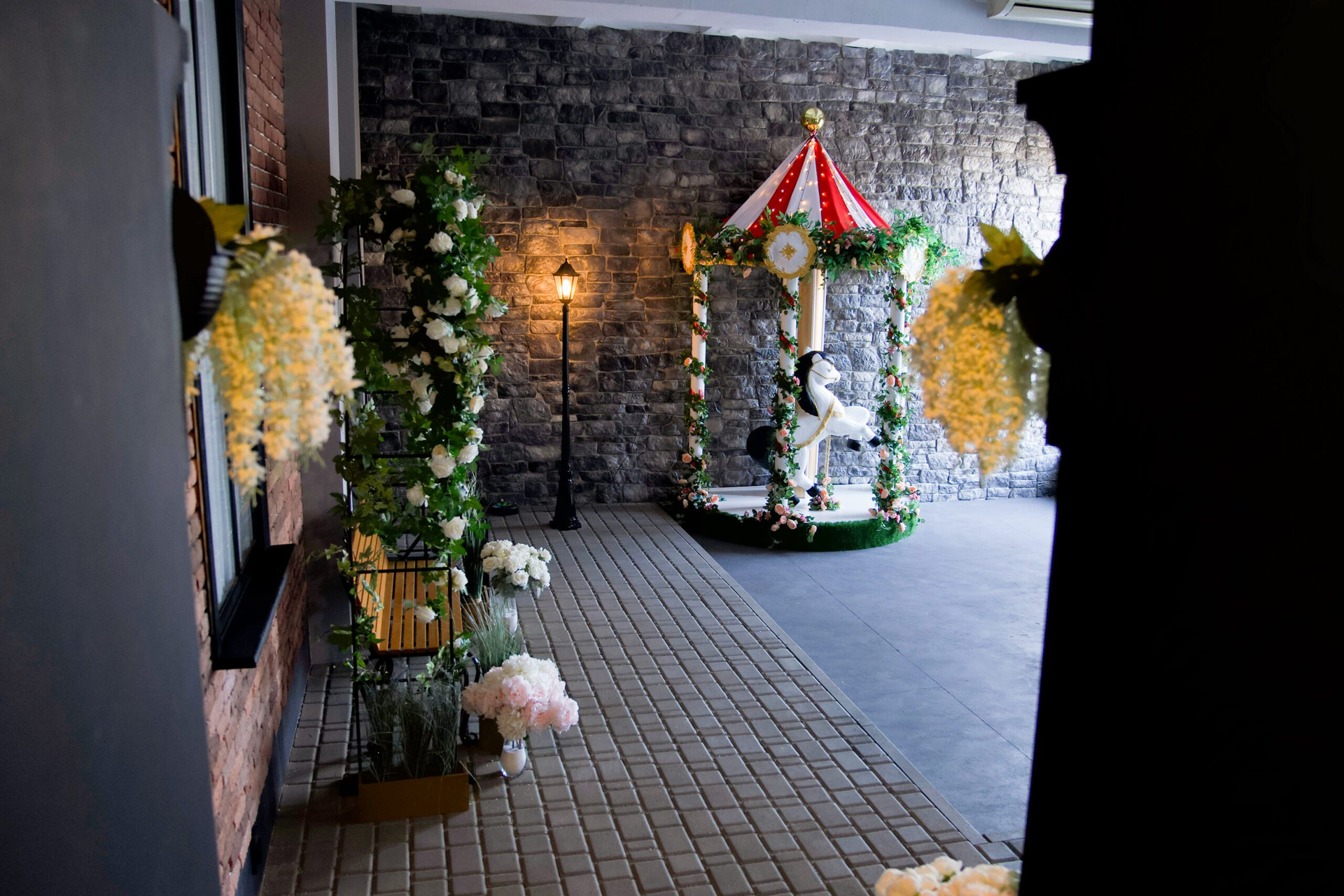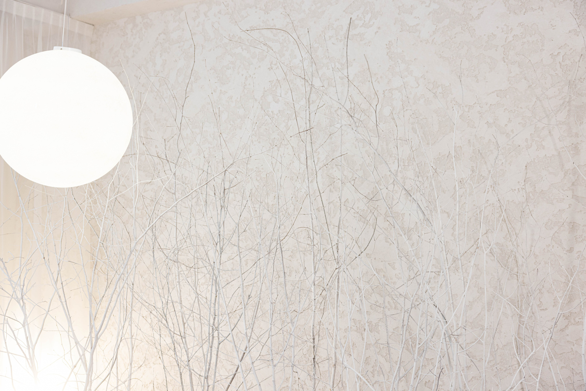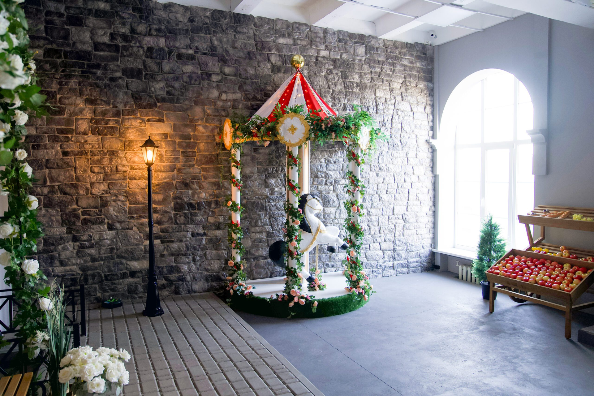 Лёгкие вуали спускаются с потолка, словно туман на рассвете, а огромные цветы и экзотические торшеры-попугаи добавляют нотку фантазии. Пуф-камень приглашает присесть, садовые RGB-шары переливаются всеми оттенками, а фанерные деревья создают иллюзию прогулки в волшебном лесу.