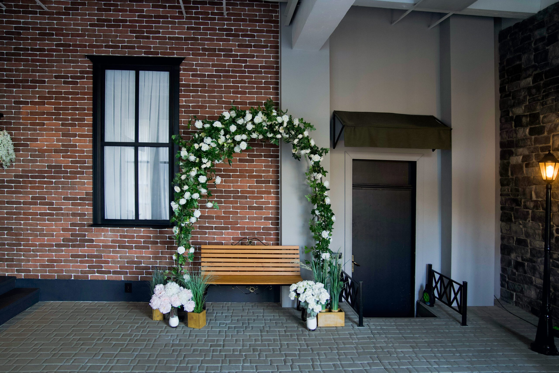 - Цветочная зона с арками из роз на фоне обвитой плющом стены.