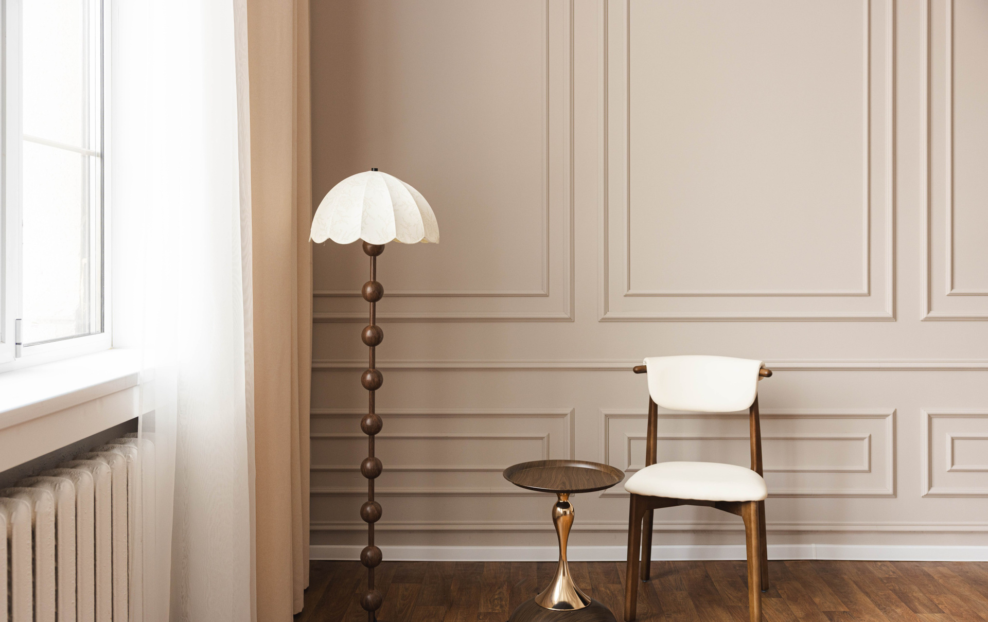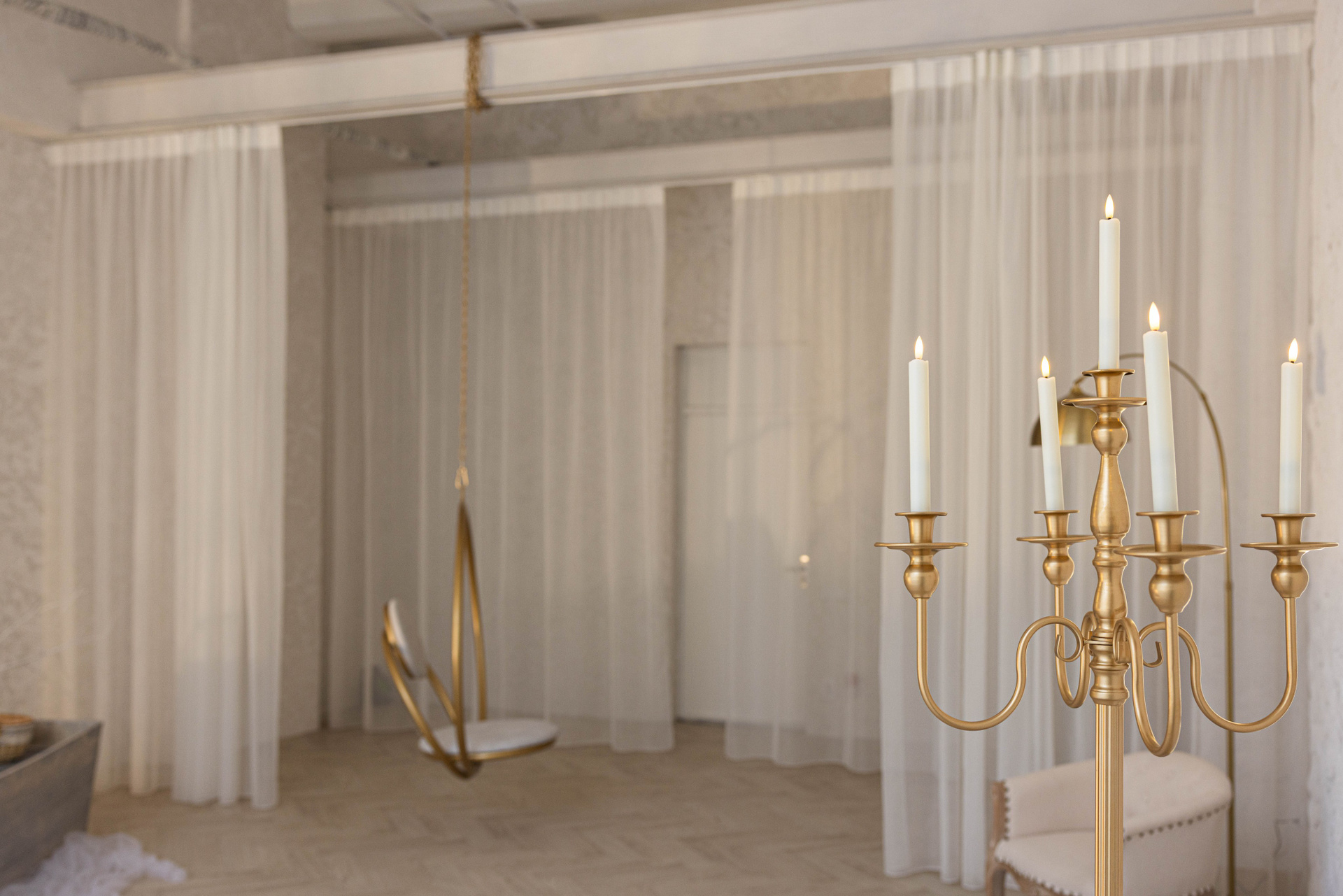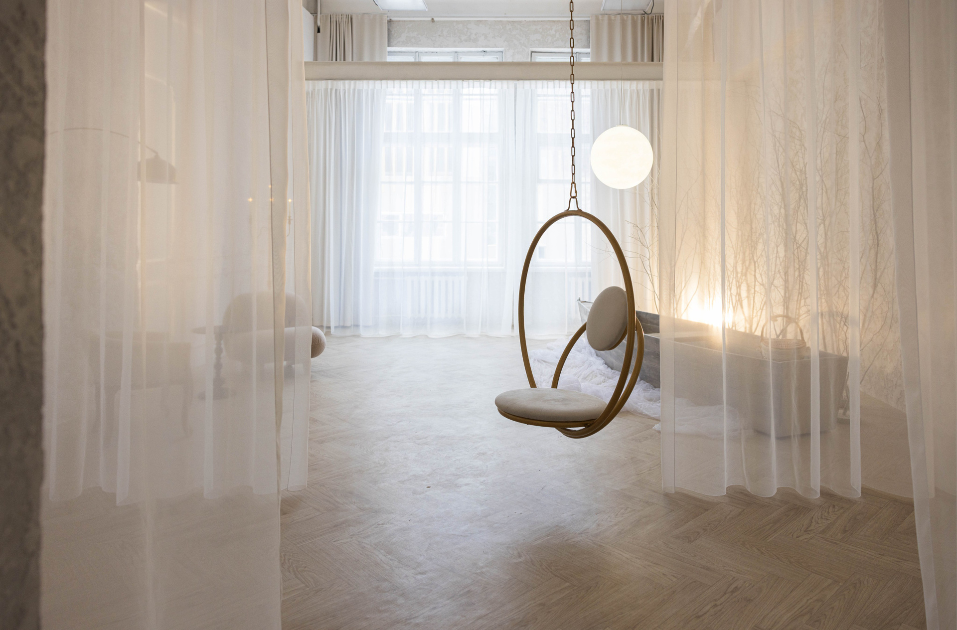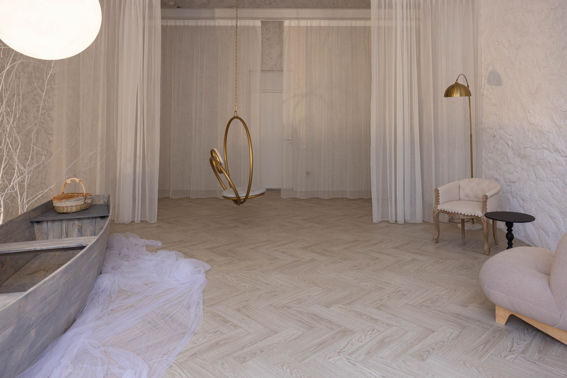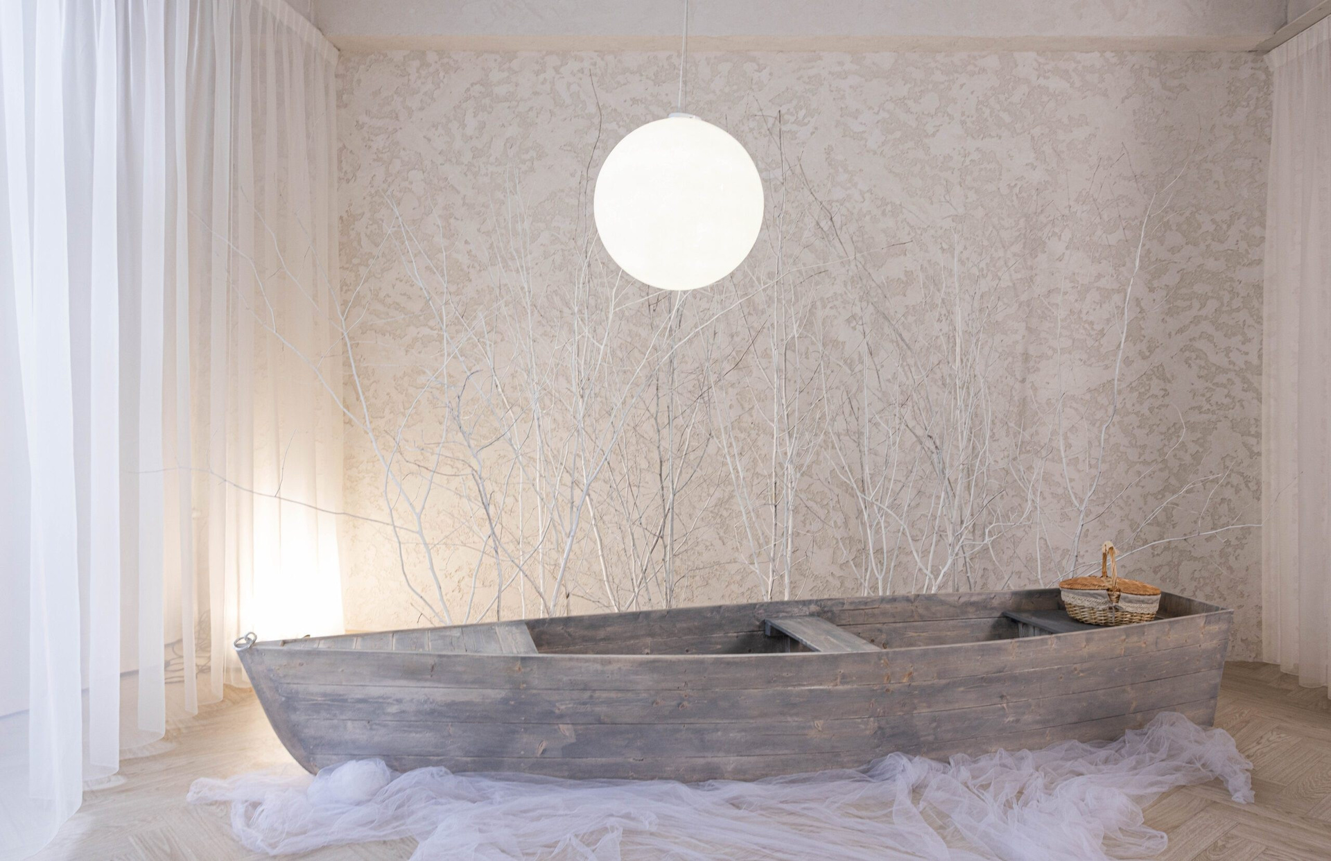 Теллур — это пространство про тишину, свет и глубину. Здесь много воздуха, текстиля и мягких оттенков. А лодка — как акцент.