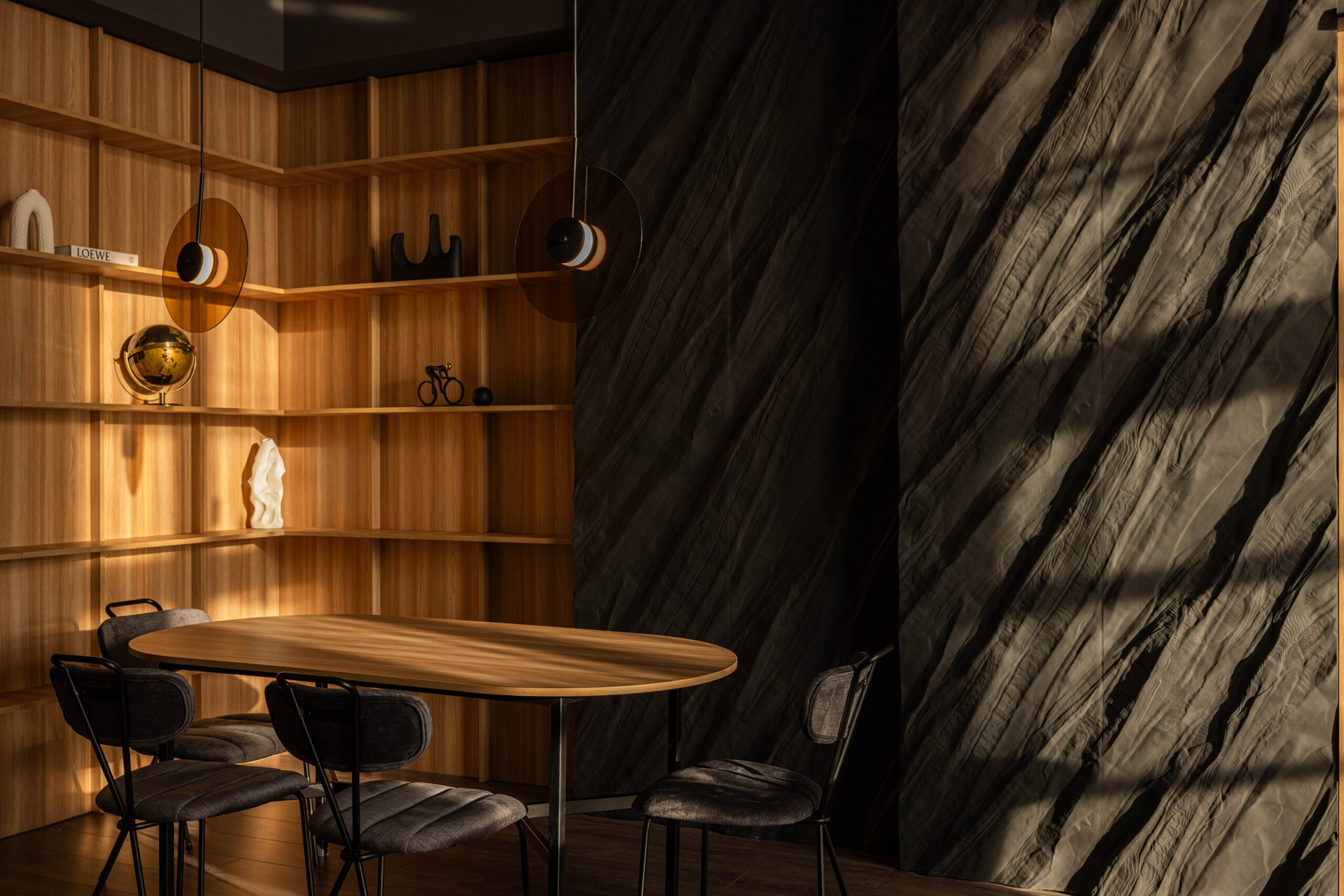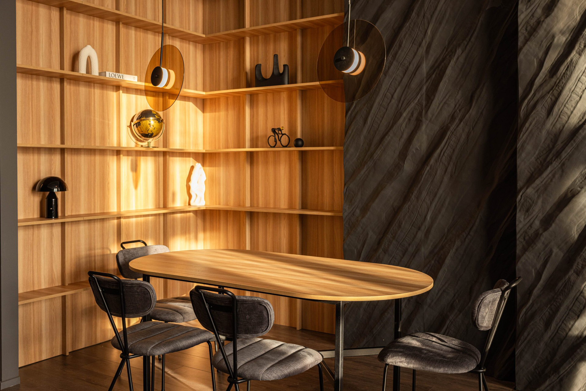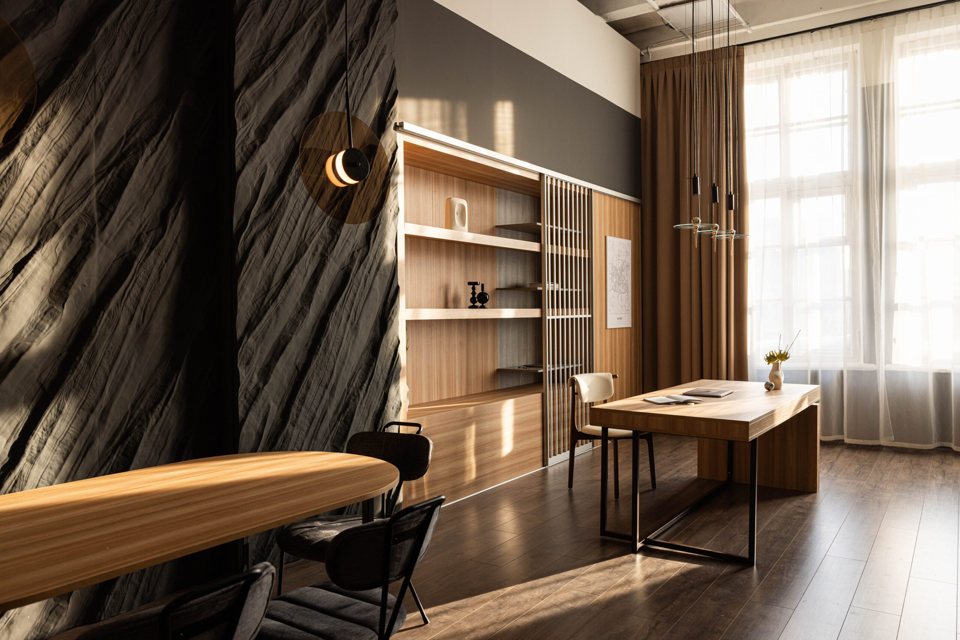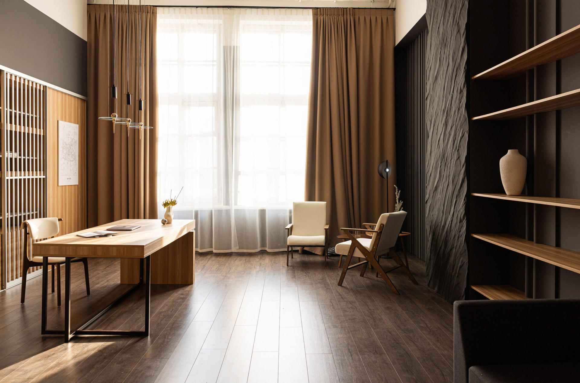 Текстурные стены добавляют глубины кадру, мебель тёплых оттенков смягчает тёмную палитру, а стеллажи и продуманный декор создают ощущение пространства, в котором удобно работать долго.
