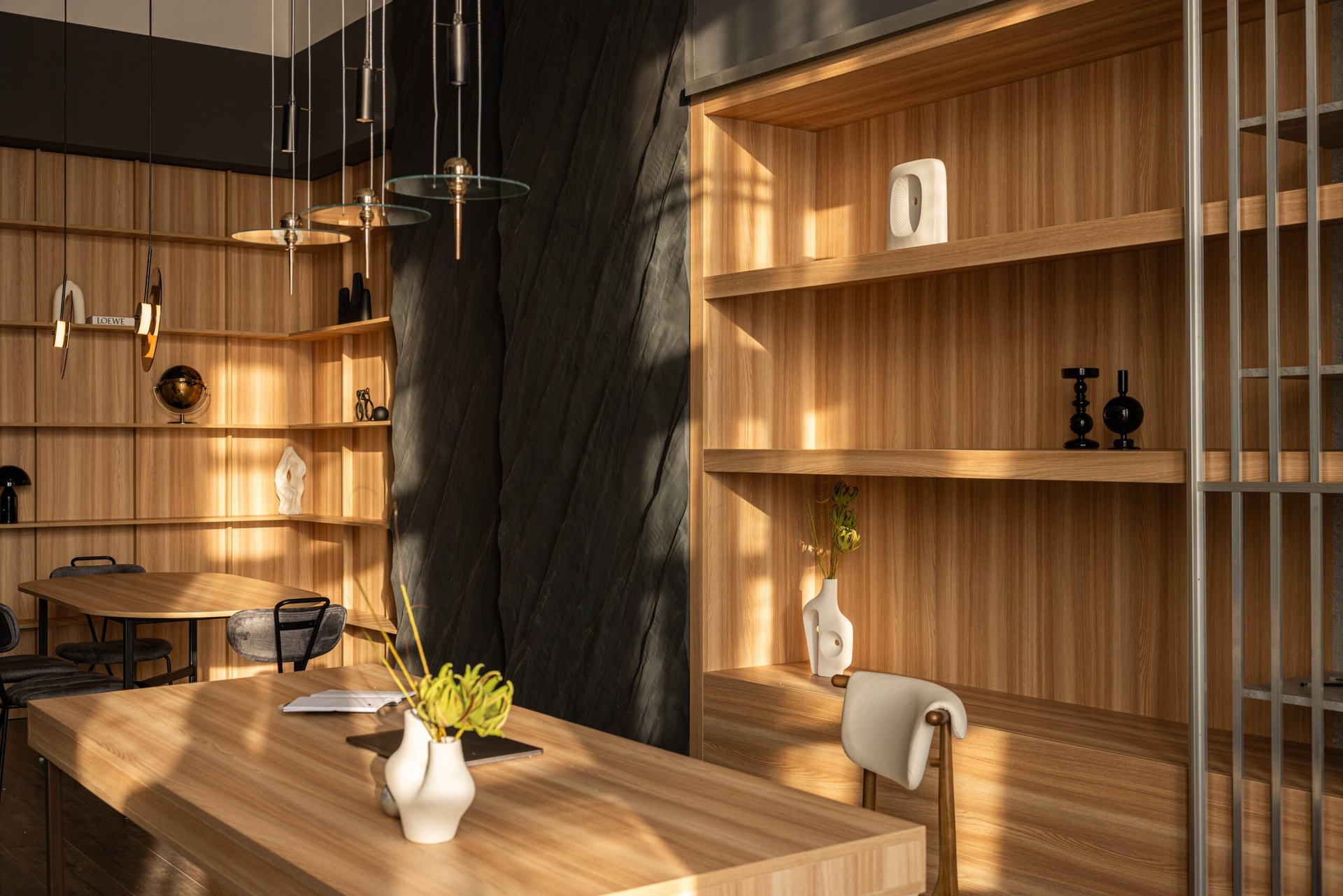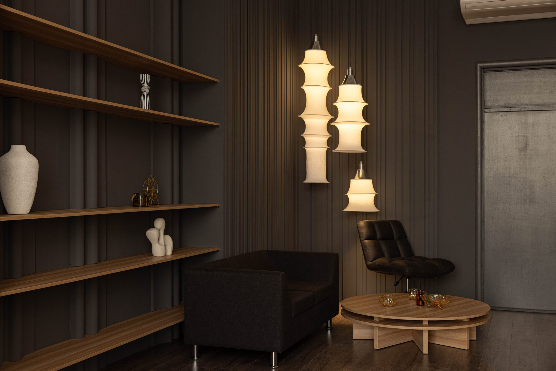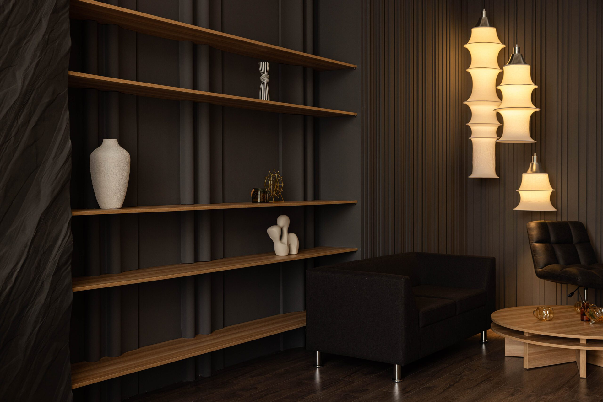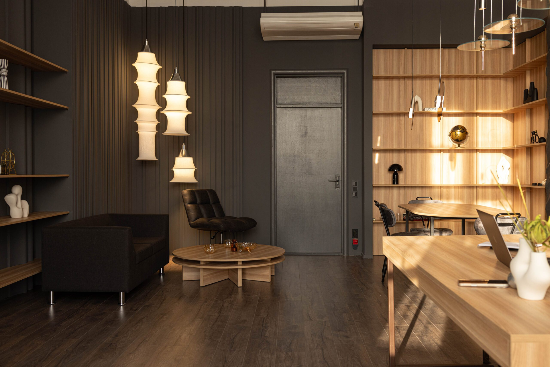 Текстурные стены добавляют глубины кадру, мебель тёплых оттенков смягчает тёмную палитру, а стеллажи и продуманный декор создают ощущение пространства, в котором удобно работать долго.