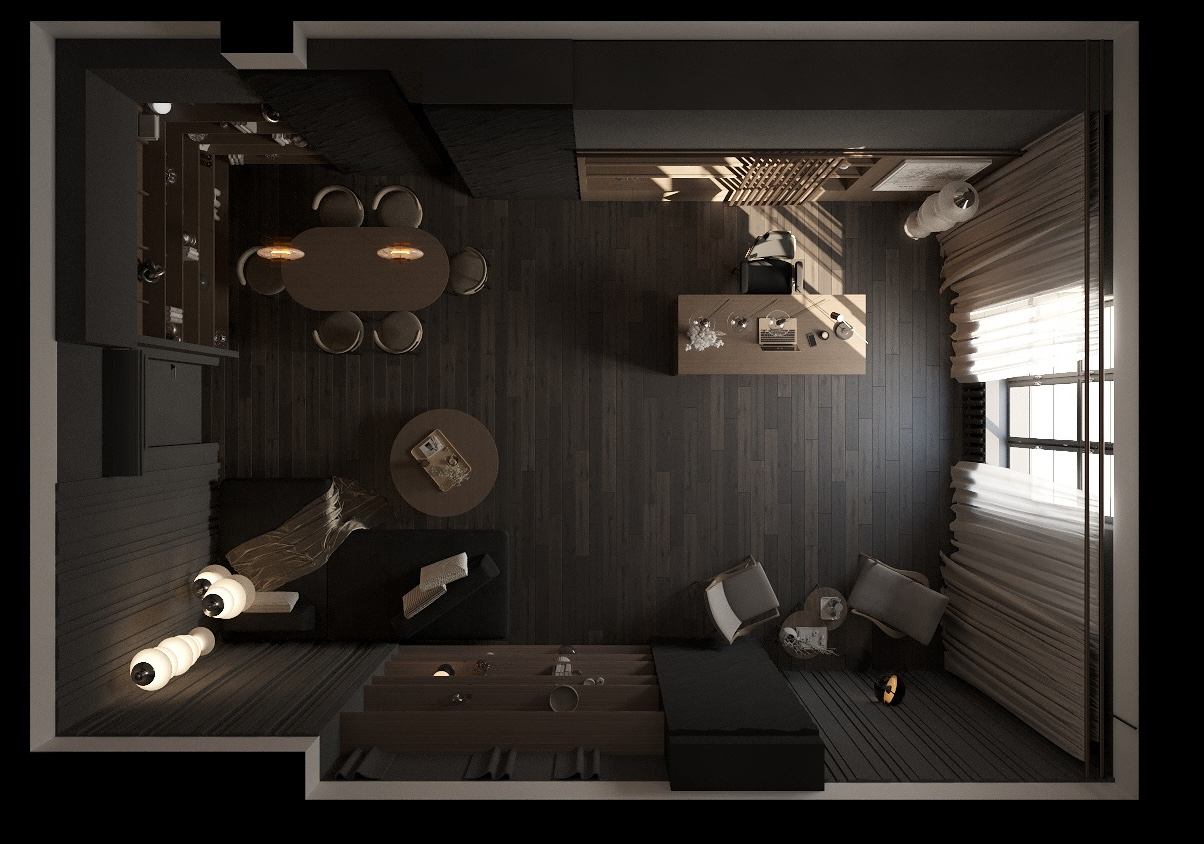 - Естественное освещение — большое панорамное окно.