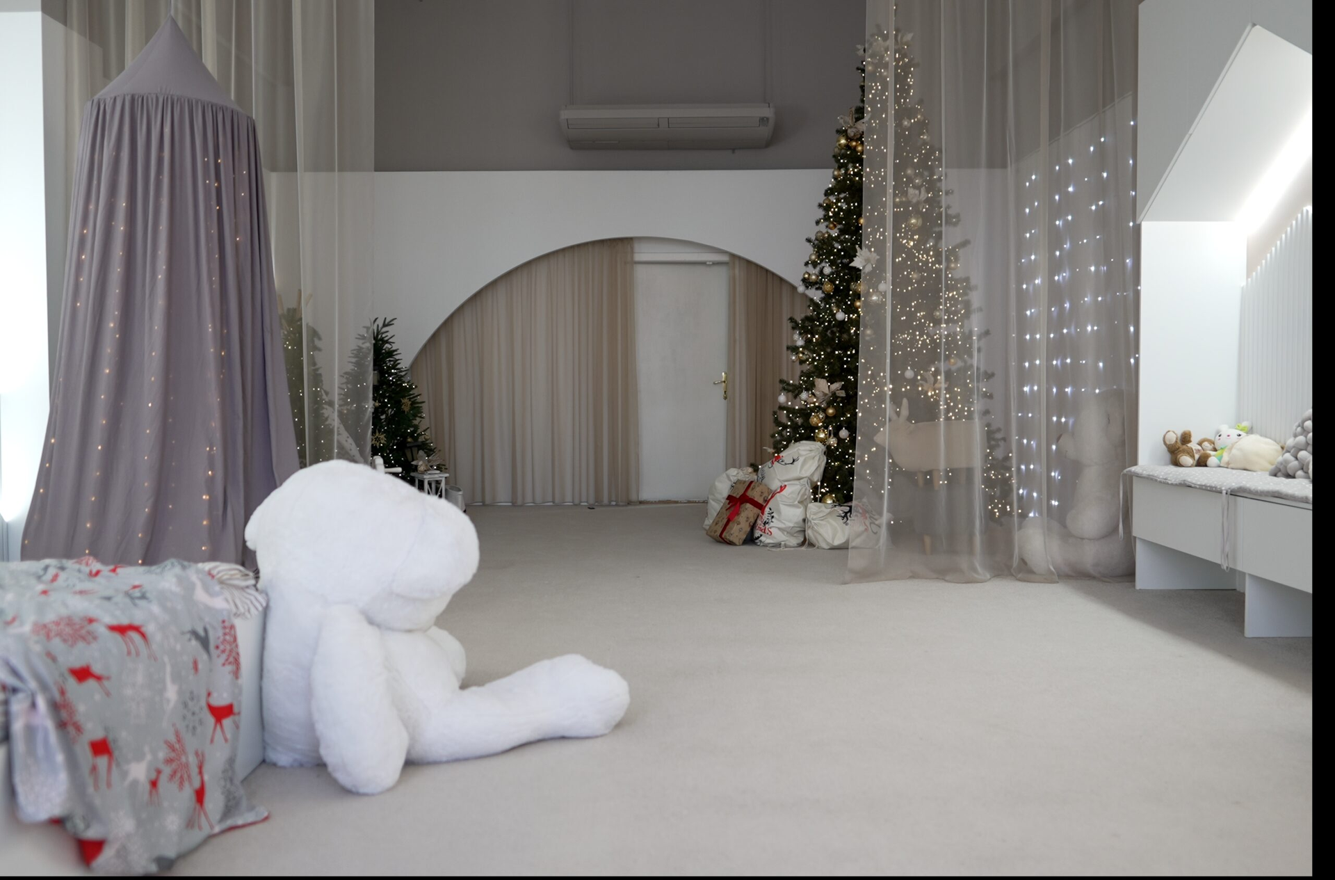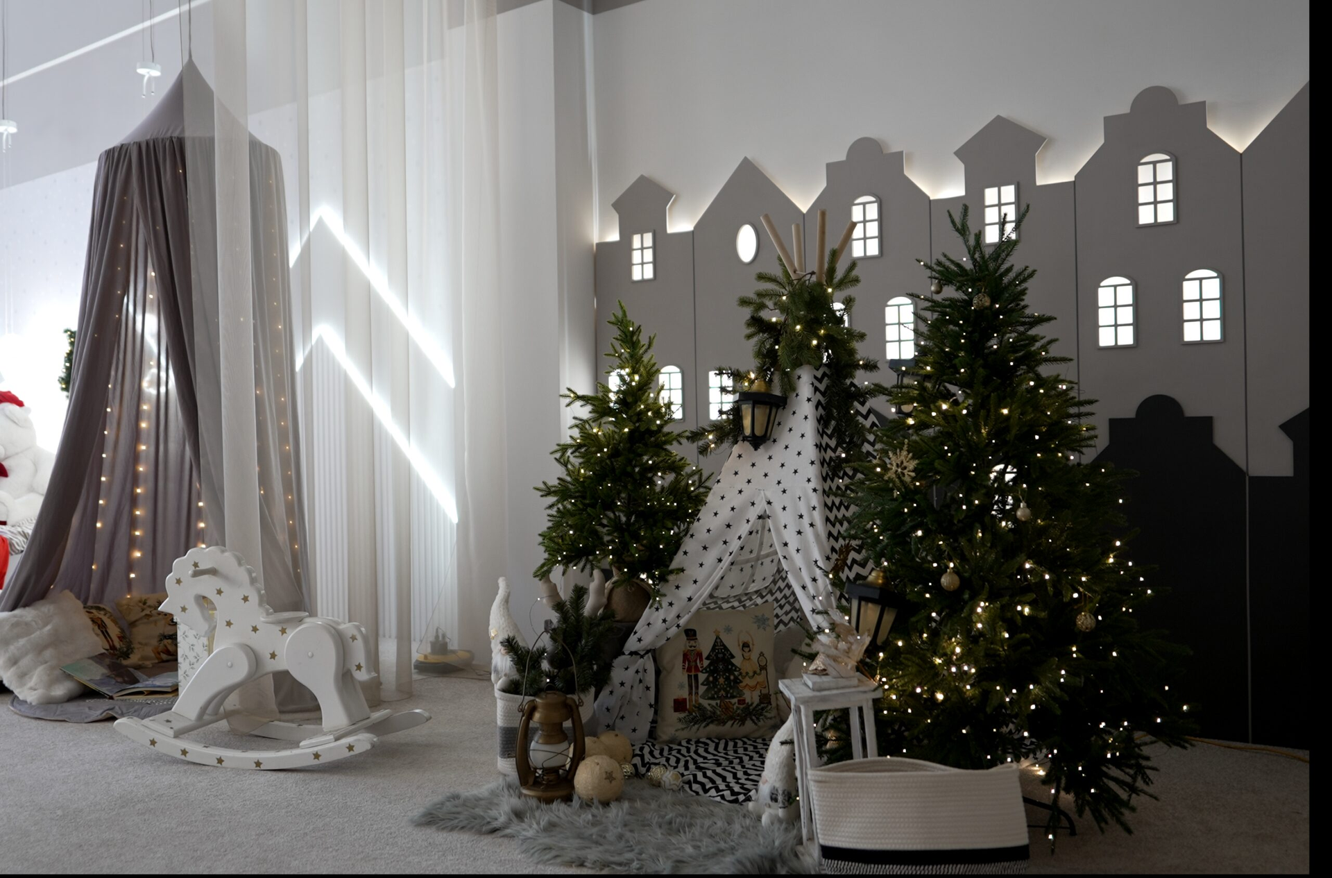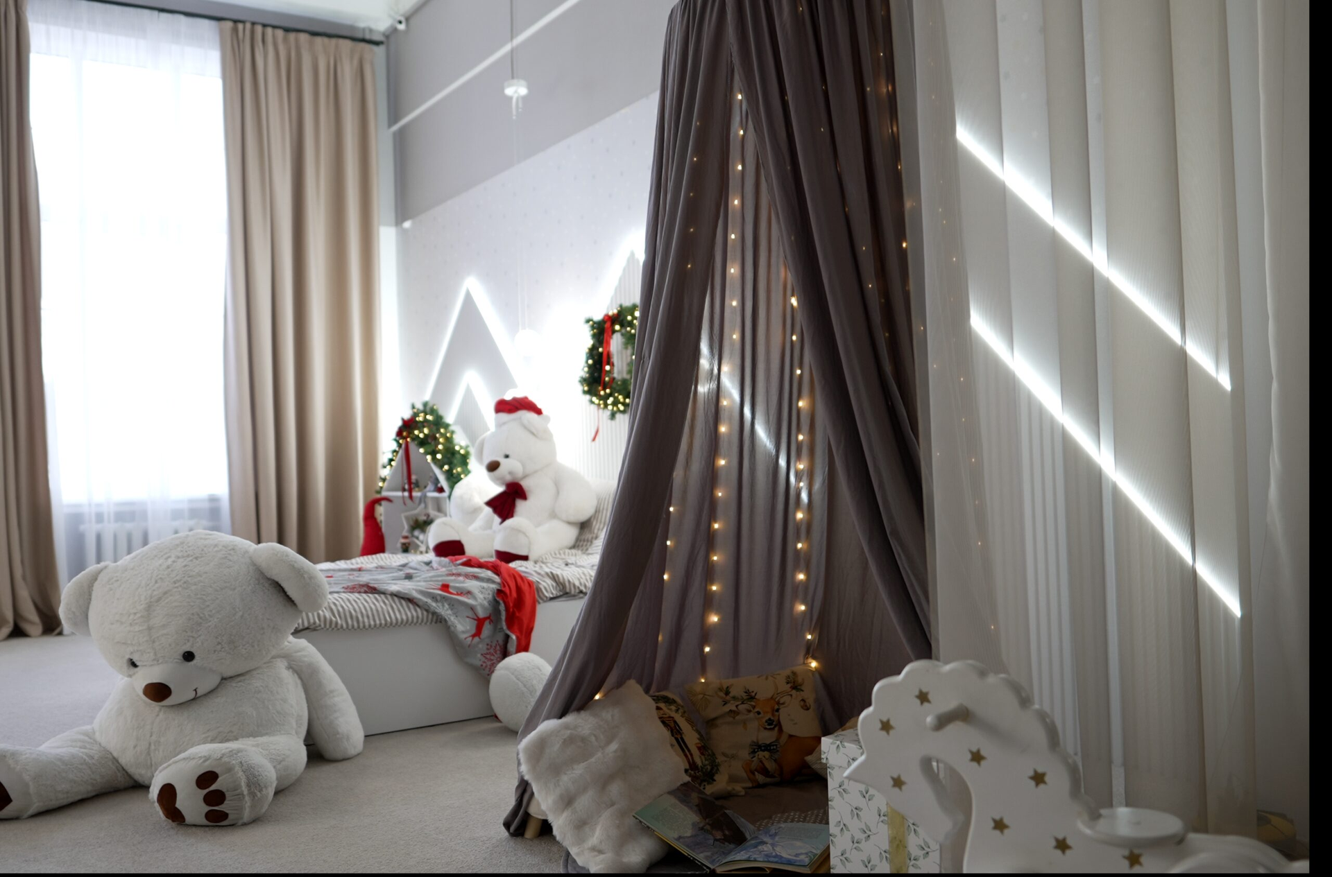- Зона с кроватью, вигвамом и уютным балдахином