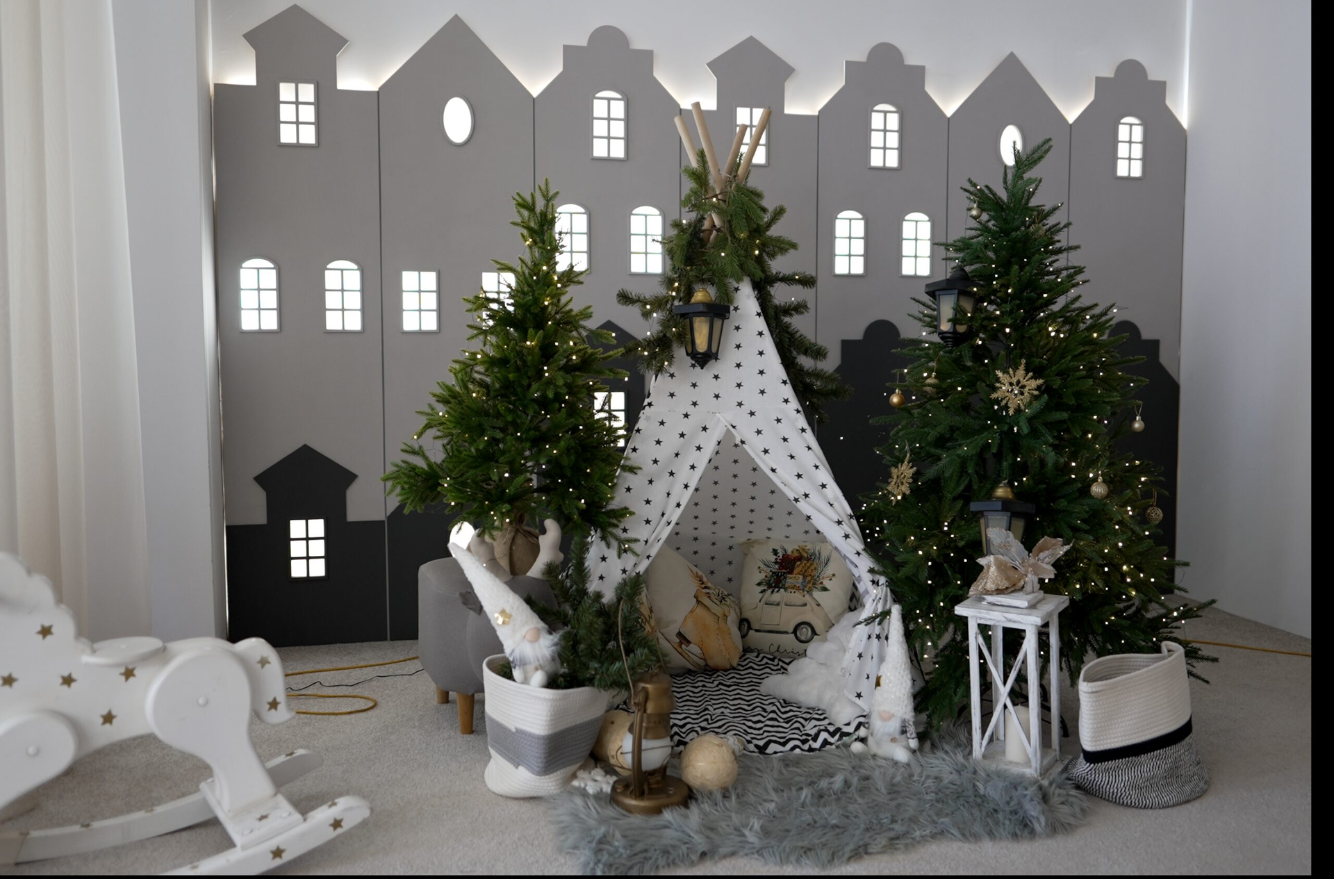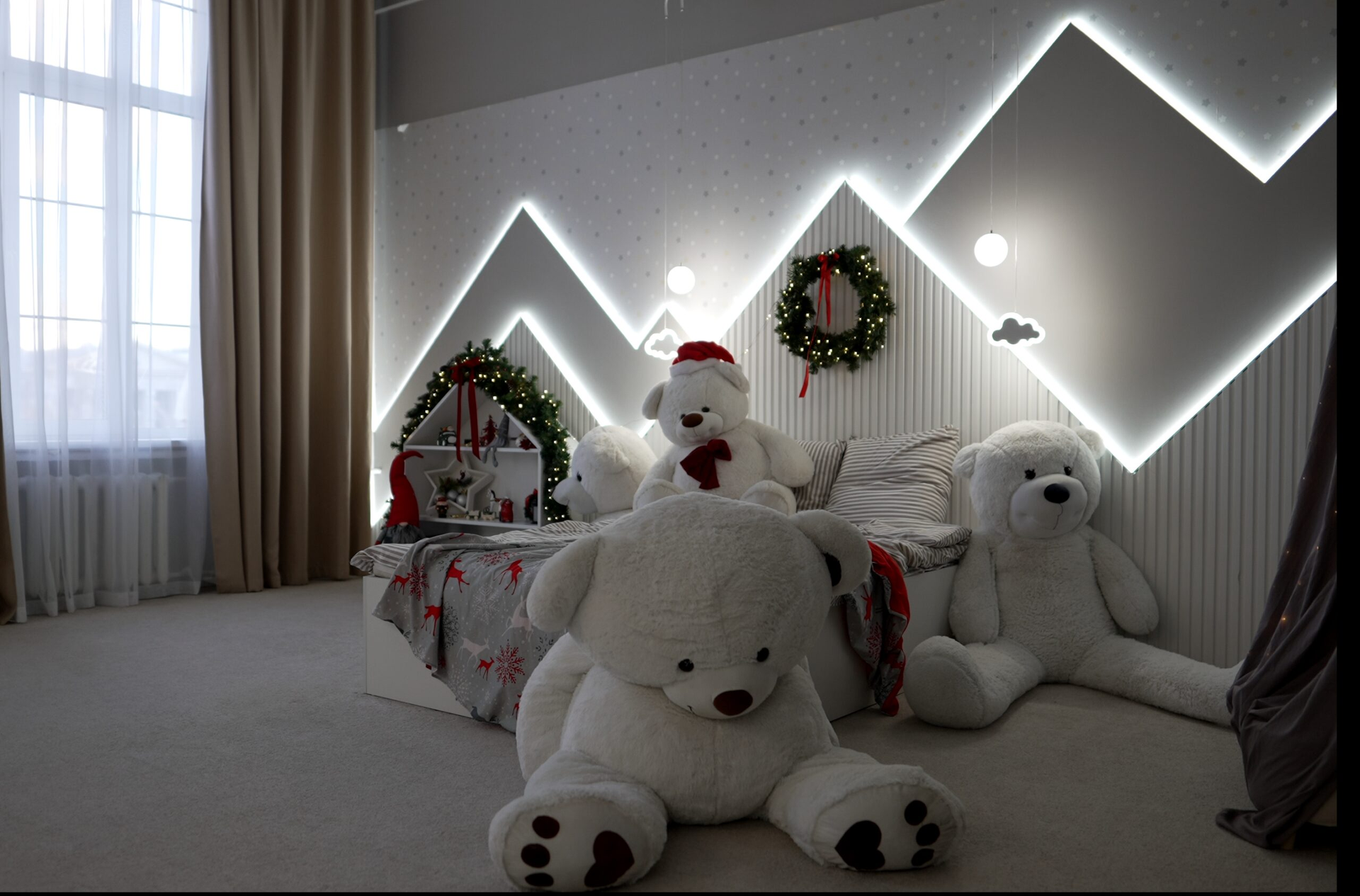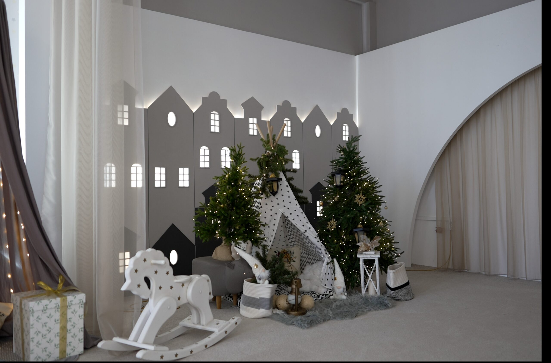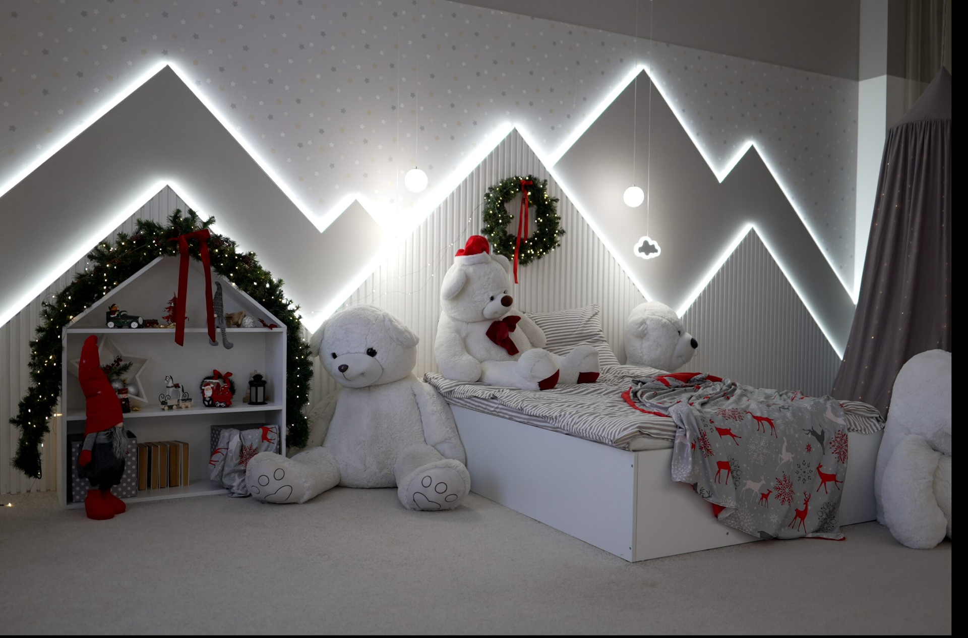 - Большое количество сценариев света — скрытая подсветка по стенам, светящиеся домики, необычные светильники и люстры.