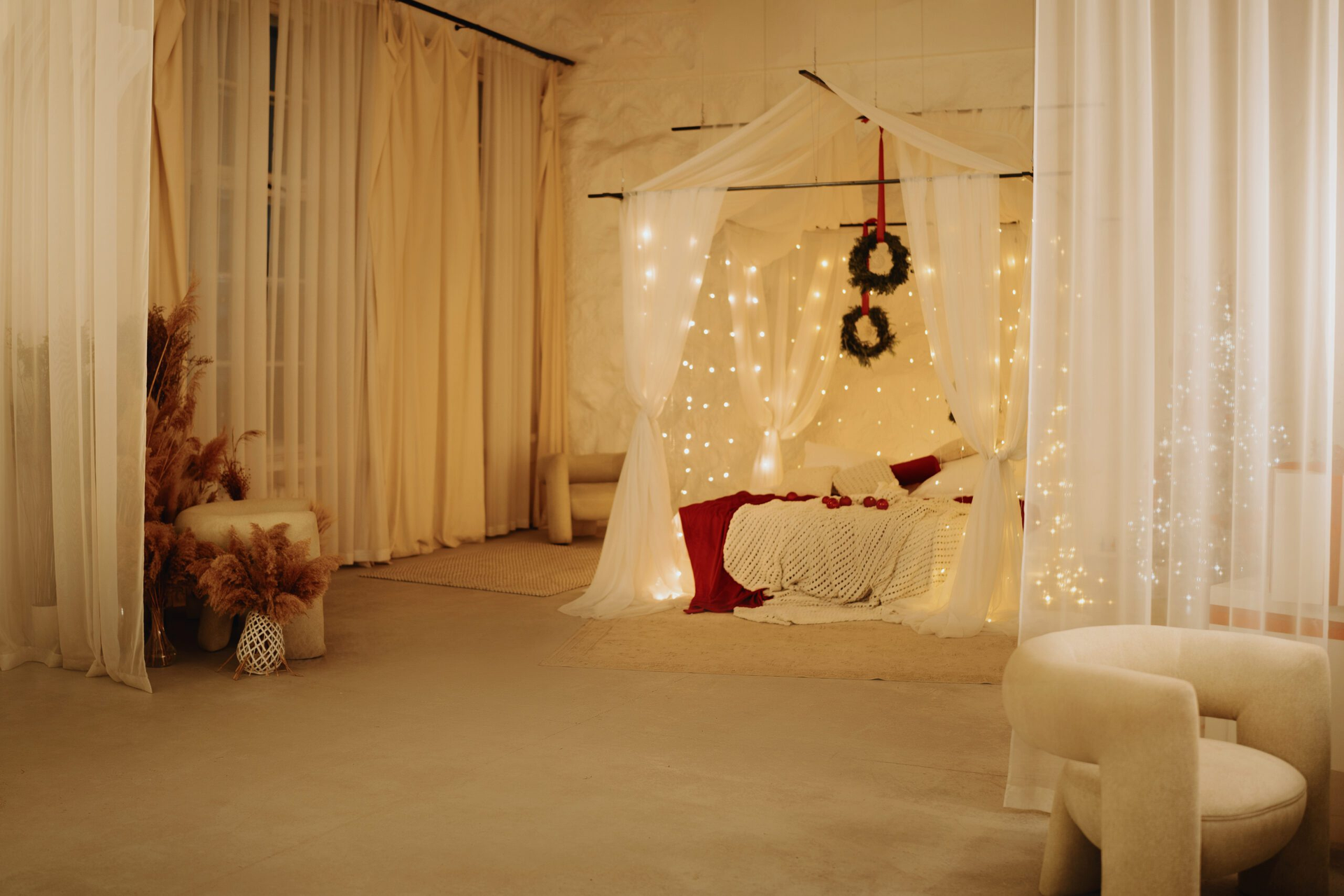 Мебель сделана на заказ, специально для нашего проекта. Действующая ванна на подиуме около окна. Декоративный камин со свечами. Кровать King-Size с воздушным балдахином.