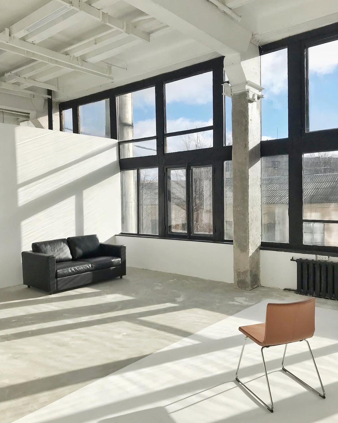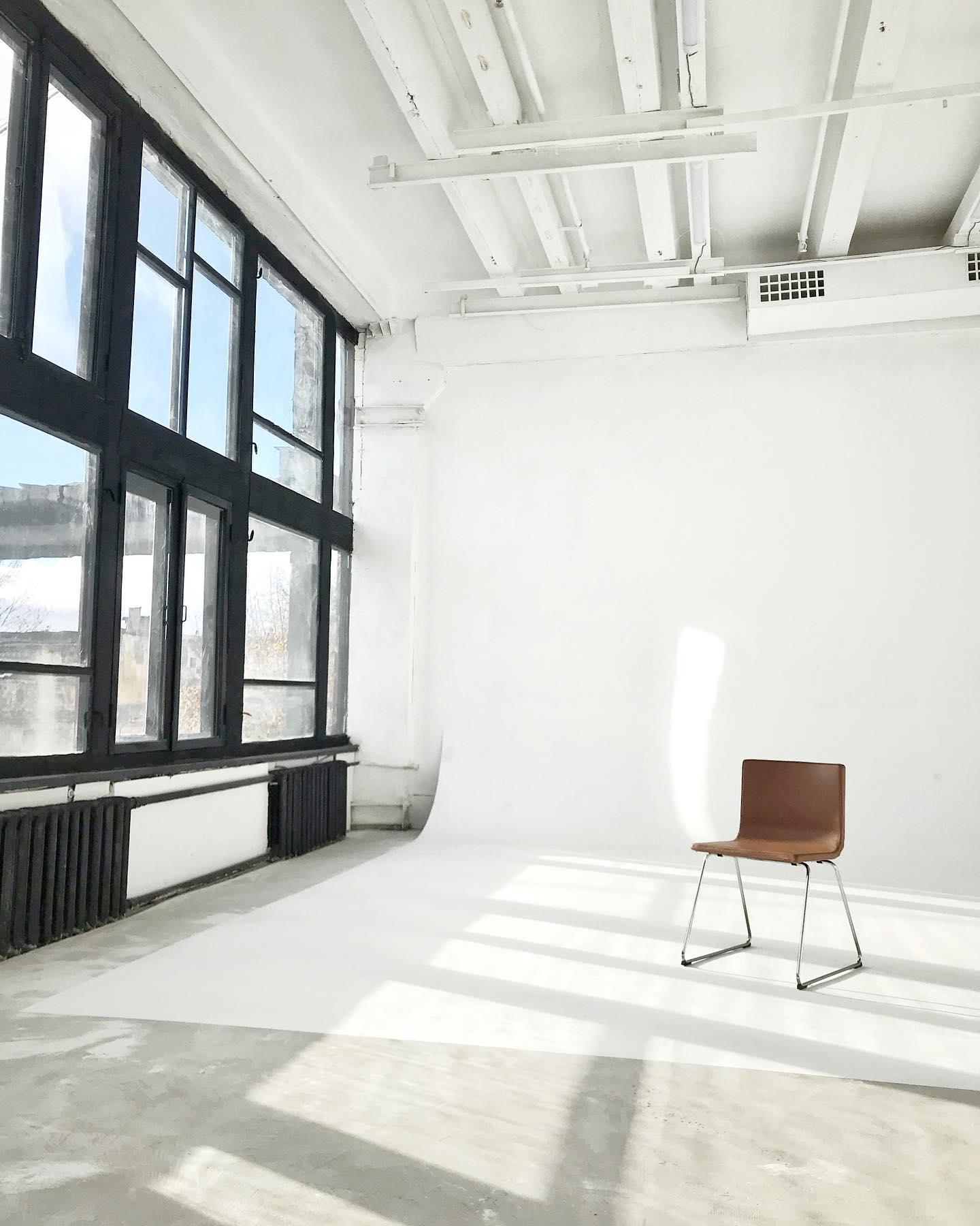 Светлый зал площадью 70 кв. м. с циклорамой, большими окнами и белыми стенами.