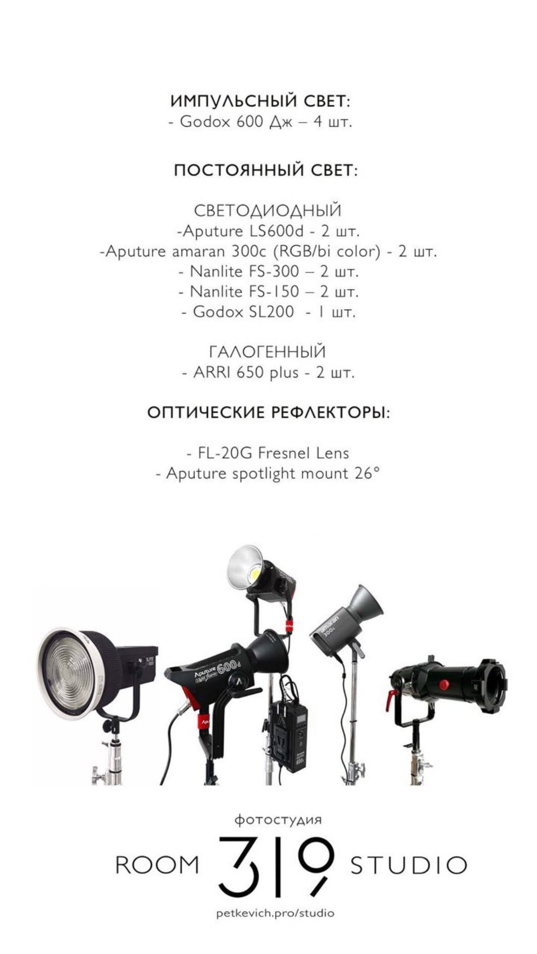 Постоянные источники Amaran 300c (rgb/bicolor) — 2шт., Nanlite fs300 — 2ш., Godoz s/200ii — 1 шт.